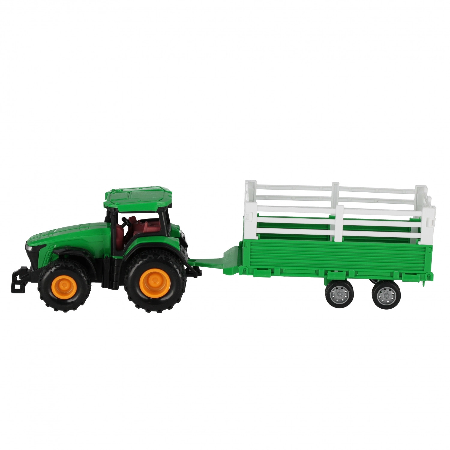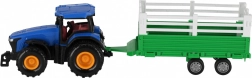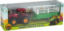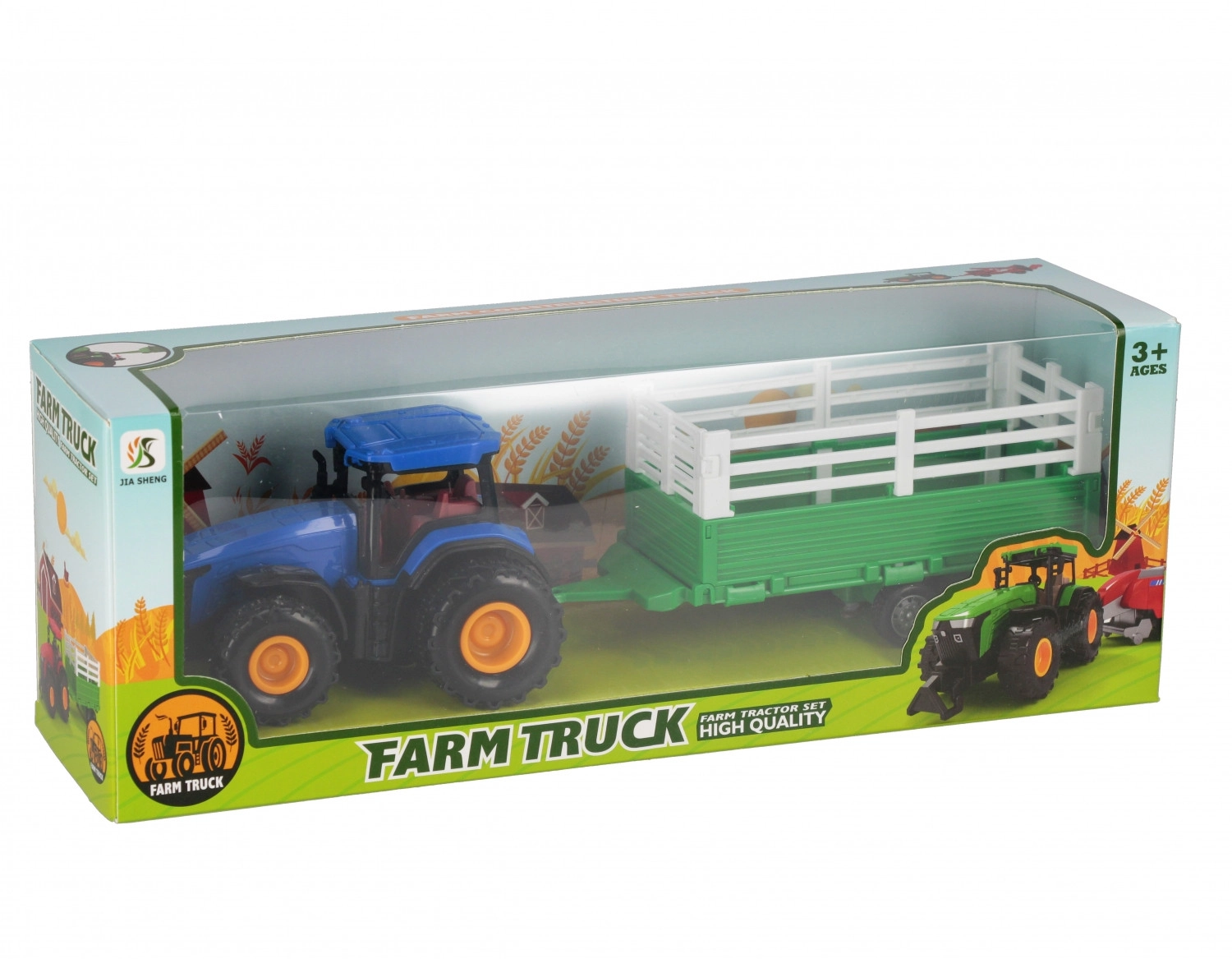 Set agricol distractiv pentru micii șoferi – tractor cu remorcă detașabilă și funcție pull-back. Doar trage înapoi și tractorul pornește singur. Detalii realiste, roți care se rostogolesc și remorcă pentru transportul încărcăturii. Dimensiuni aprox. 33 × 12 × 9 cm, potrivit pentru copii de la 3 ani.