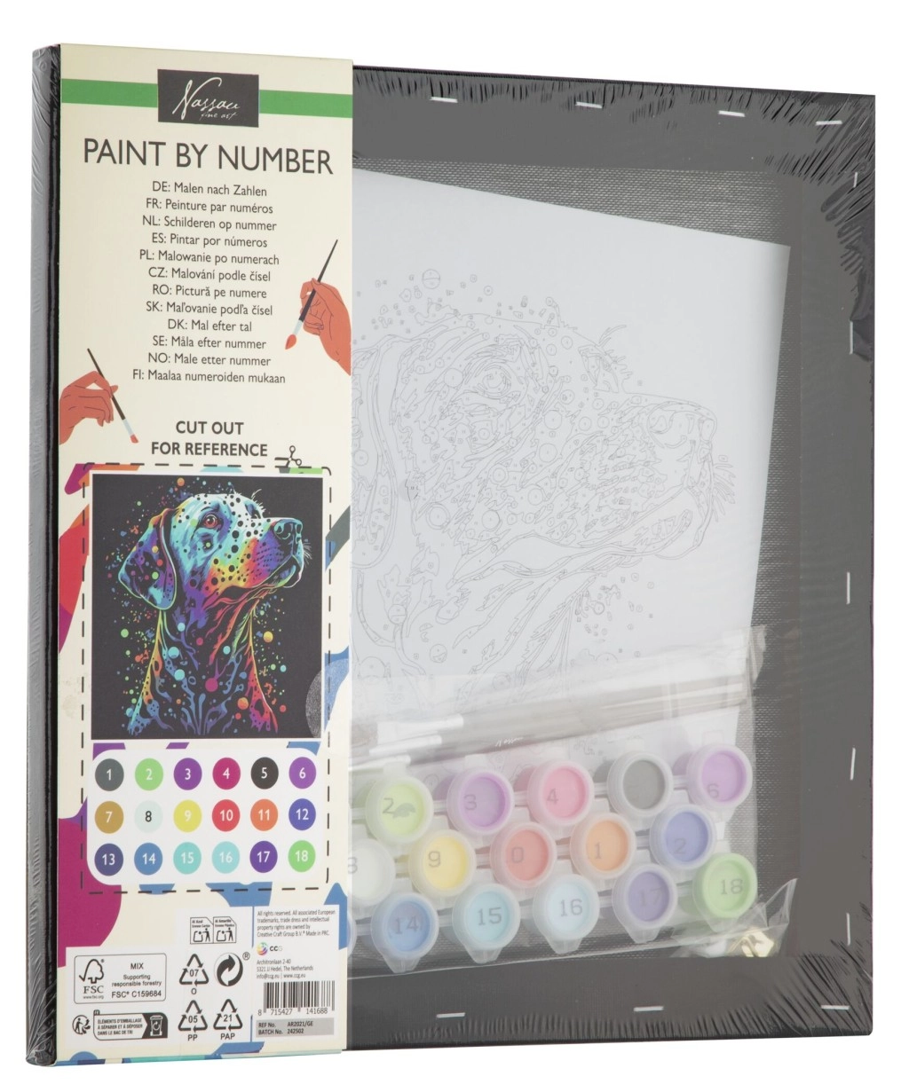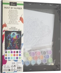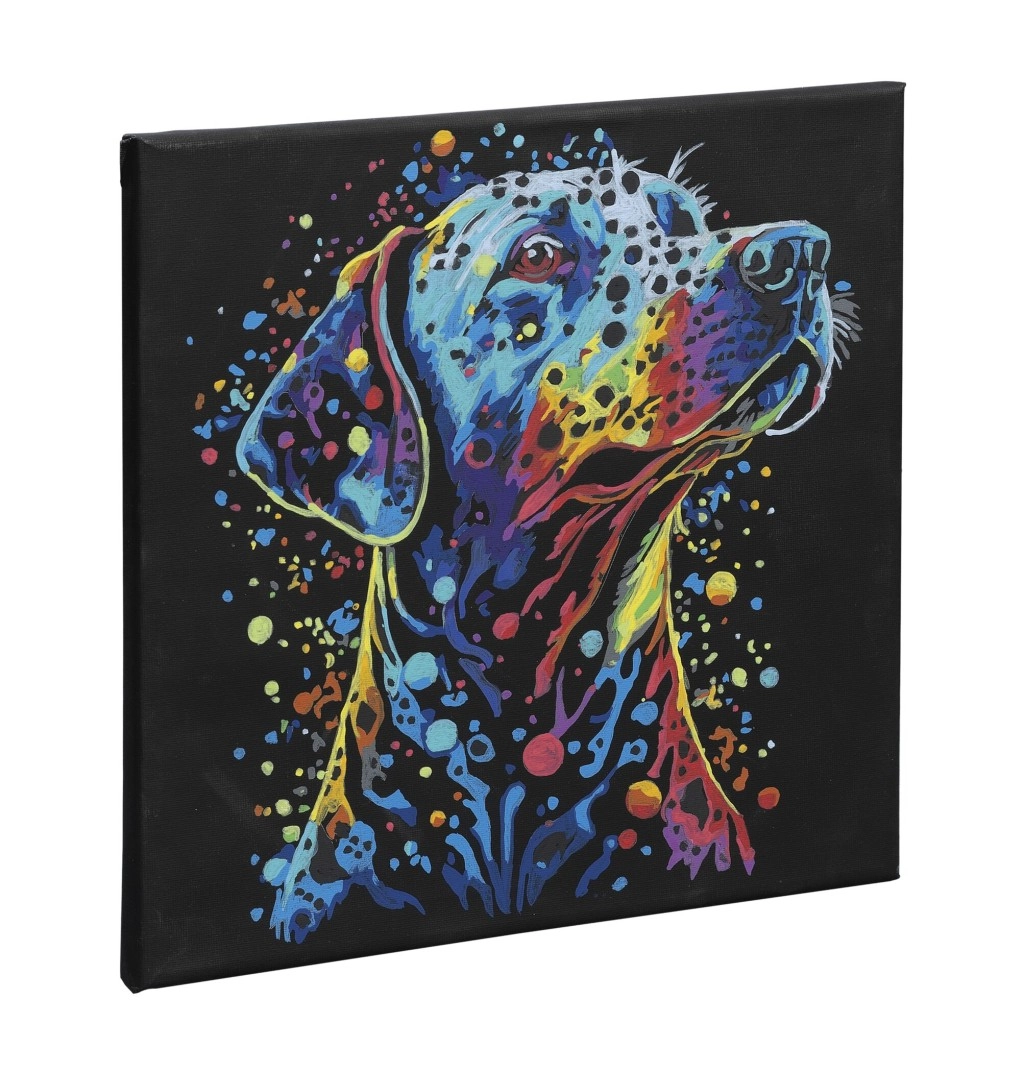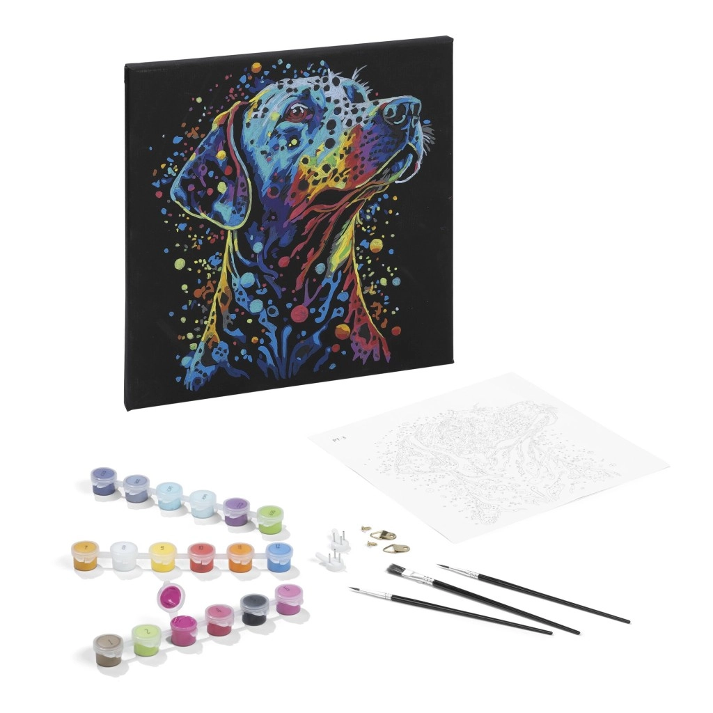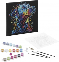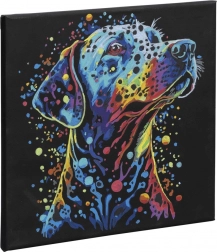 Descoperă relaxarea creativă cu un set pentru pictură după numere. Pe pânza neagră cu motiv de câine vei crea ușor un tablou pas cu pas datorită câmpurilor numerotate și vopselelor incluse. Colorare ușoară, rezultate precise și contrast impresionant pe fundalul negru îți garantează bucuria creației și o frumoasă decorațiune pentru interior.