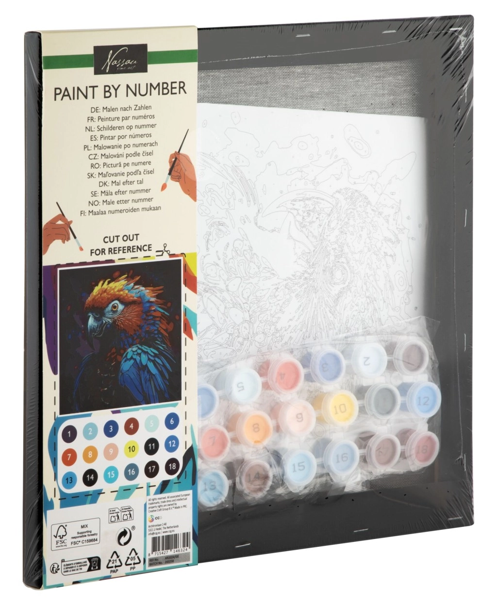 Descoperă farmecul picturii după numere și transformă motivul pretipărit al papagalului pe fundal negru într-un tablou expresiv cu culori strălucitoare. Zonele numerotate corespund culorilor din set, astfel încât pictarea este intuitivă chiar și pentru începători. Pânza neagră oferă profunzime și un aspect modern motivului.