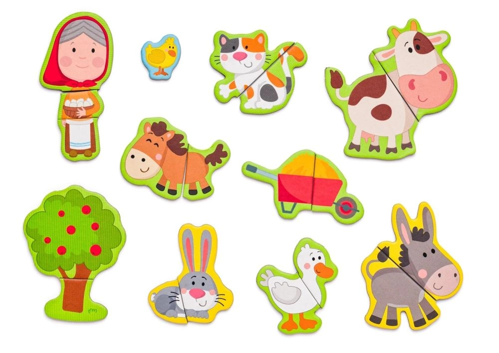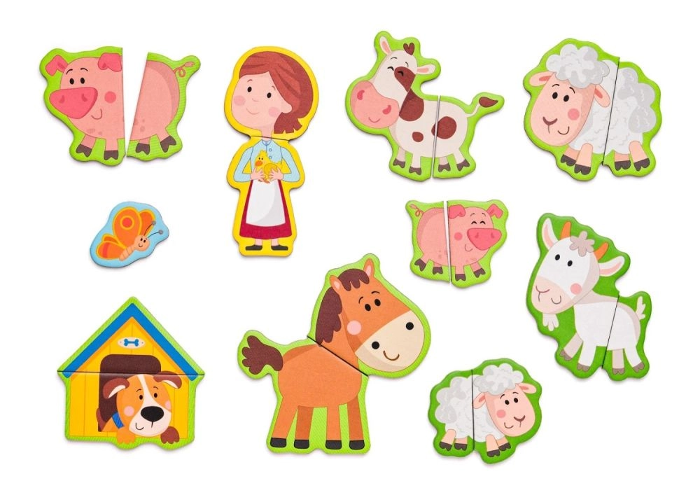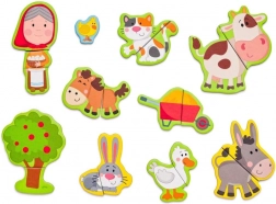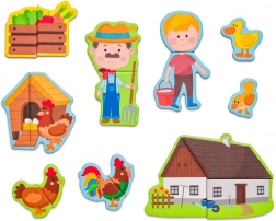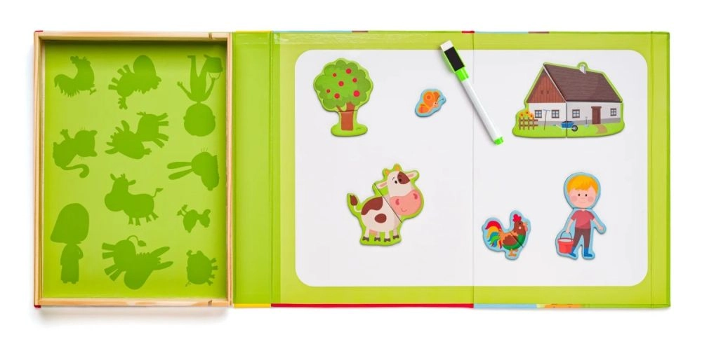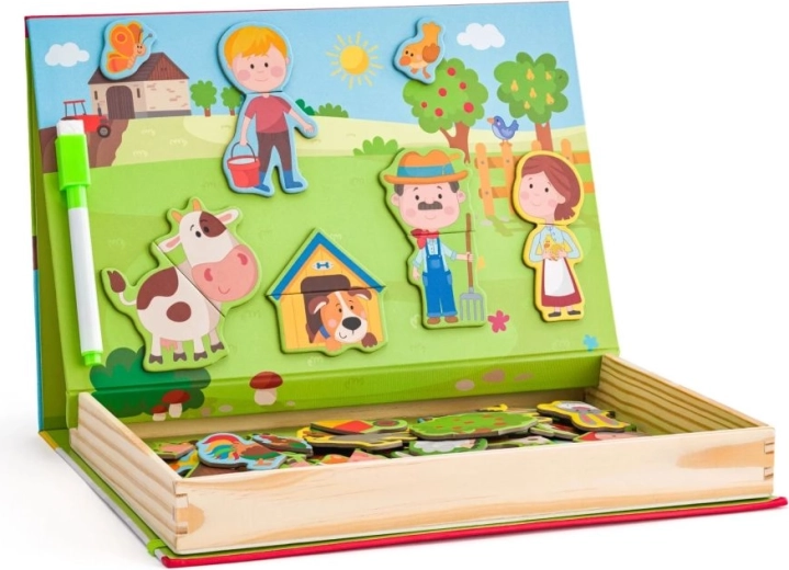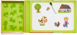 Această setare magnetică cu motiv de fermă oferă copiilor ore întregi de distracție creativă. Cutia din lemn, care se deschide, servește drept tablă magnetică pe care se pot fixa piesele colorate cu personaje, animale și accesorii. Copiii își compun propriile povești, învață să recunoască animalele și își exersează coordonarea mână–ochi.
