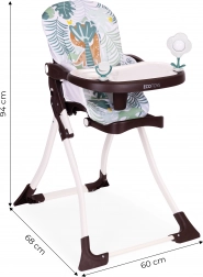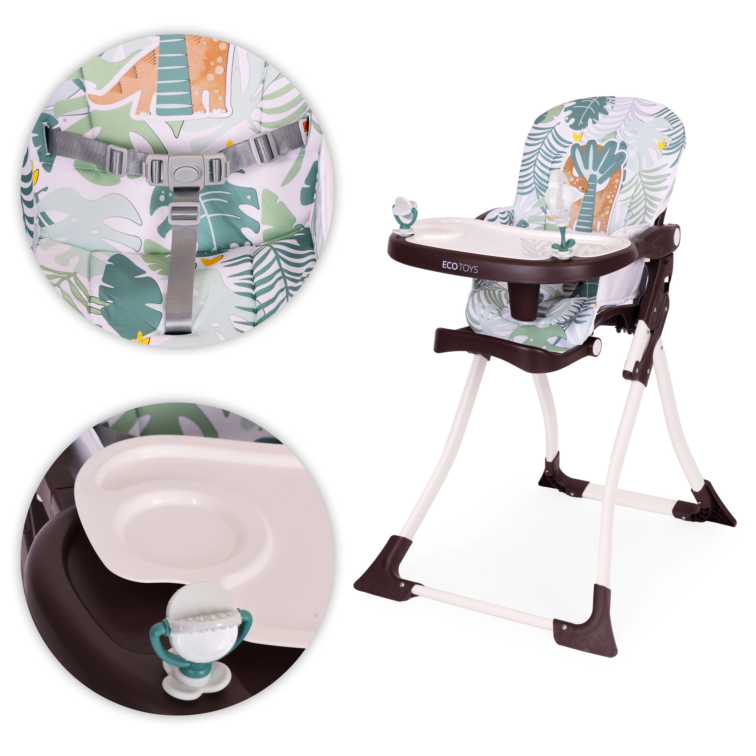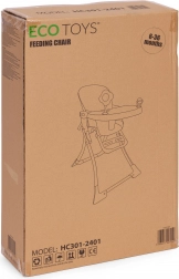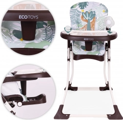 Scaunul de masă ECOTOYS ușurează mesele în familie și menține copilul confortabil și în siguranță. Tăvița lată oferă spațiu suficient pentru farfurie, cană și joacă – include jucărie rotativă și zornăitoare care distrează și stimulează simțurile. Structura pliabilă economisește spațiu în interioare mici și facilitează transportul.