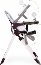 Tăviță lată, reglabilă și cu două straturi, cu inserție superioară detașabilă ușor de curățat. Jucăriile integrate distrează copilul în așteptarea mesei și susțin dezvoltarea motrică.