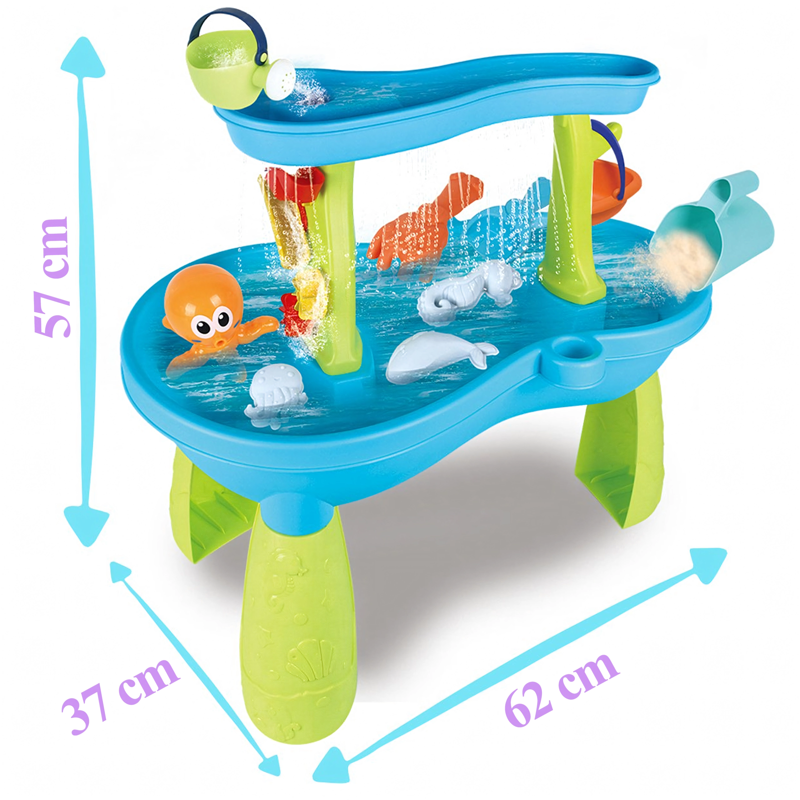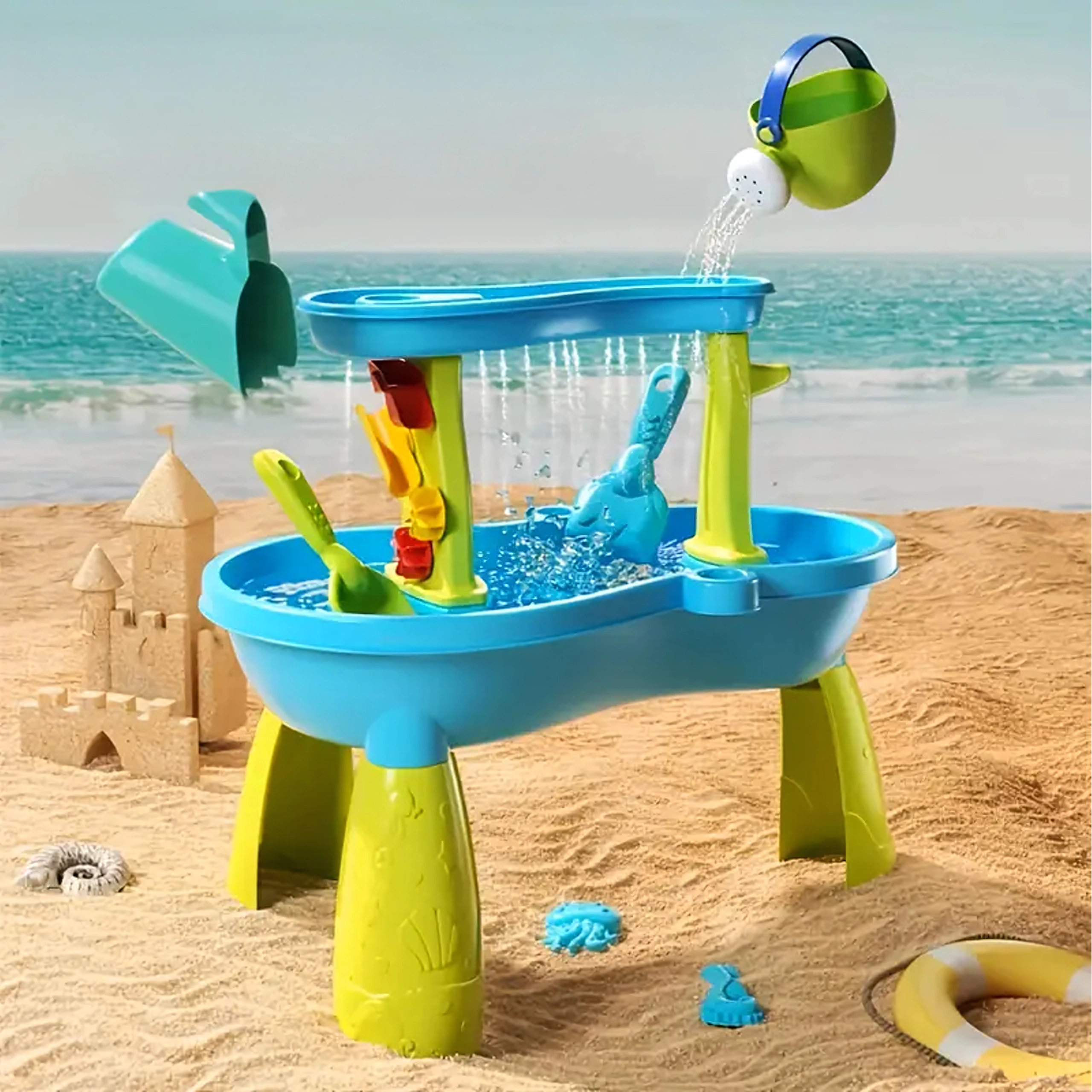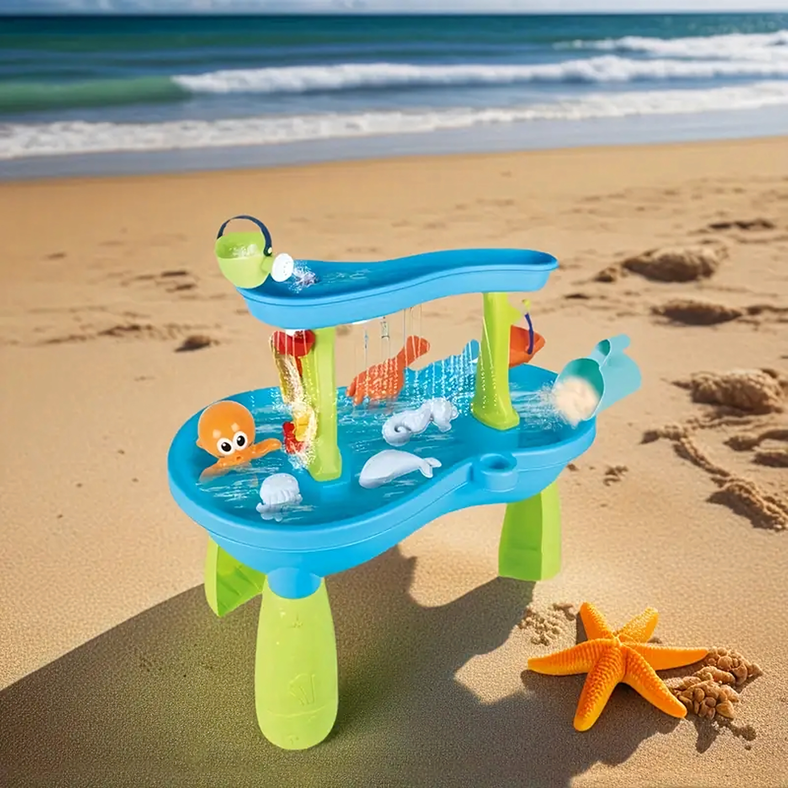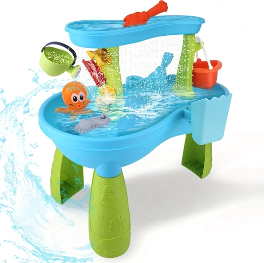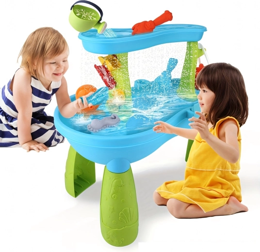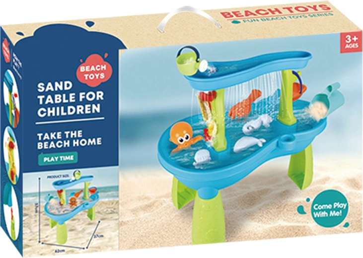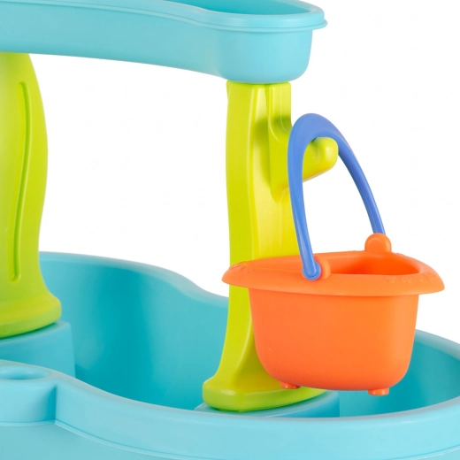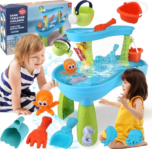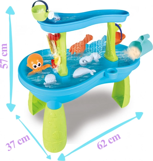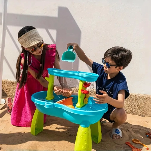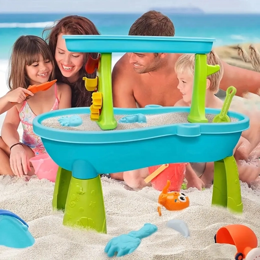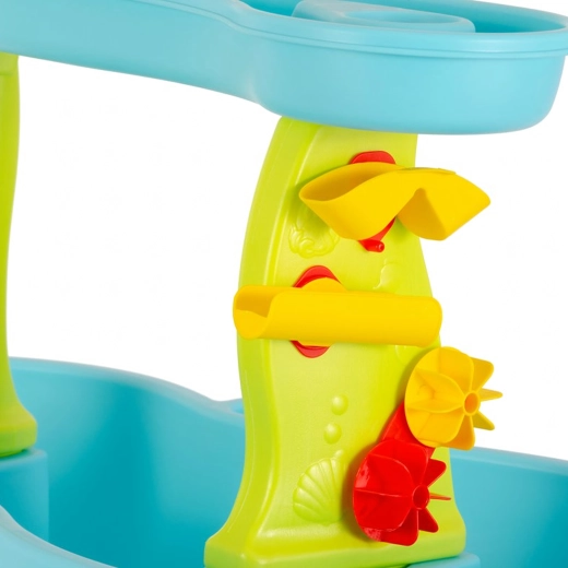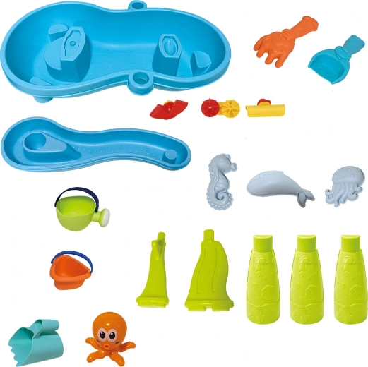 Include un set bogat de accesorii: lopeți, găleți, stropitoare, forme cu animale marine, tobogane și preaplinuri de apă. Datorită zonelor multiple de joacă și rigolelor ingenioase, joaca este variată, încurajează colaborarea copiilor și le dezvoltă imaginația.
