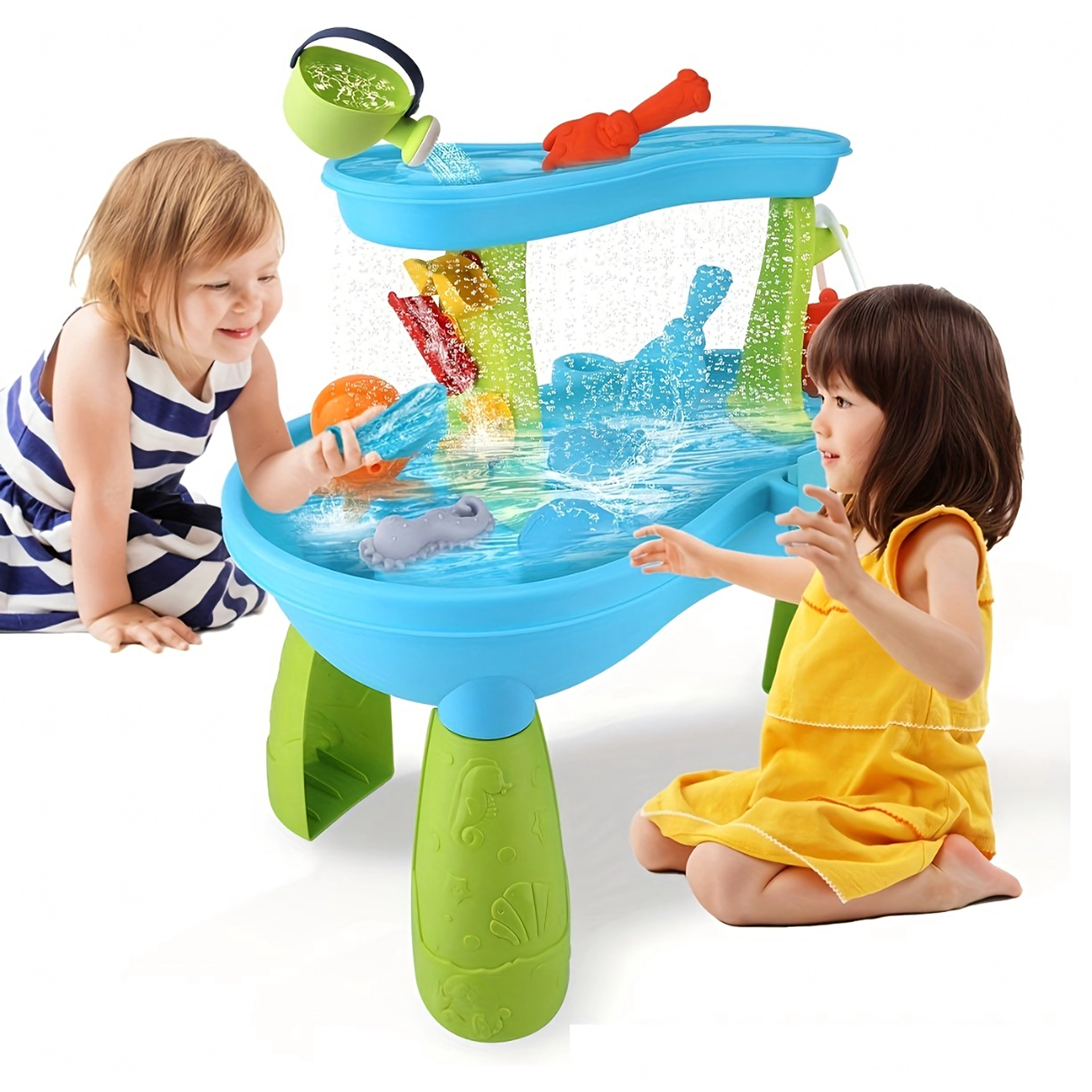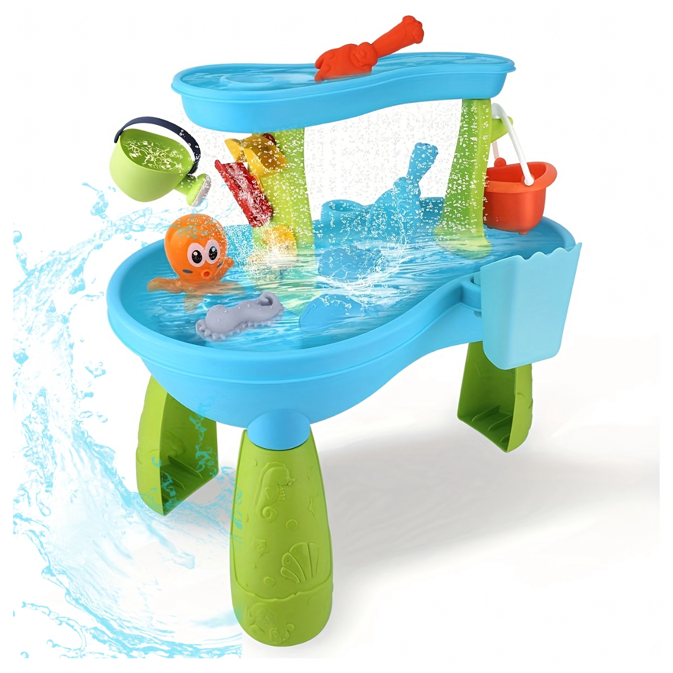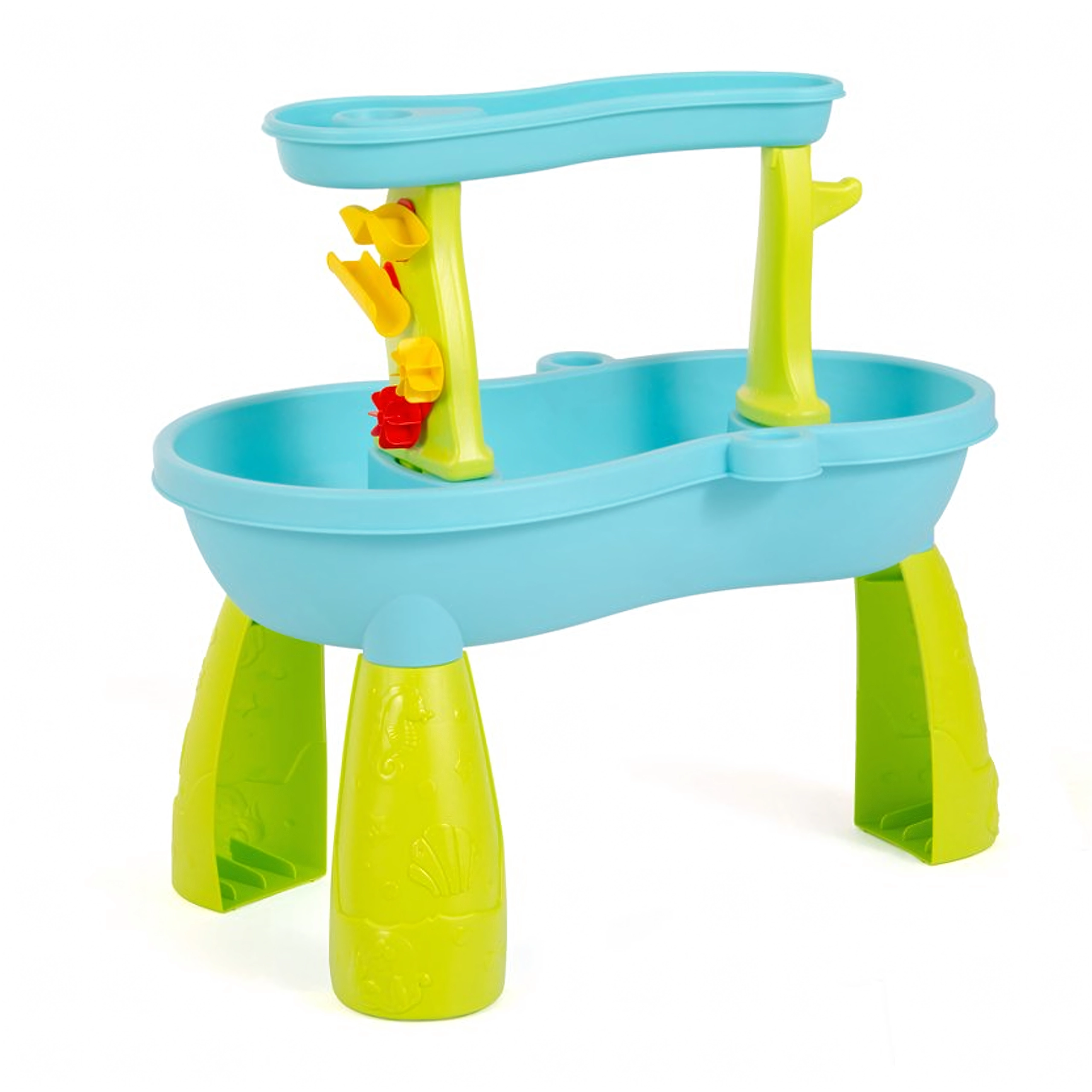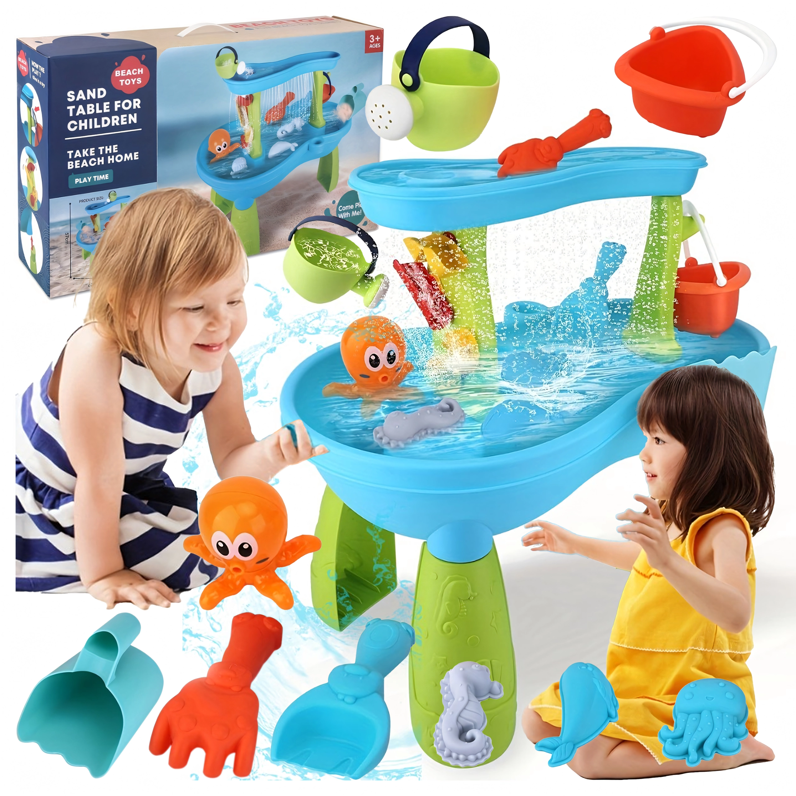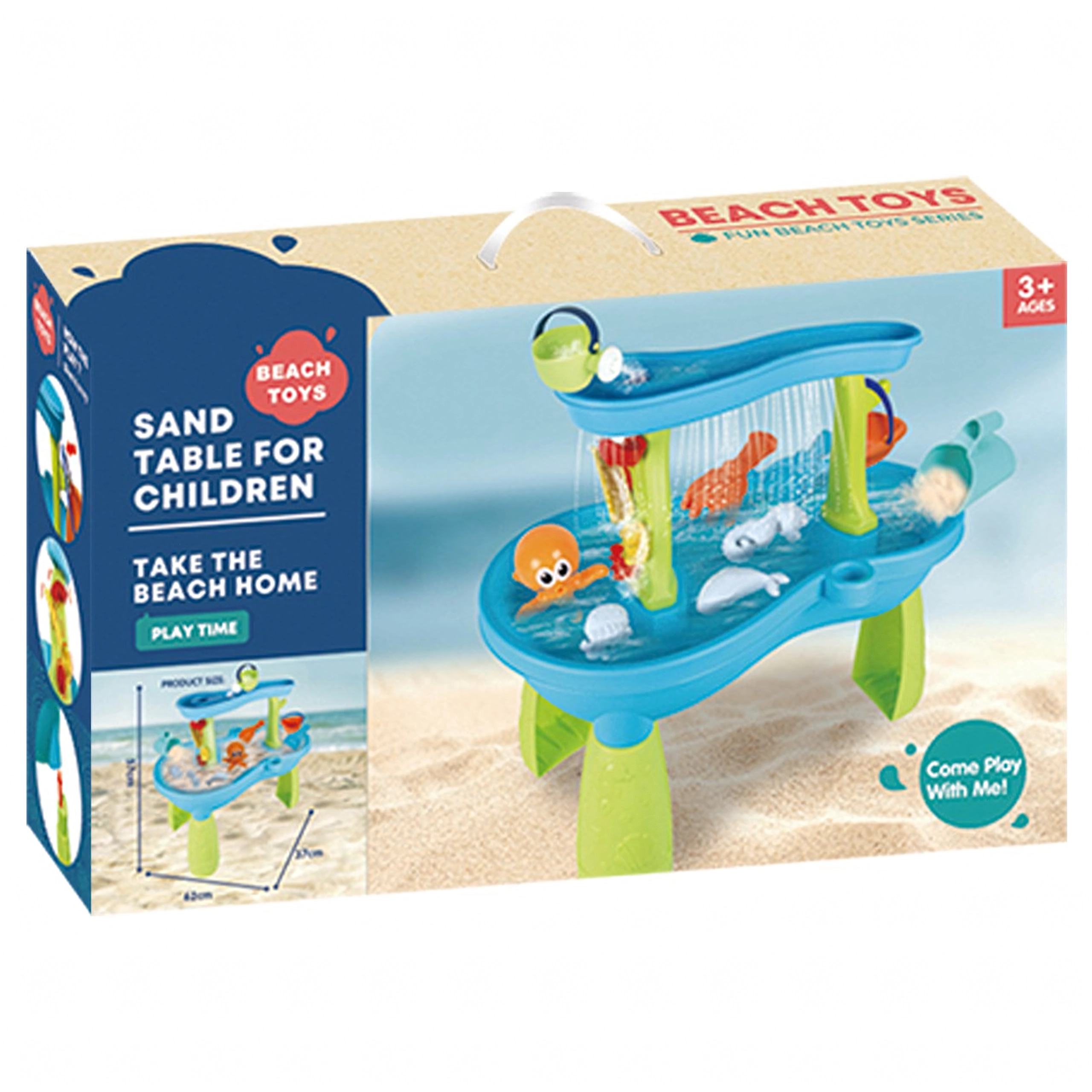 Include un set bogat de accesorii: lopeți, găleți, stropitoare, forme cu animale marine, tobogane și preaplinuri de apă. Datorită zonelor multiple de joacă și rigolelor ingenioase, joaca este variată, încurajează colaborarea copiilor și le dezvoltă imaginația.