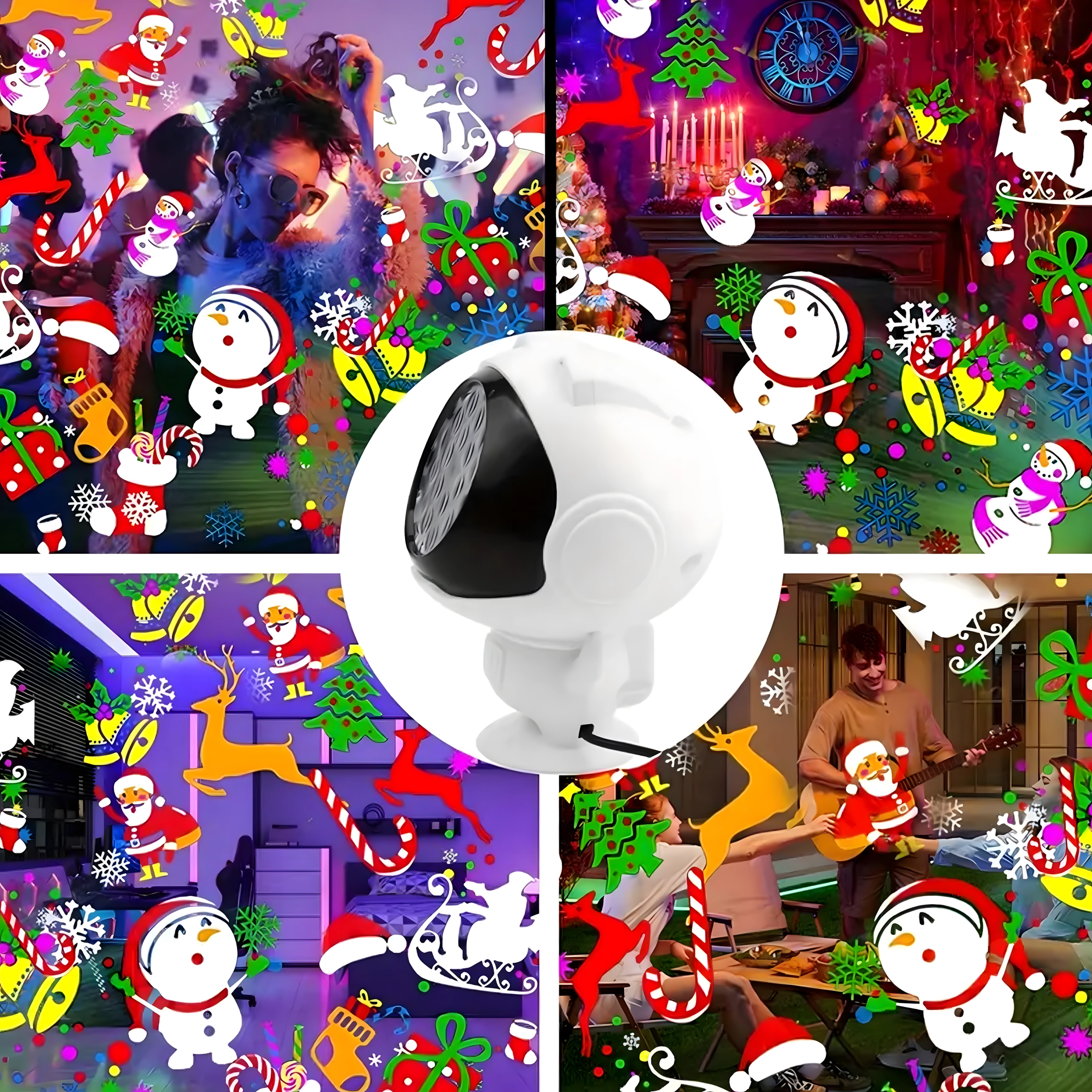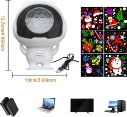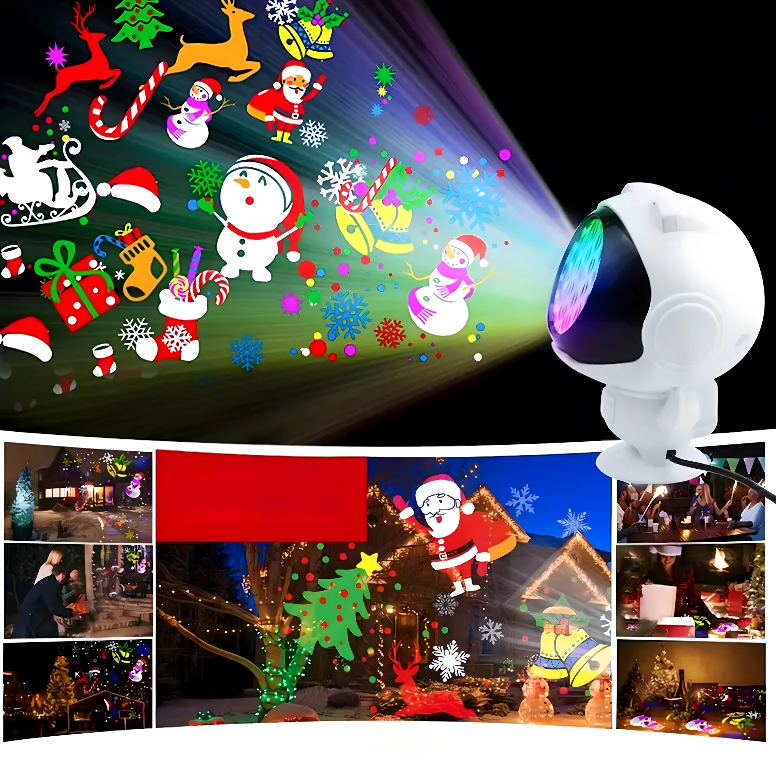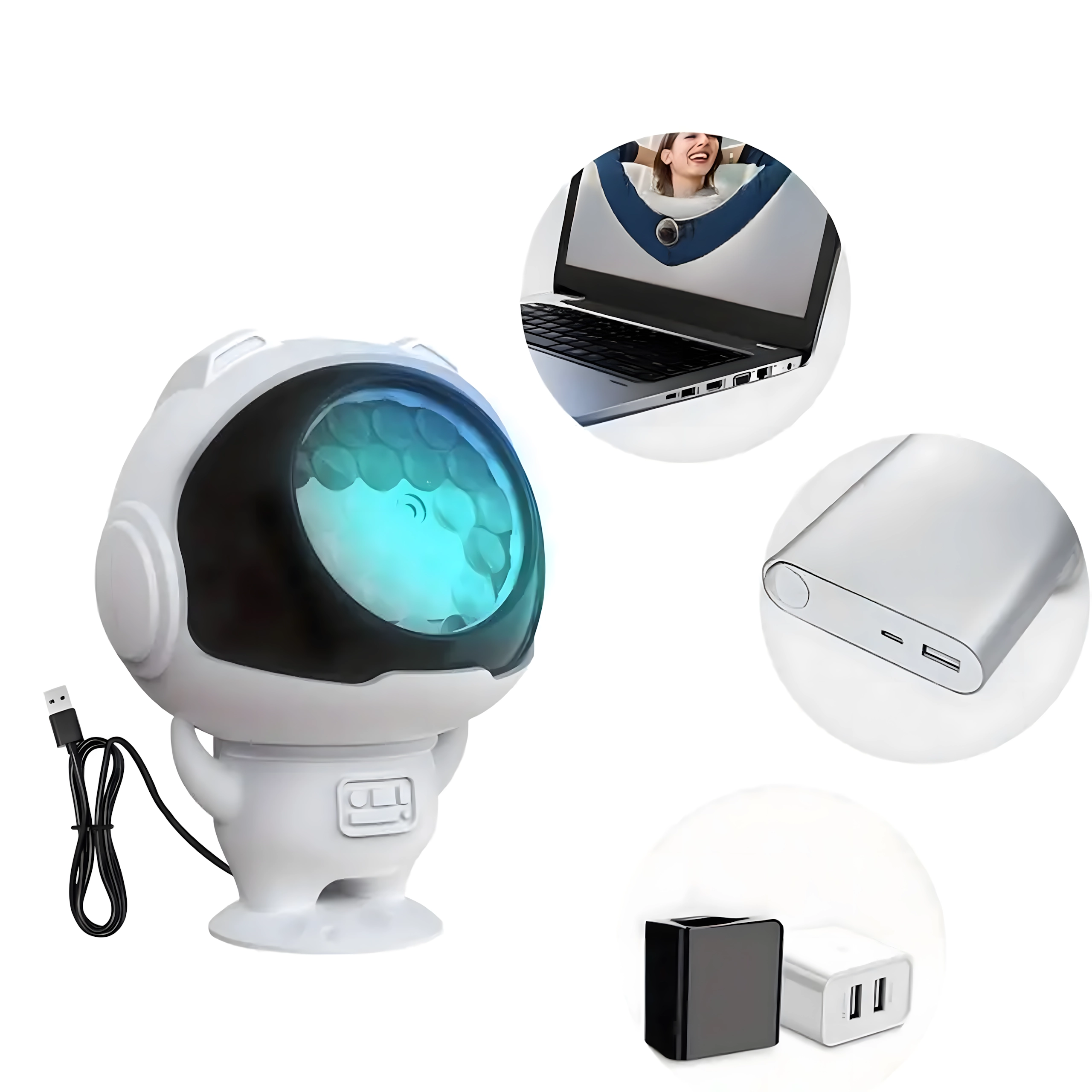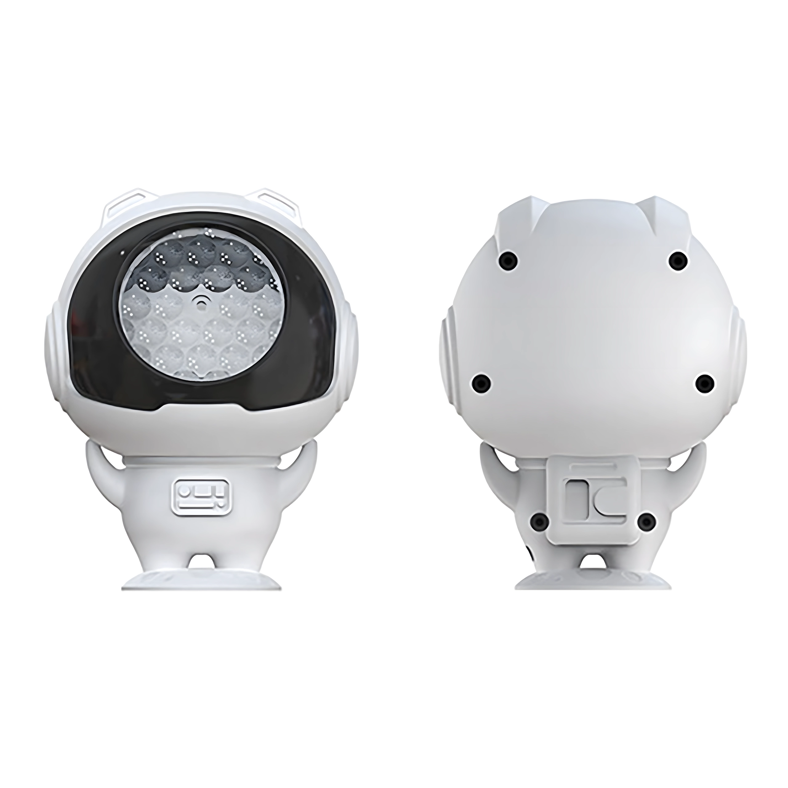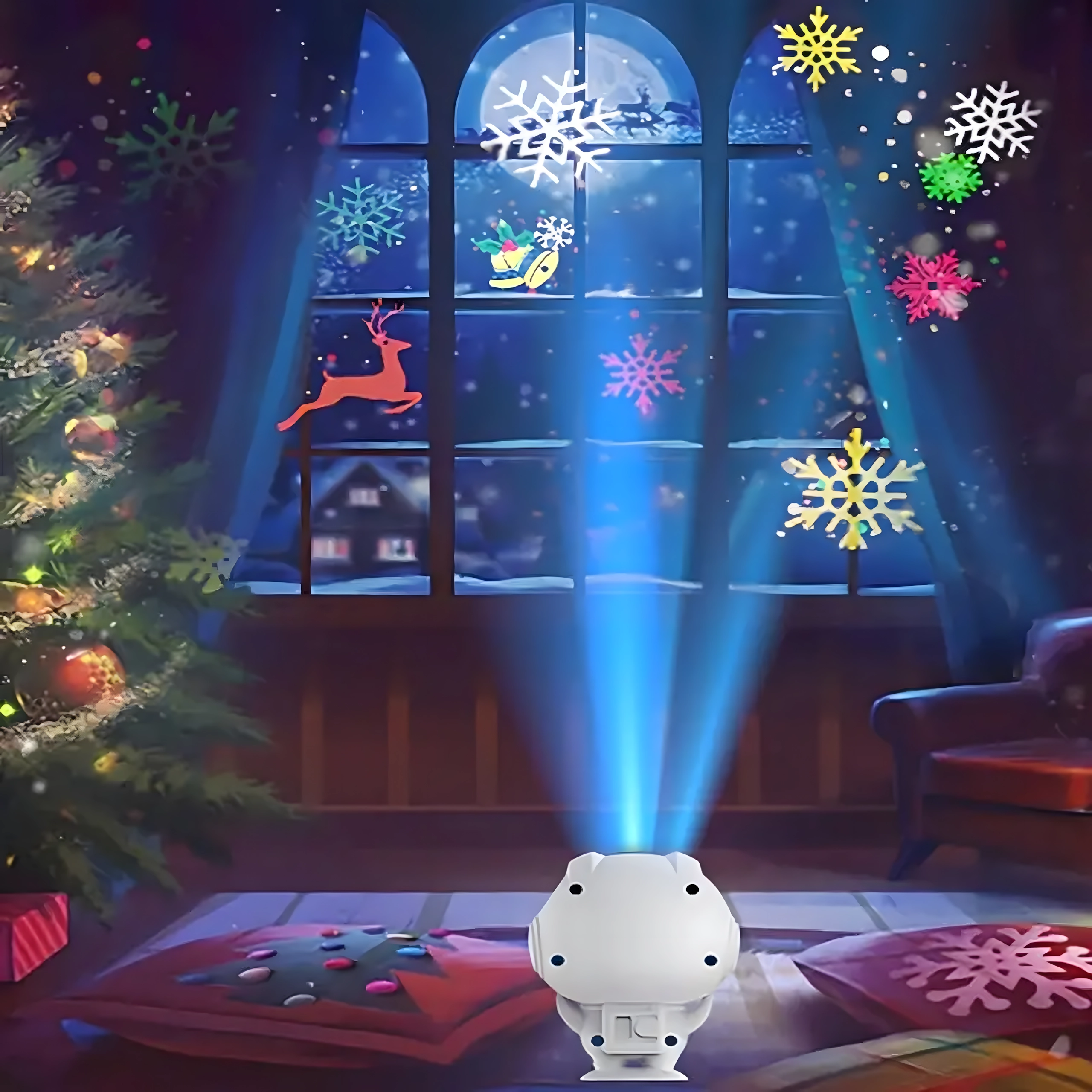 Proiector compact în formă de astronaut, cu bază stabilă, potrivit pentru birou, raft sau pervaz, completând frumos decorul de iarnă.