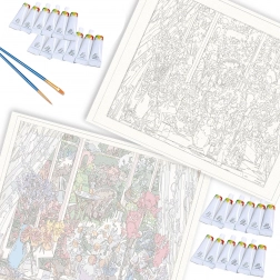 - Echipare completă: pânză numerotată, culori acrilice, pensule, elemente de agățare.