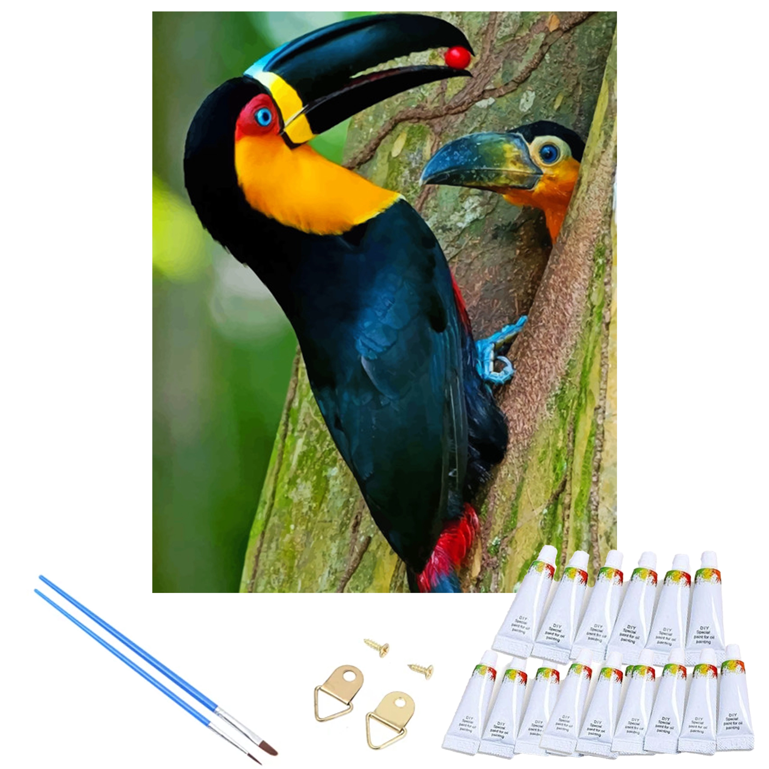 Acest set DIY complet îți permite să creezi un tablou impresionant cu tucan exotic fără experiență anterioară. Fiecare câmp numerotat de pe pânză corespunde unei nuanțe specifice, ceea ce asigură pictură ușoară, distractivă și relaxantă. Datorită întinderii pe șasiu din lemn, poți începe imediat după despachetare, iar lucrarea finală poate fi atârnată direct.
