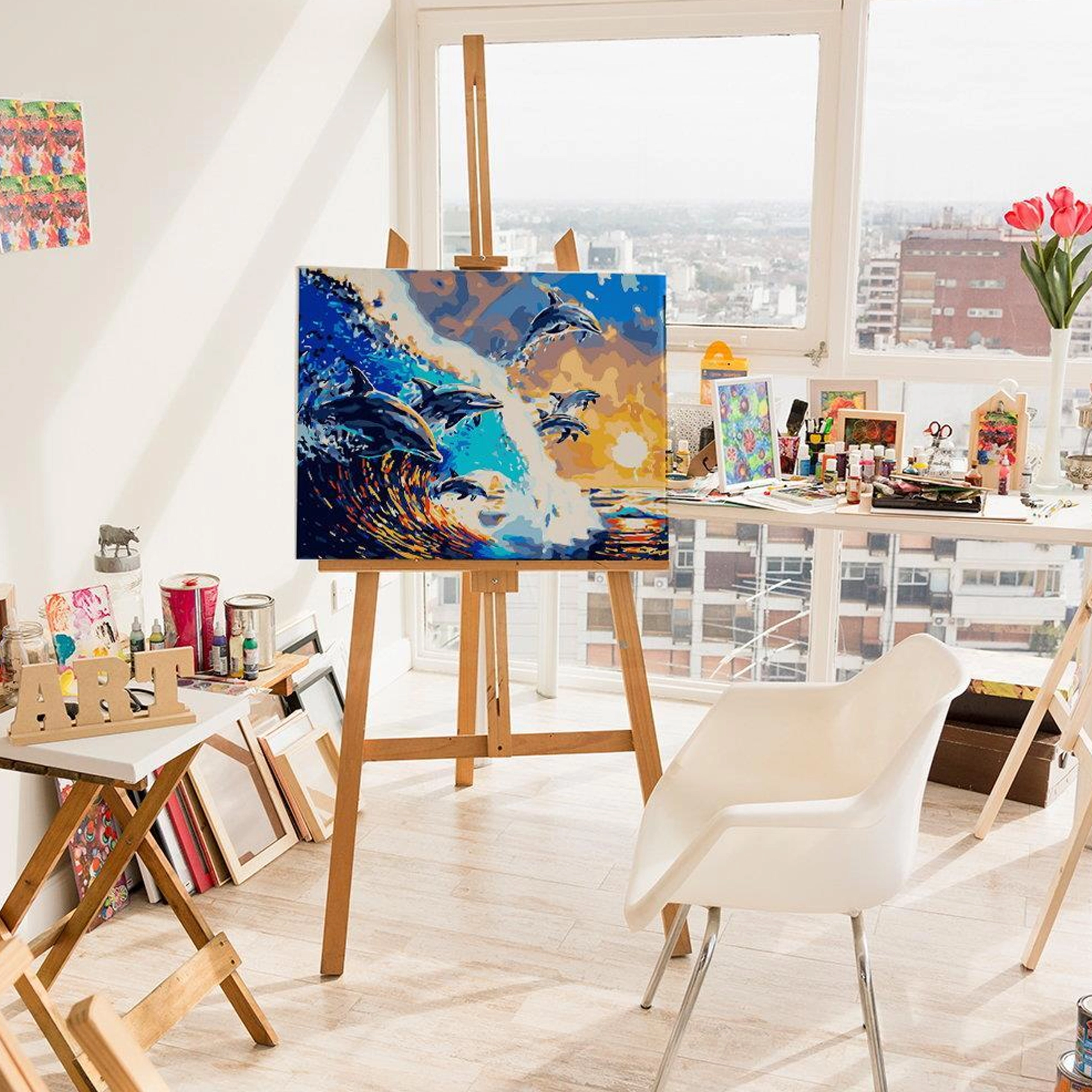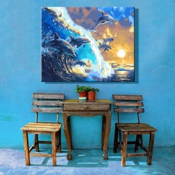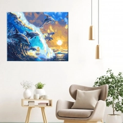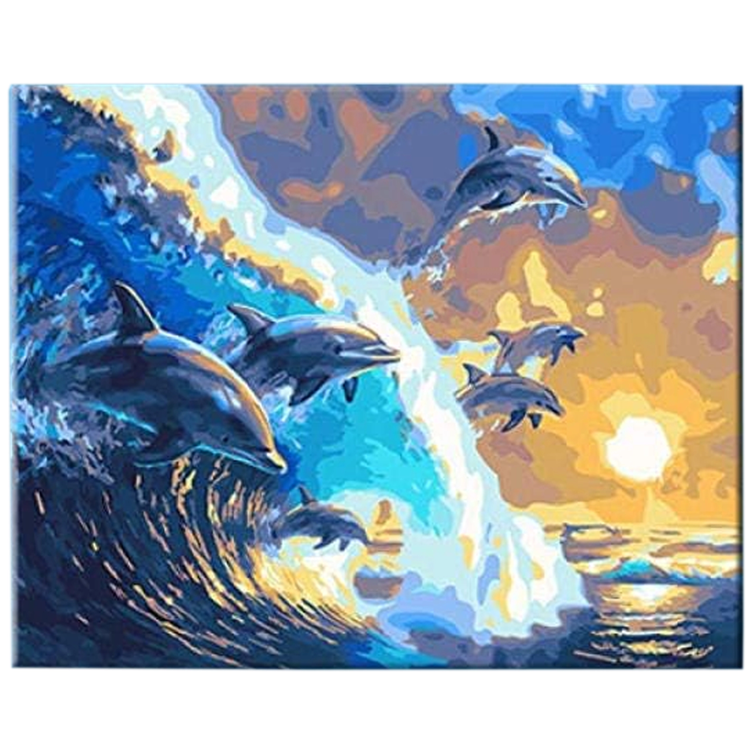 Descoperă relaxarea și creativitatea cu setul complet de pictură după numere în format 40 × 50 cm cu pânză întinsă pe ramă. Trebuie doar să potrivești numerele cu culorile și, pas cu pas, vei crea un motiv impresionant cu delfini la apus – ideal pentru începători și avansați, grozav ca cadou, iar tabloul final poate fi agățat ușor pe perete.
