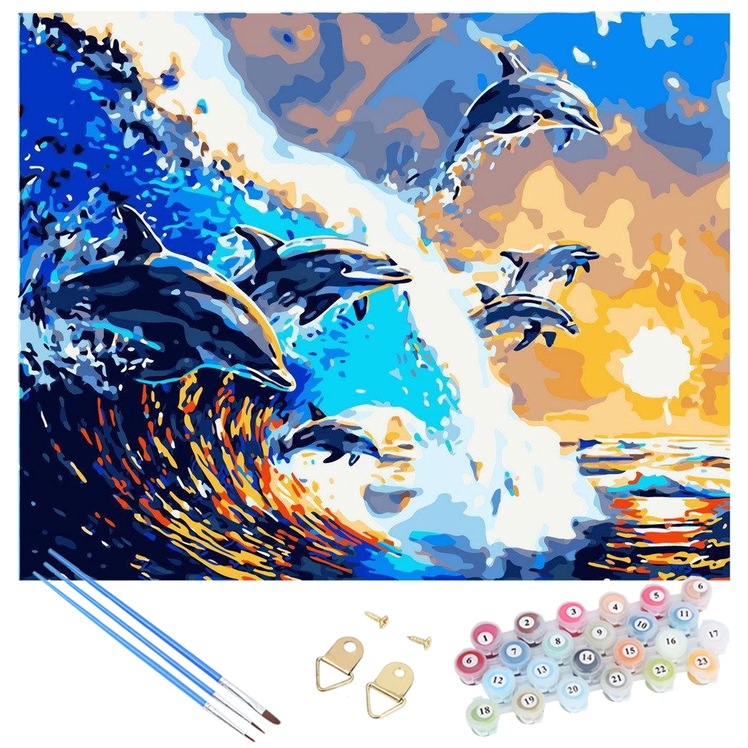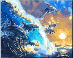 Acest set creativ îți permite să pictezi propriul tablou fără experiență anterioară. Pânza are sectoare numerotate pretipărite, iar în pachet găsești vopsele acrilice corespunzătoare și pensule. Fiecărui număr îi corespunde o culoare specifică – tu doar completezi și urmărești cum prinde viață în fața ta o scenă marină plină de viață cu delfini.