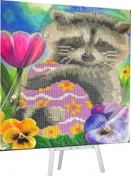 - Pânză autoadezivă cu simboluri, pietricele colorate (drills), stilou de aplicare, ceară, tavă de sortare, mini-easel alb