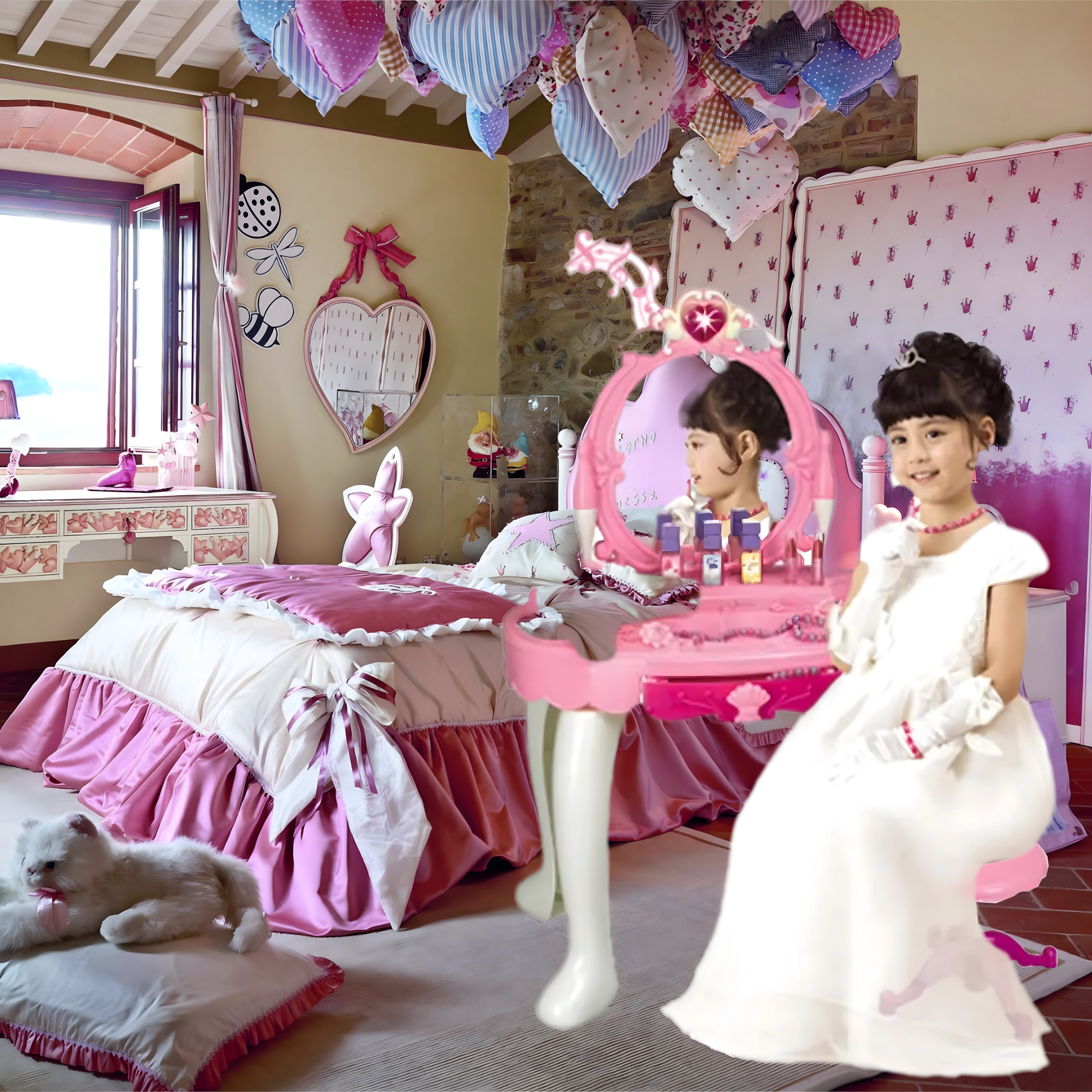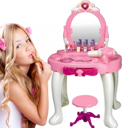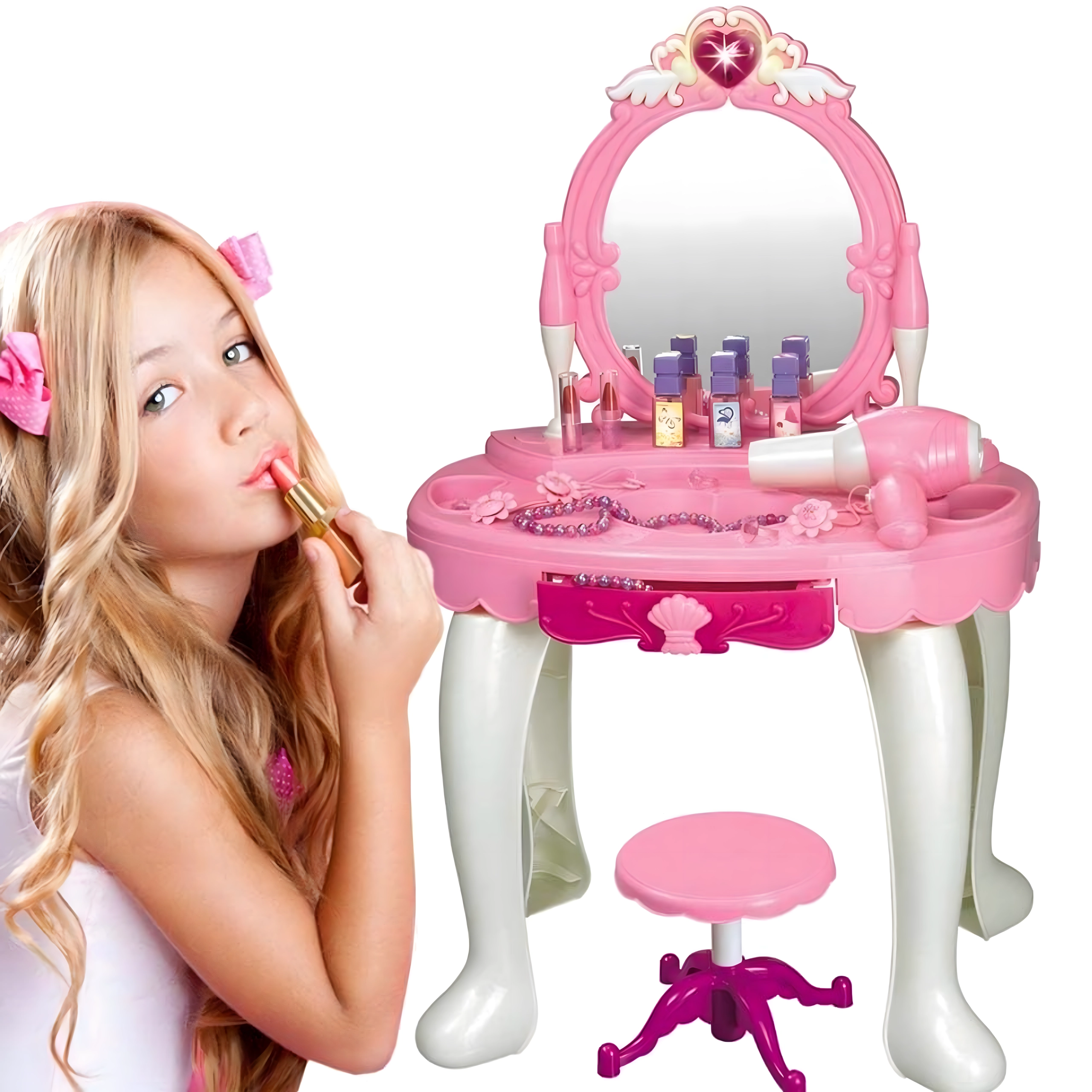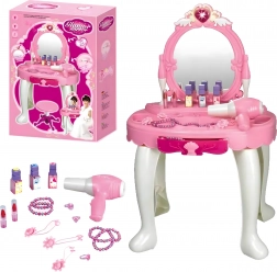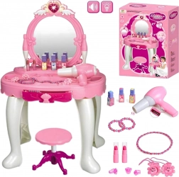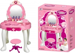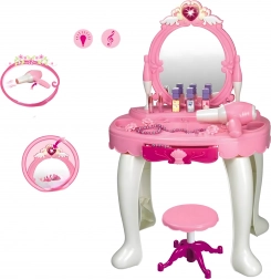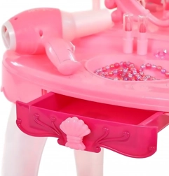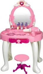 - Măsuță de toaletă cu oglindă, taburet, uscător de jucărie pe baterii, pieptene, bijuterii, sticluțe, „cosmetice” și alte accesorii