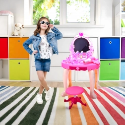 Măsuța de toaletă roz, magică, pentru micile prințese include un oglindă, un taburet și un set bogat de accesorii pentru jocuri de imaginație. Copiii vor fi încântați de efectele luminoase și sonore, de uscătorul de jucărie pe baterii și de sertarele și compartimentele de depozitare practice. Ideală pentru dezvoltarea creativității, motricității fine și a jocului de rol de îngrijire a aspectului.