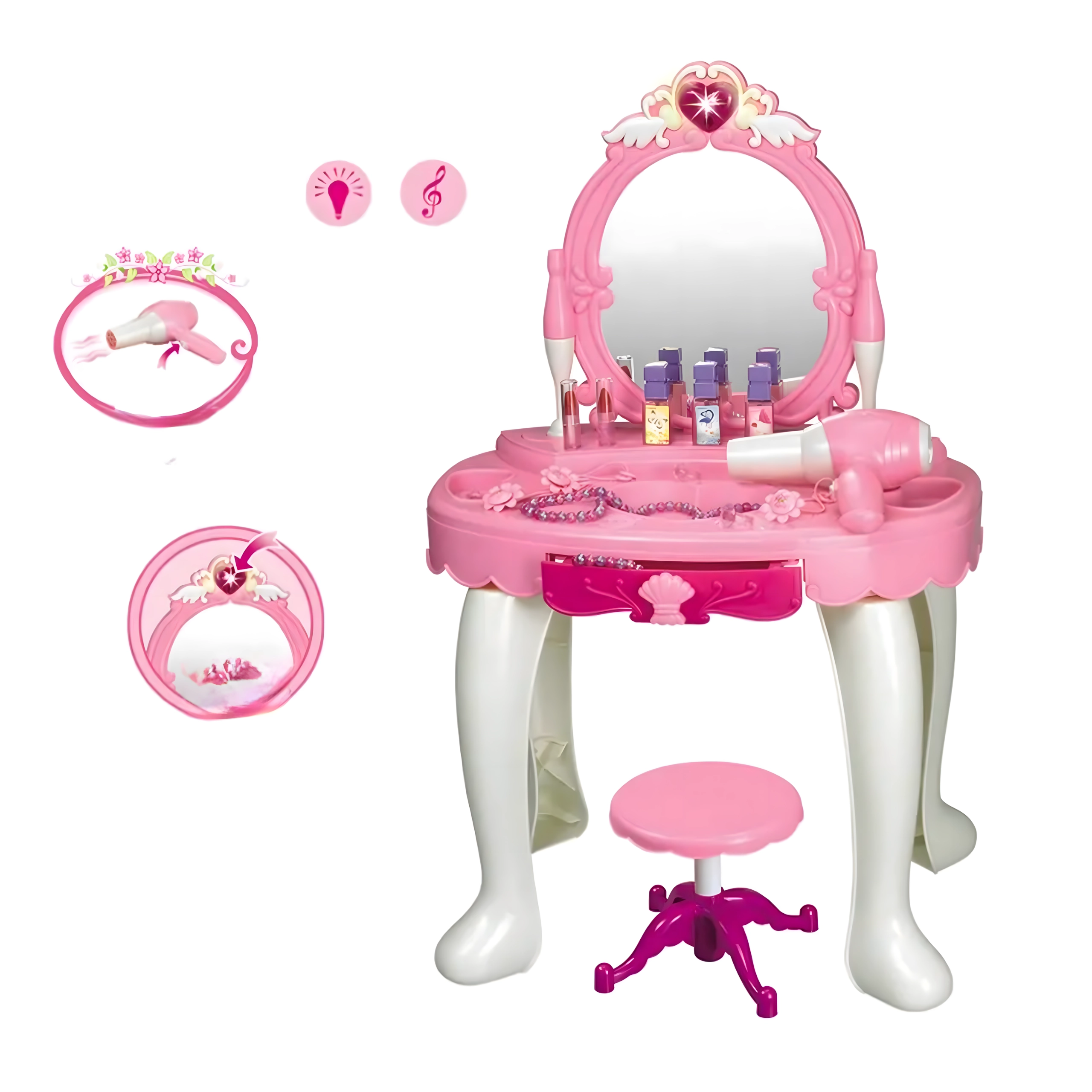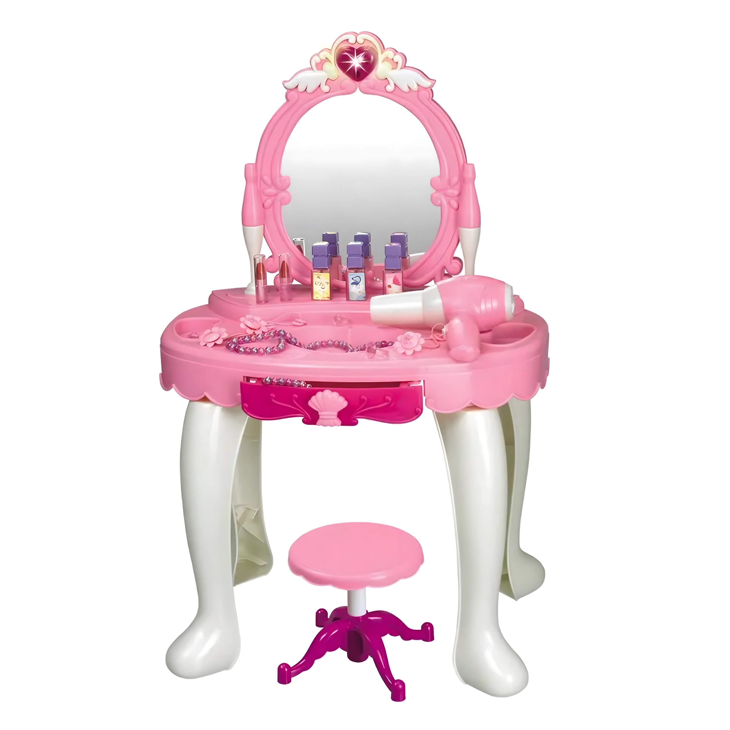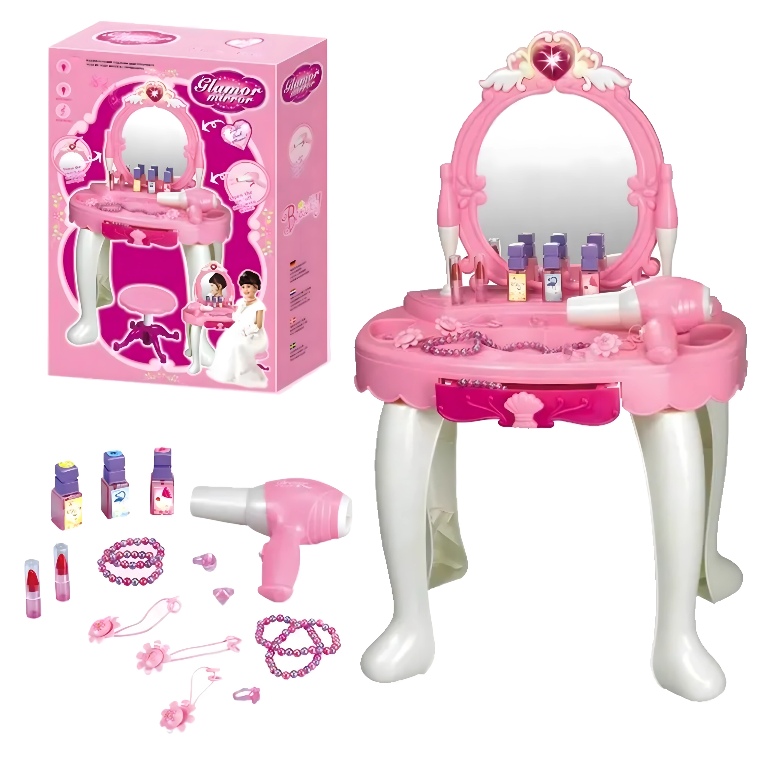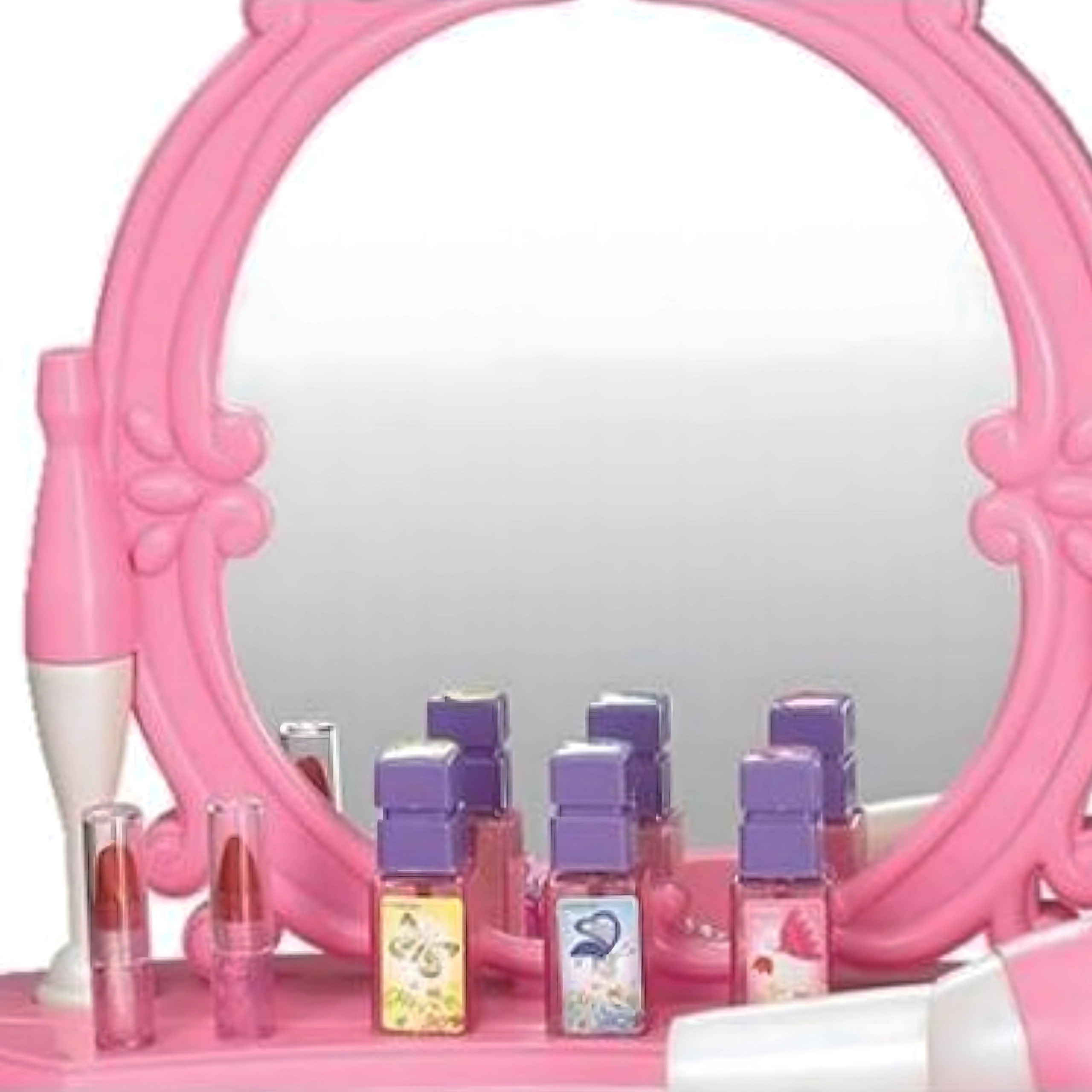 Această elegantă măsuță de toaletă pentru copii, în nuanțe de roz, oferă o oglindă sigură, o construcție din plastic durabil și un taburet confortabil. Include un set variat de accesorii – pieptene, bijuterii, „parfumuri”, rujuri și alte recuzite cosmetice – pentru ca fiecare joc de salon de înfrumusețare să fie desăvârșit. Efectele integrate și uscătorul de jucărie funcțional, pe baterii, susțin distracția realistă.