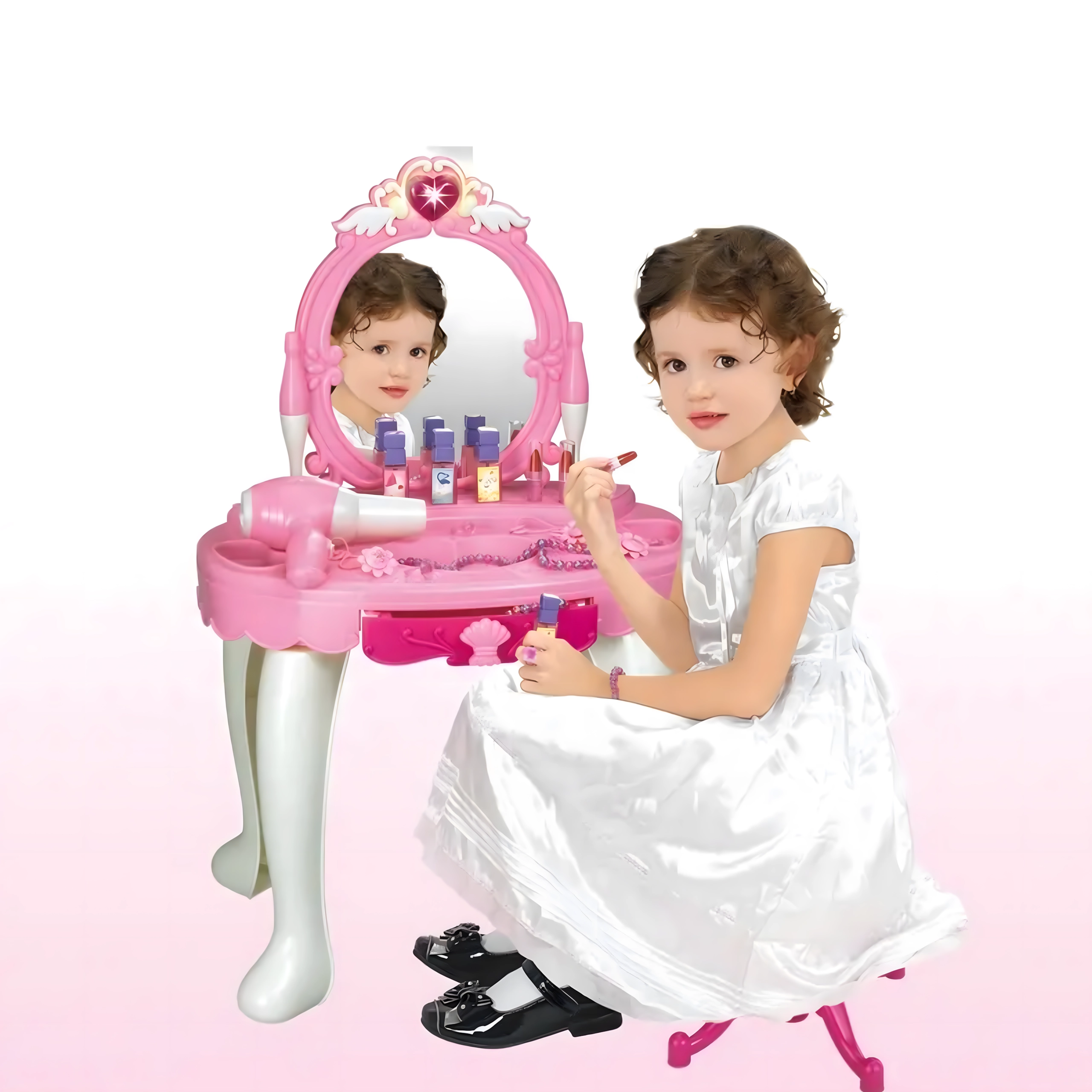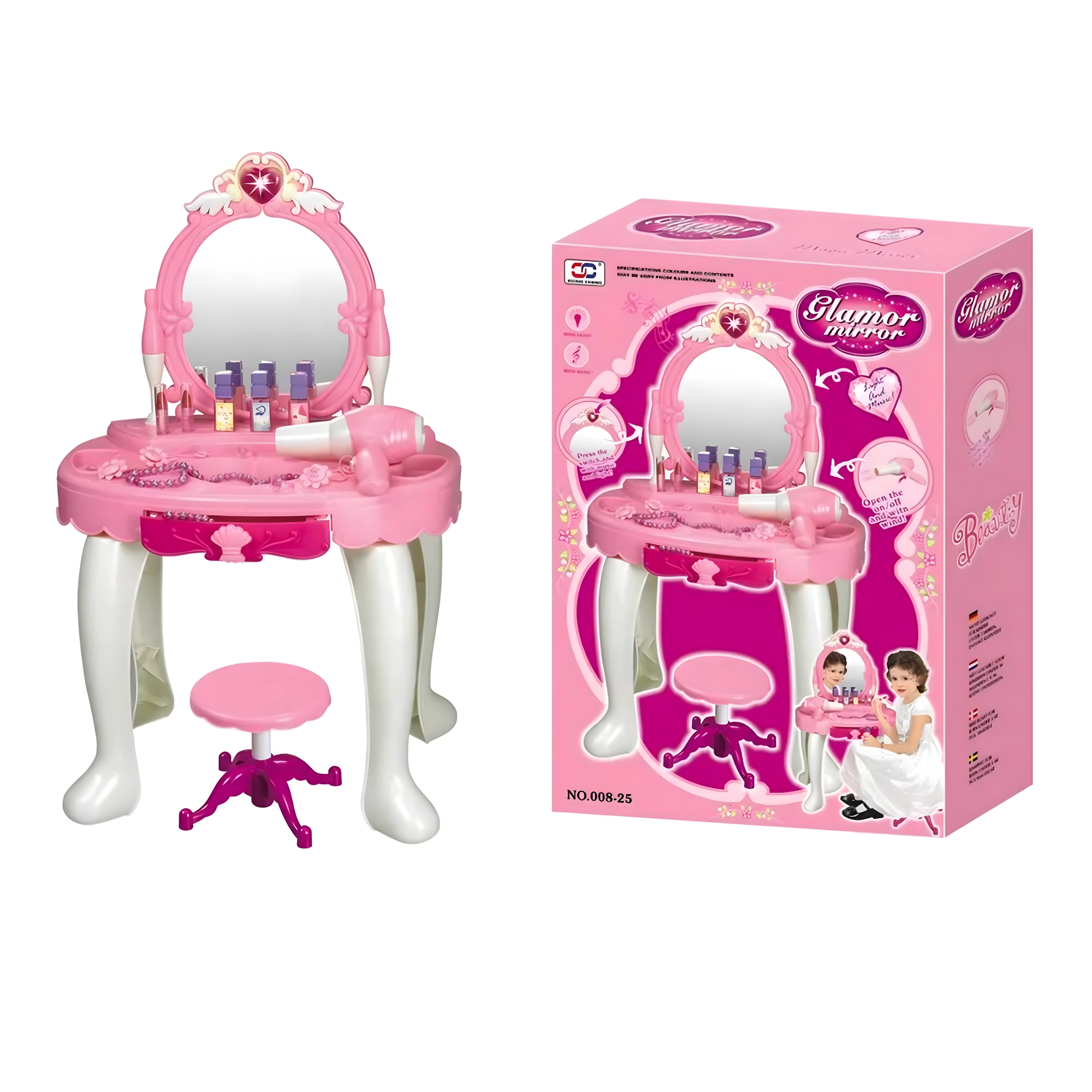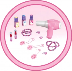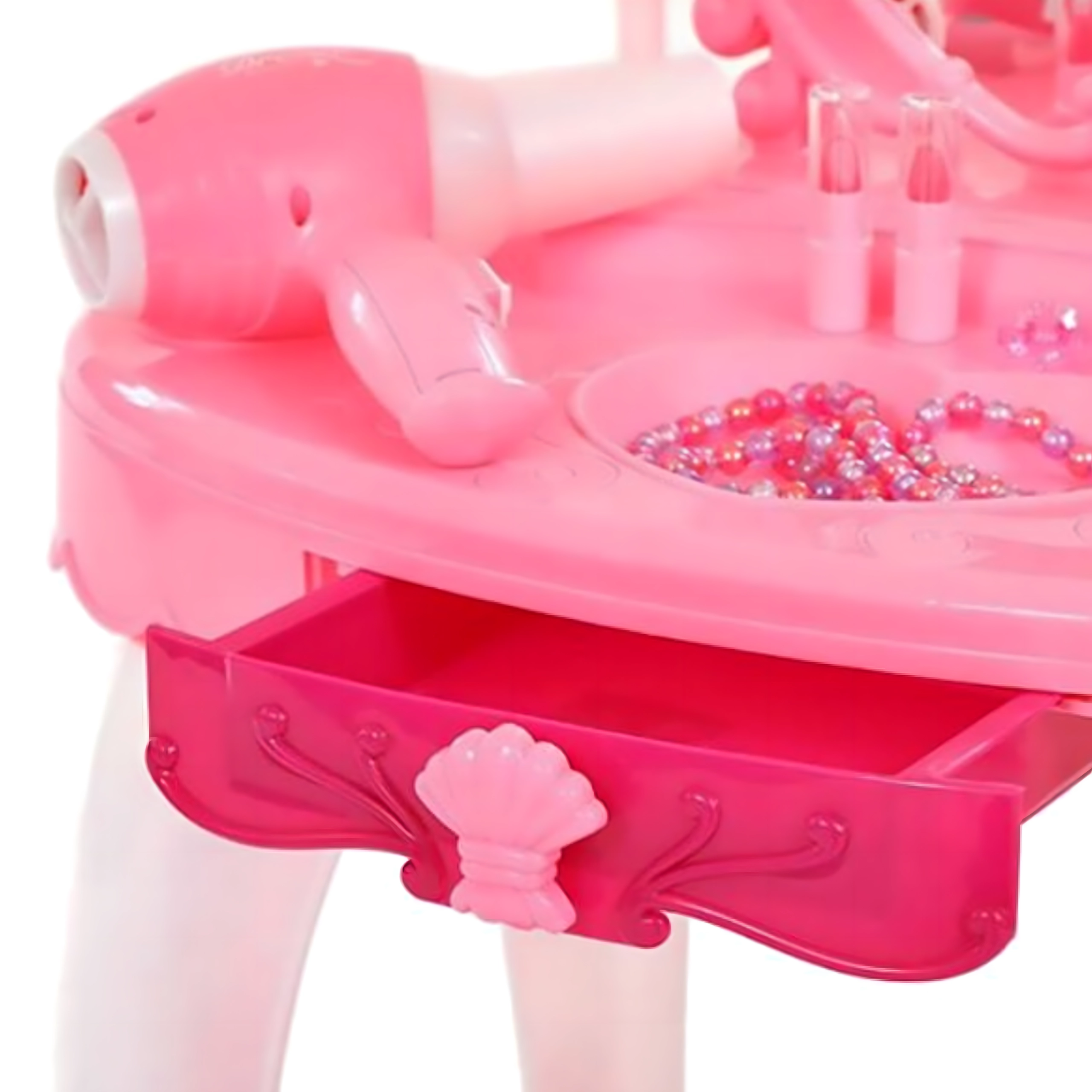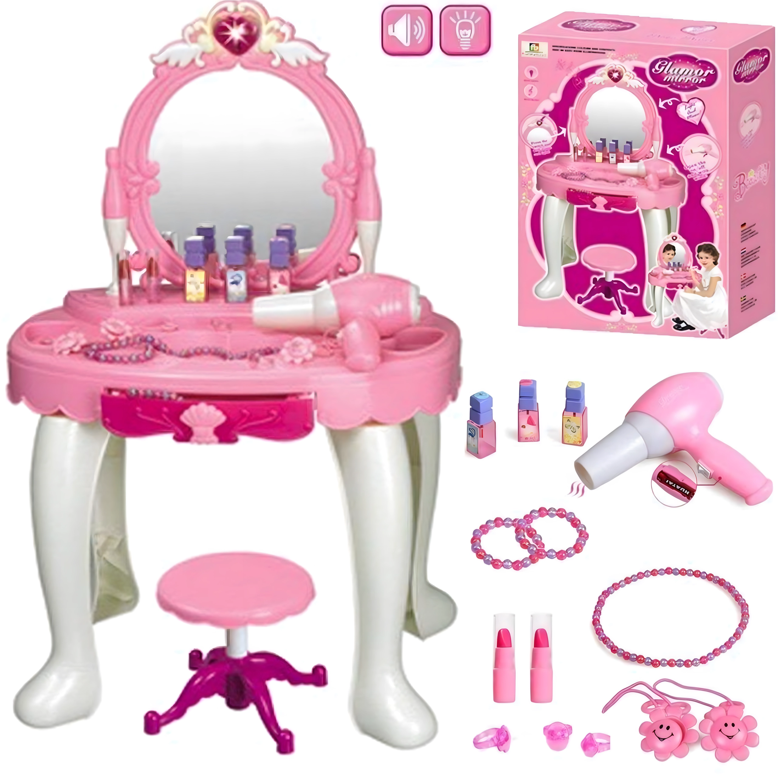 Această elegantă măsuță de toaletă pentru copii, în nuanțe de roz, oferă o oglindă sigură, o construcție din plastic durabil și un taburet confortabil. Include un set variat de accesorii – pieptene, bijuterii, „parfumuri”, rujuri și alte recuzite cosmetice – pentru ca fiecare joc de salon de înfrumusețare să fie desăvârșit. Efectele integrate și uscătorul de jucărie funcțional, pe baterii, susțin distracția realistă.