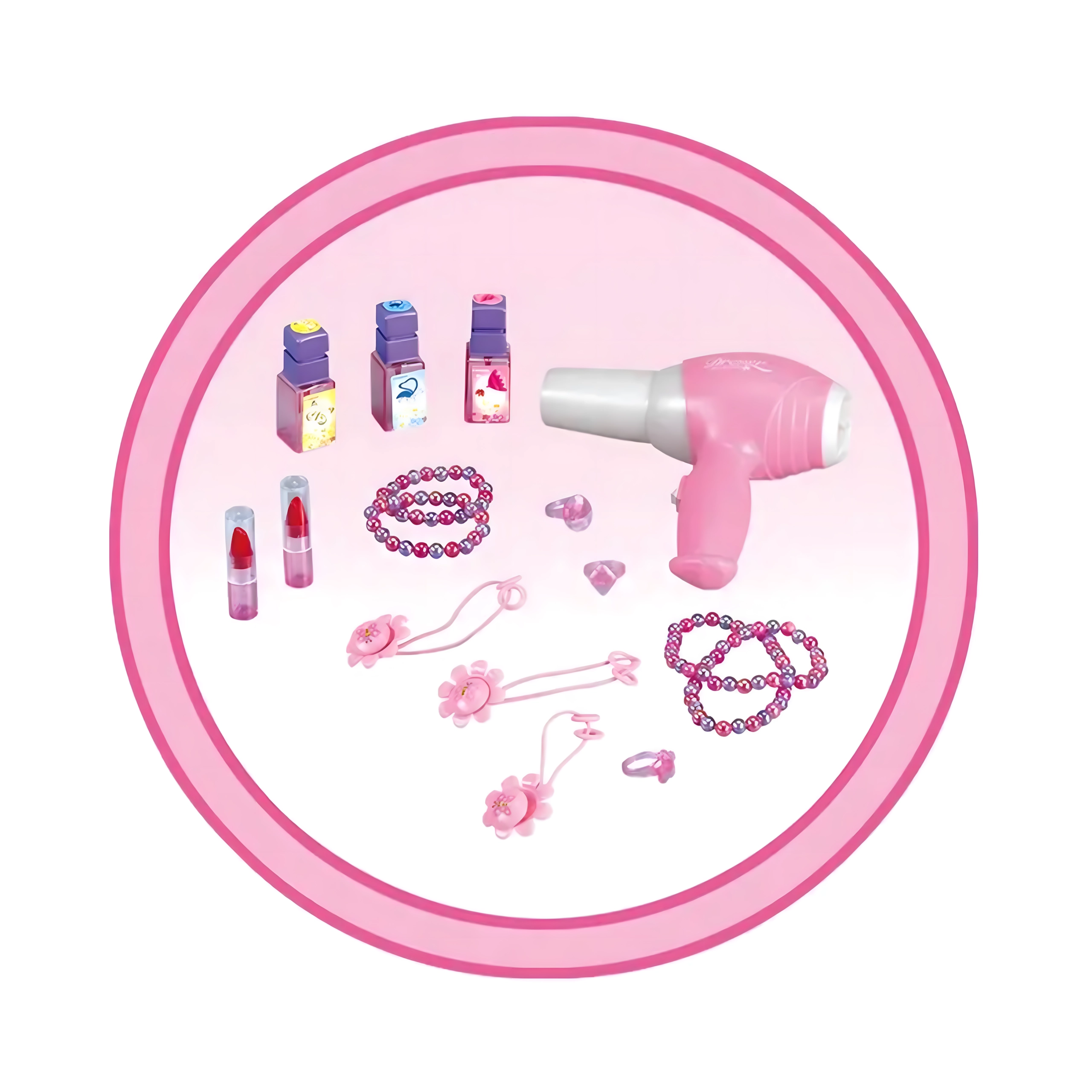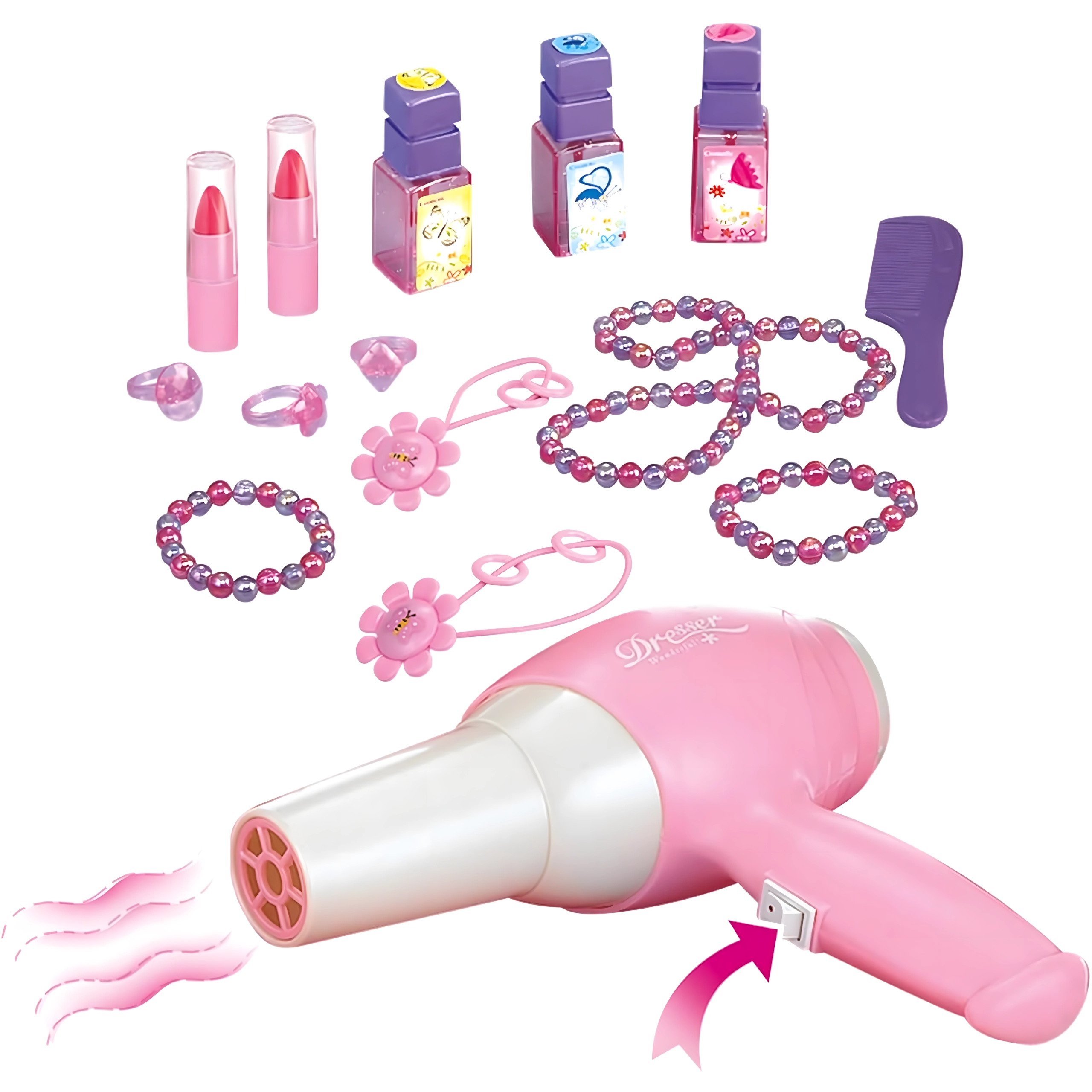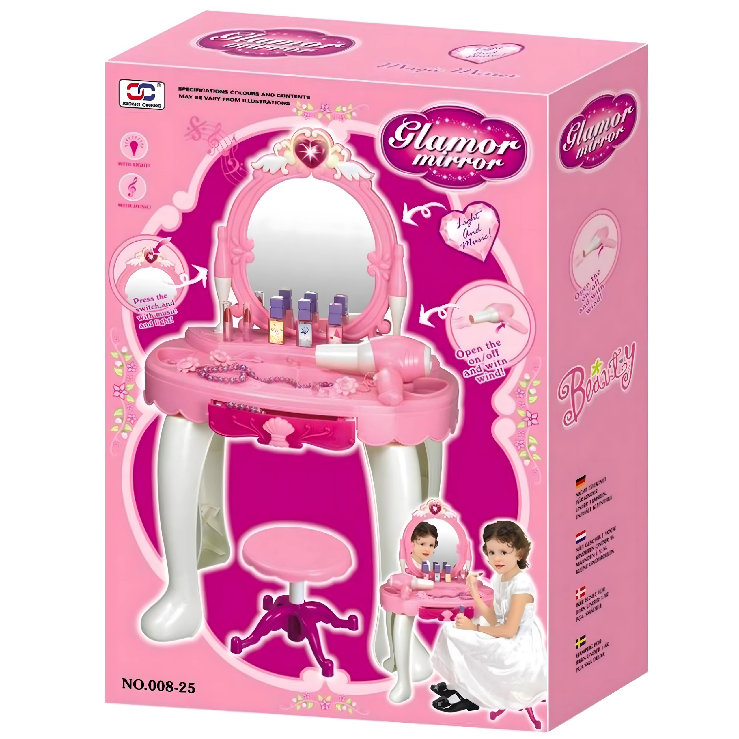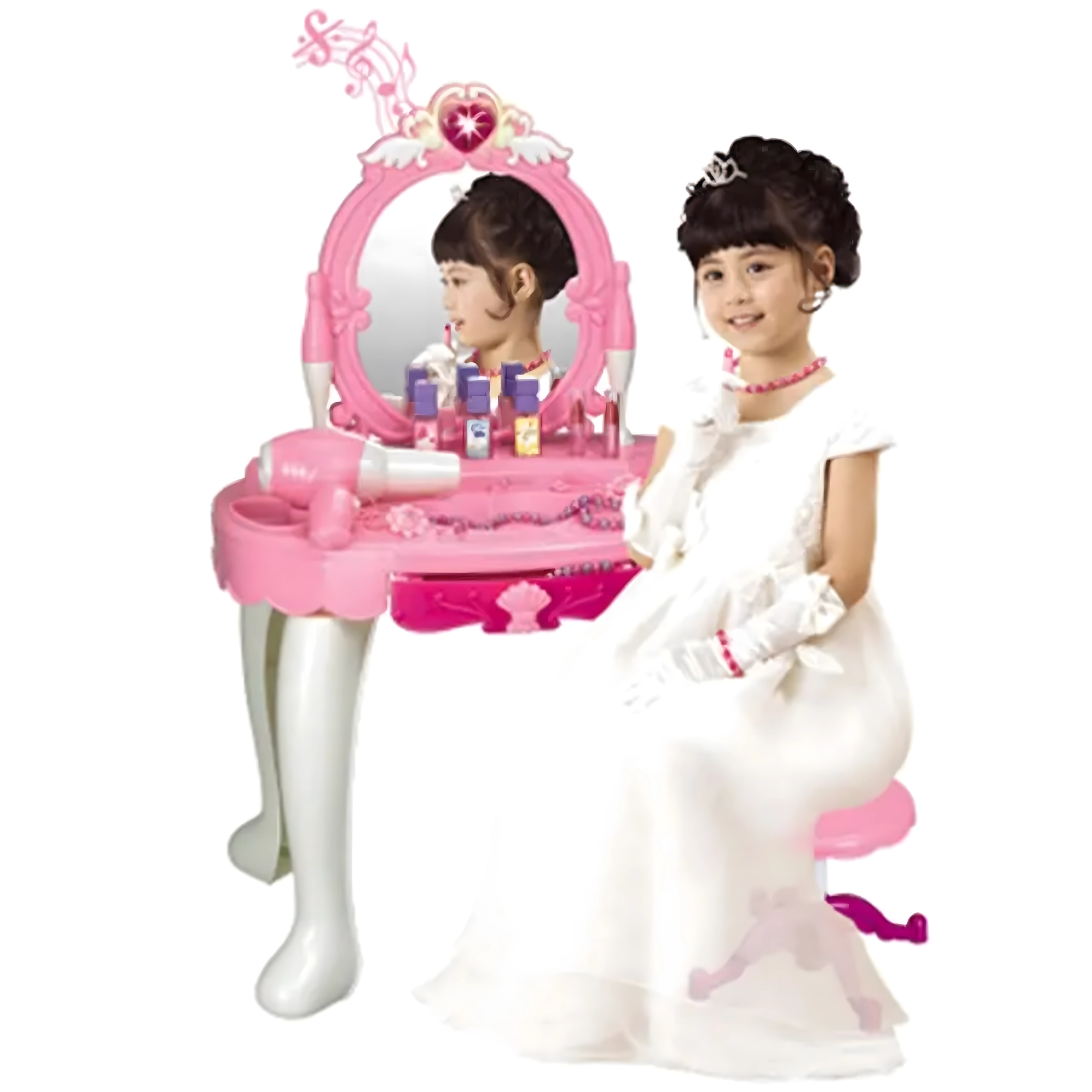 Această elegantă măsuță de toaletă pentru copii, în nuanțe de roz, oferă o oglindă sigură, o construcție din plastic durabil și un taburet confortabil. Include un set variat de accesorii – pieptene, bijuterii, „parfumuri”, rujuri și alte recuzite cosmetice – pentru ca fiecare joc de salon de înfrumusețare să fie desăvârșit. Efectele integrate și uscătorul de jucărie funcțional, pe baterii, susțin distracția realistă.