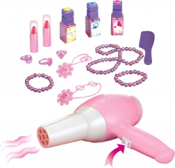 Setul include un uscător de păr pentru copii, pe baterii, care imită suflarea reală – o modalitate sigură și distractivă pentru un joc de coafor realist.