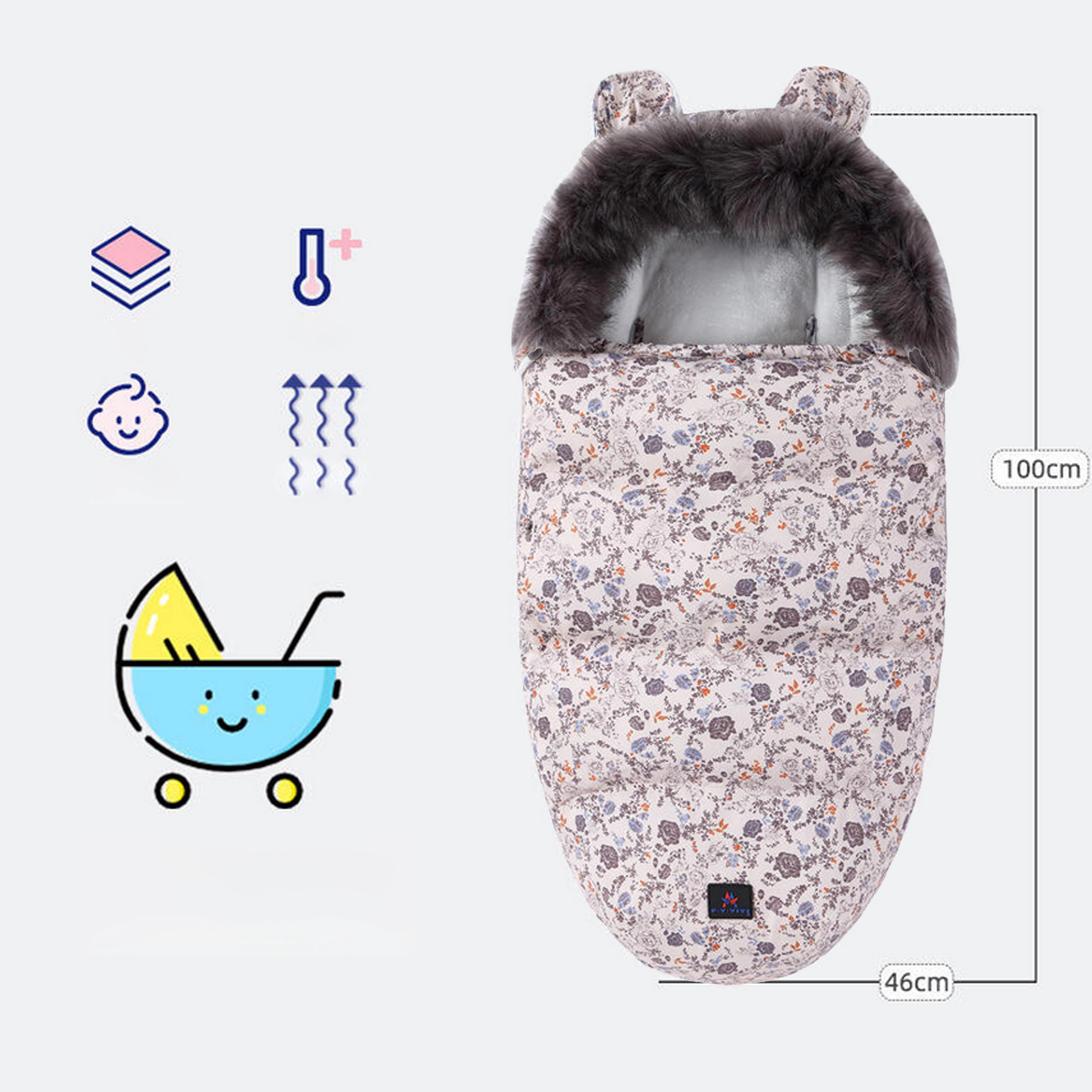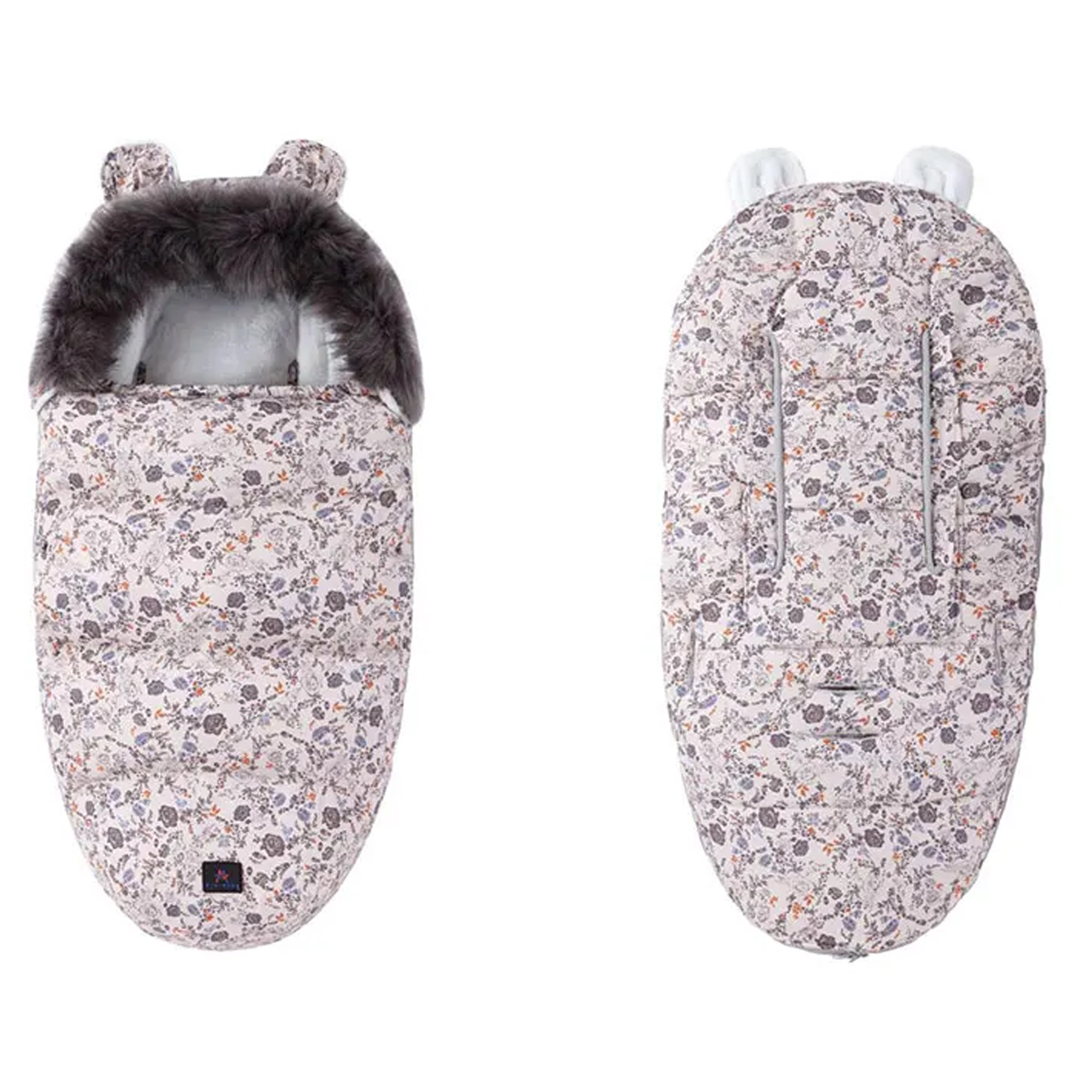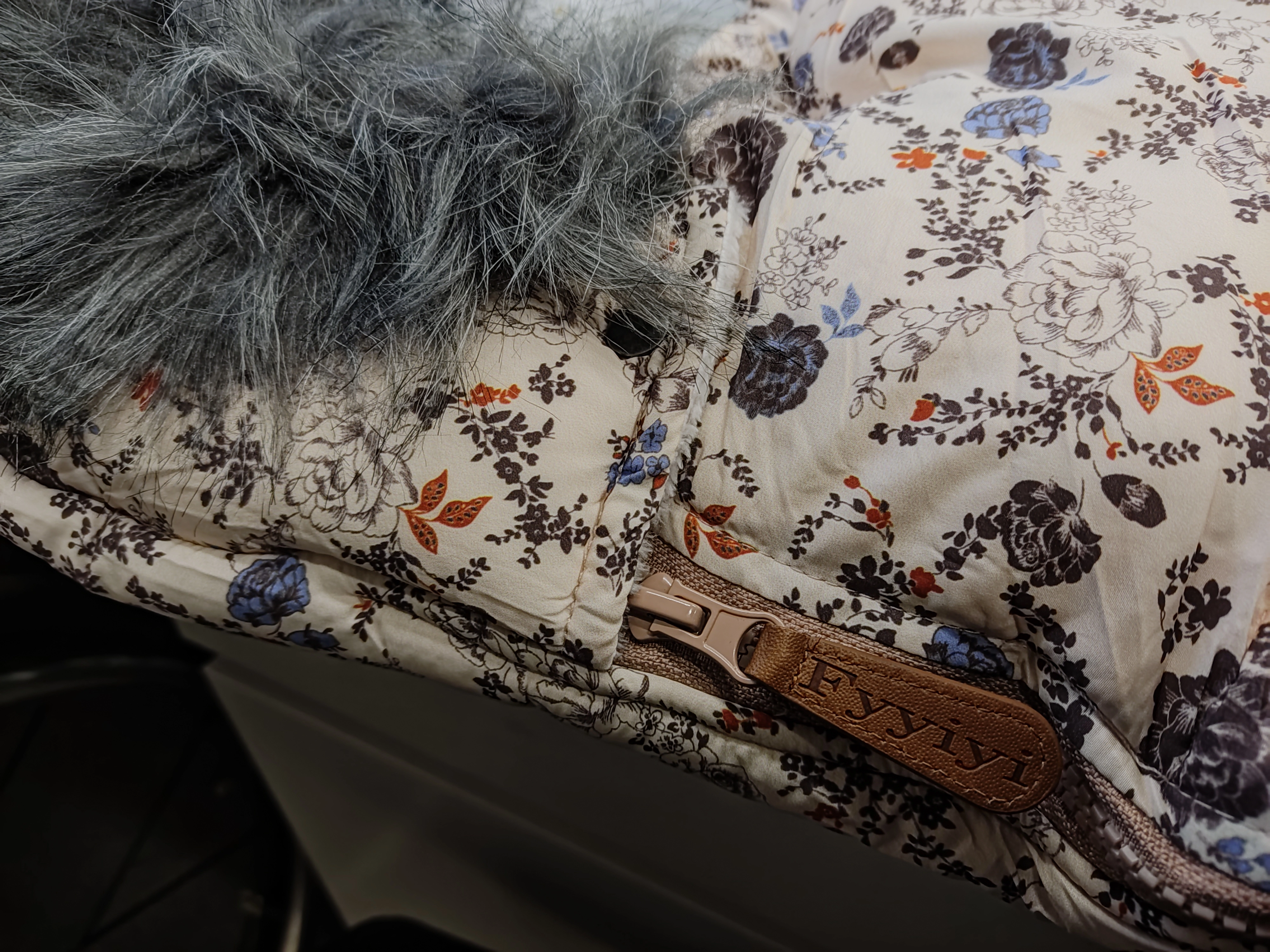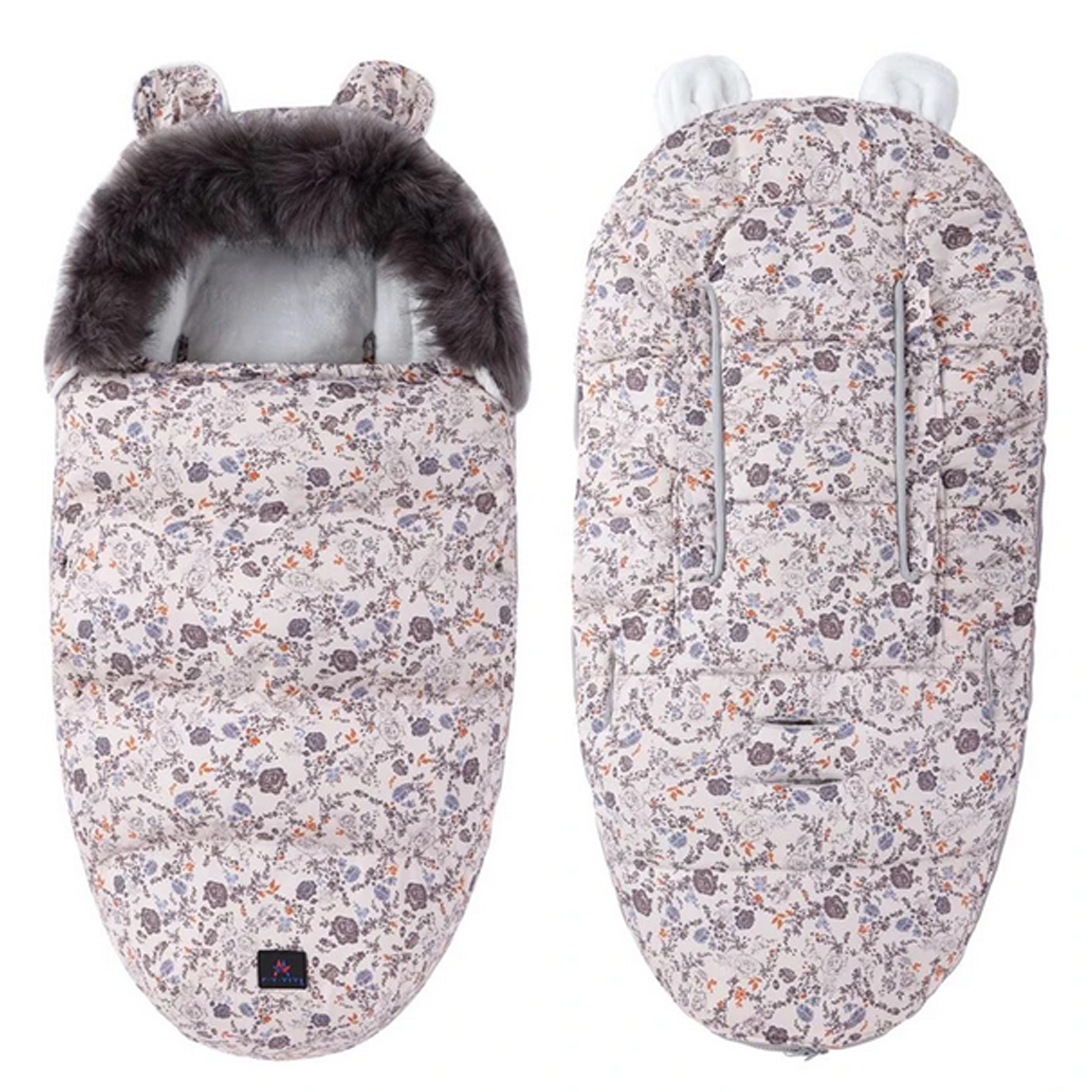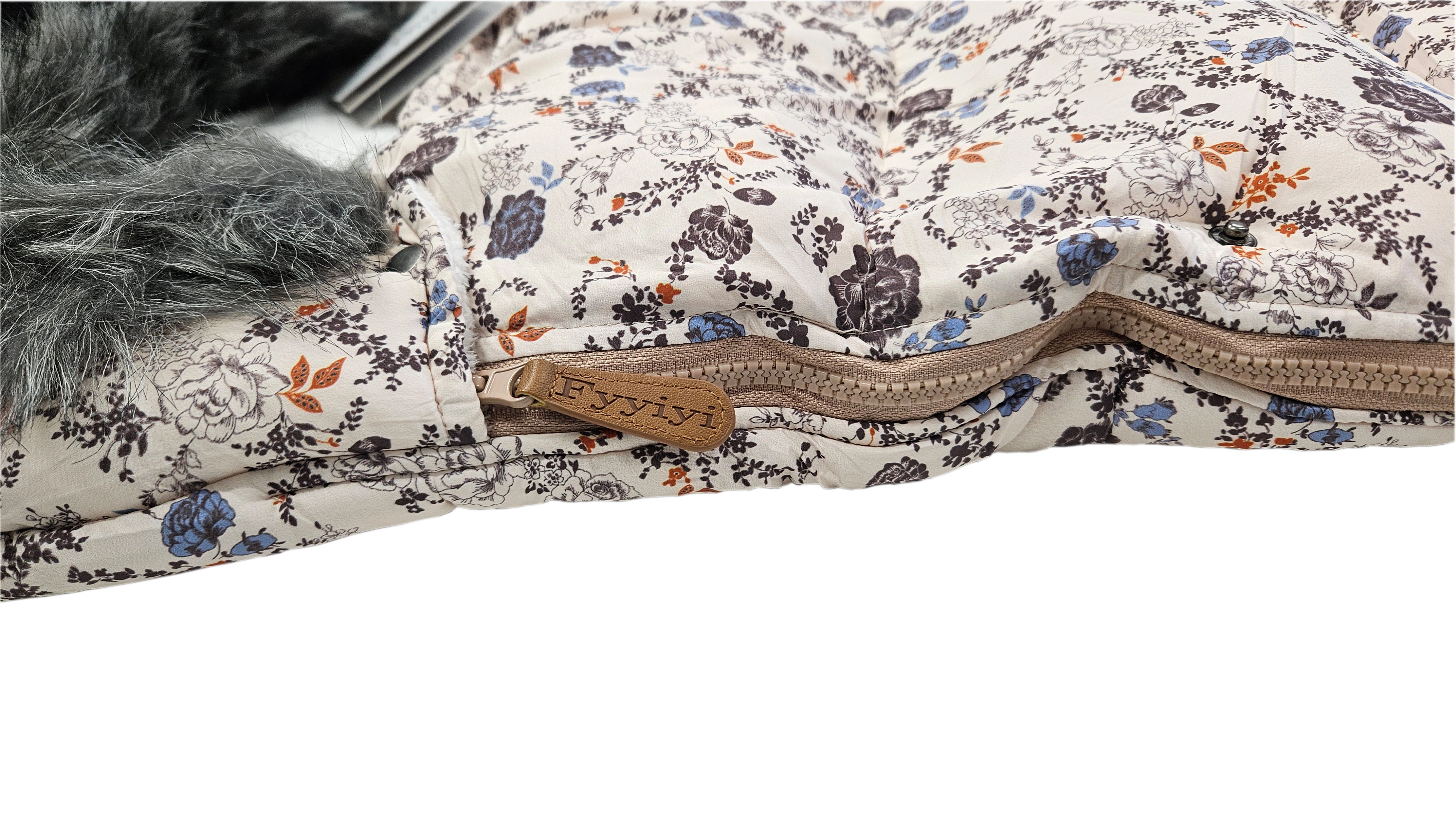 Sacul FYYIYI, stilat și funcțional, în design roz floral, este ideal pentru zilele reci. Țesătura exterioară rezistentă protejează de zăpadă și vânt, în timp ce căptușeala moale și călduroasă și microfleece-ul interior asigură confort la fiecare plimbare. Gluga cu bordură din blăniță eco protejează căpușorul copilului de curent.