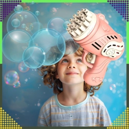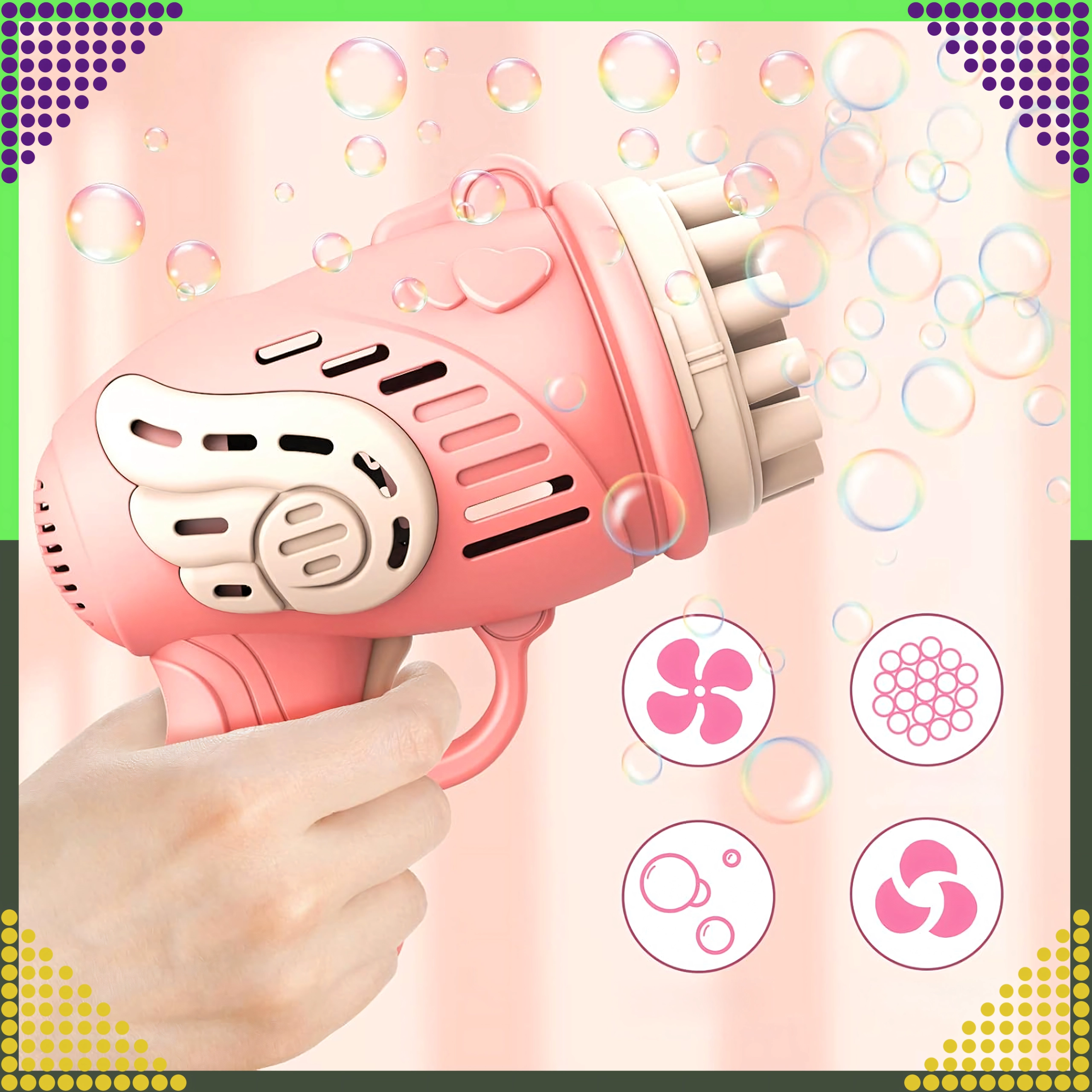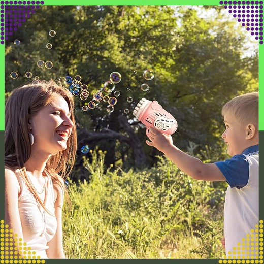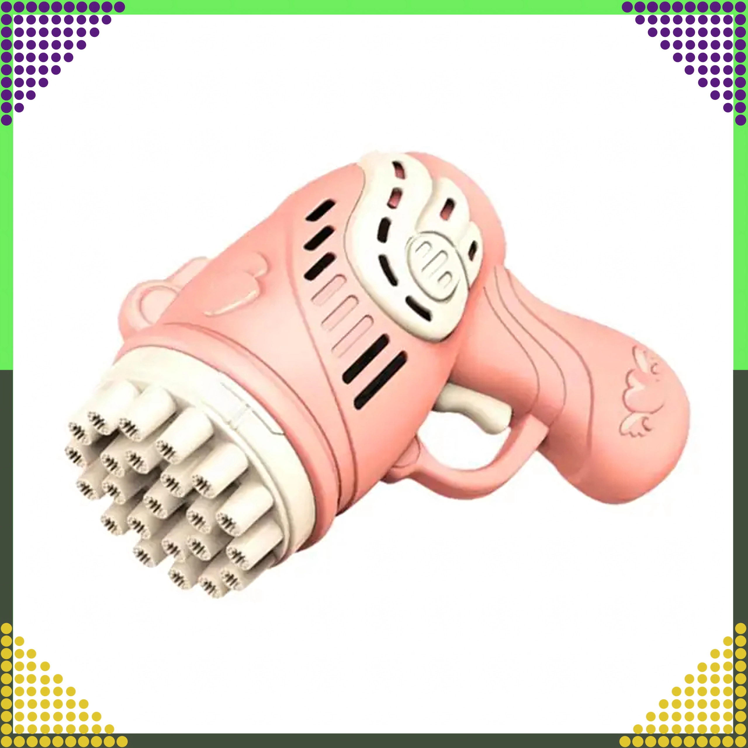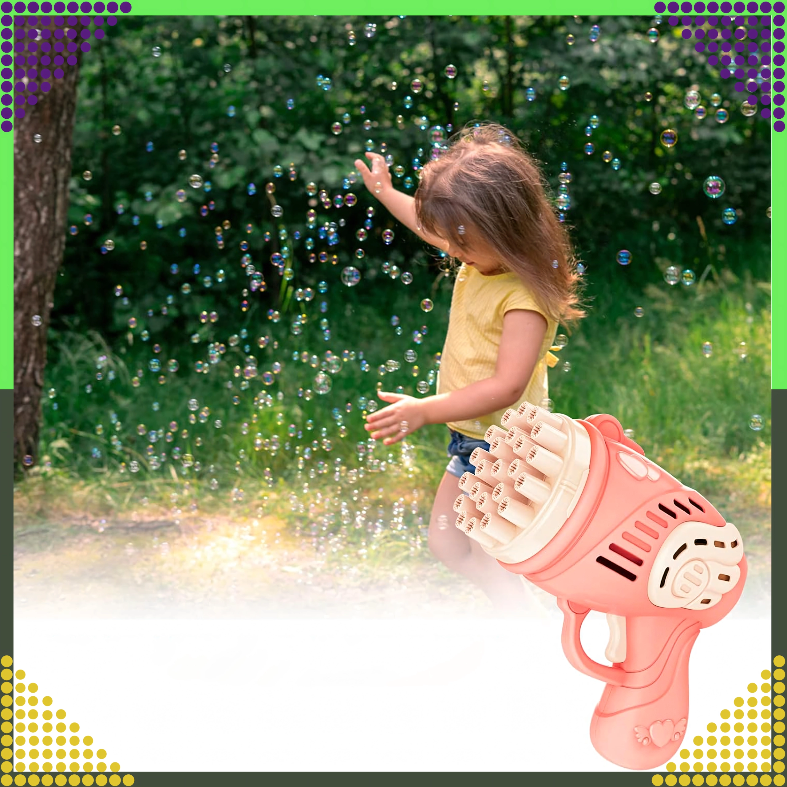 Descoperă magia baloanelor cu pistolul roz, care creează zeci până la sute de baloane curcubeu printr-o singură apăsare. Construcția ușoară, ergonomică și multiplele duze asigură un flux bogat de baloane pentru distracție de neuitat pentru copii și adulți.