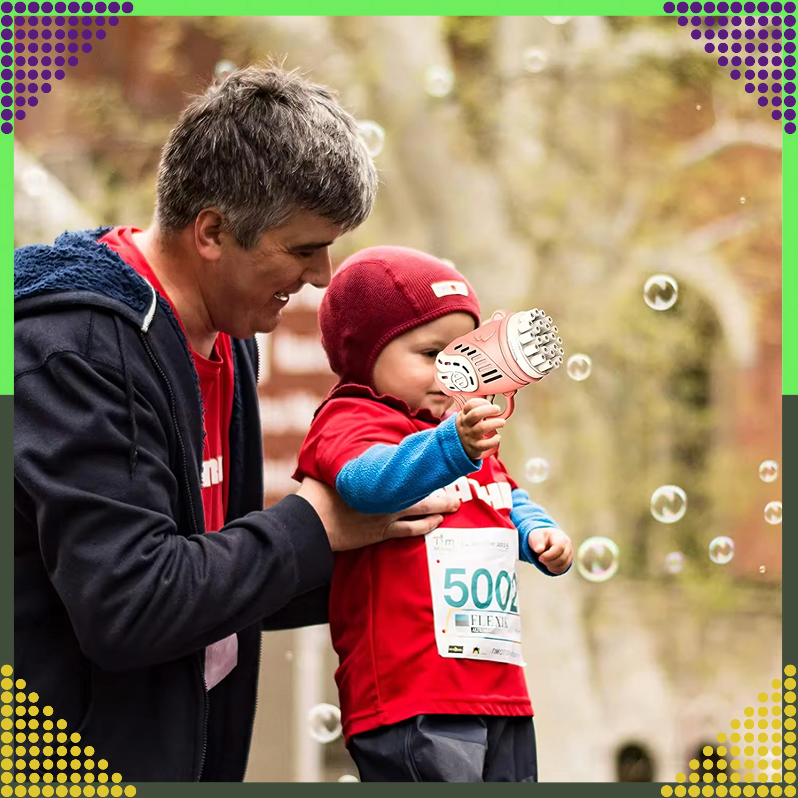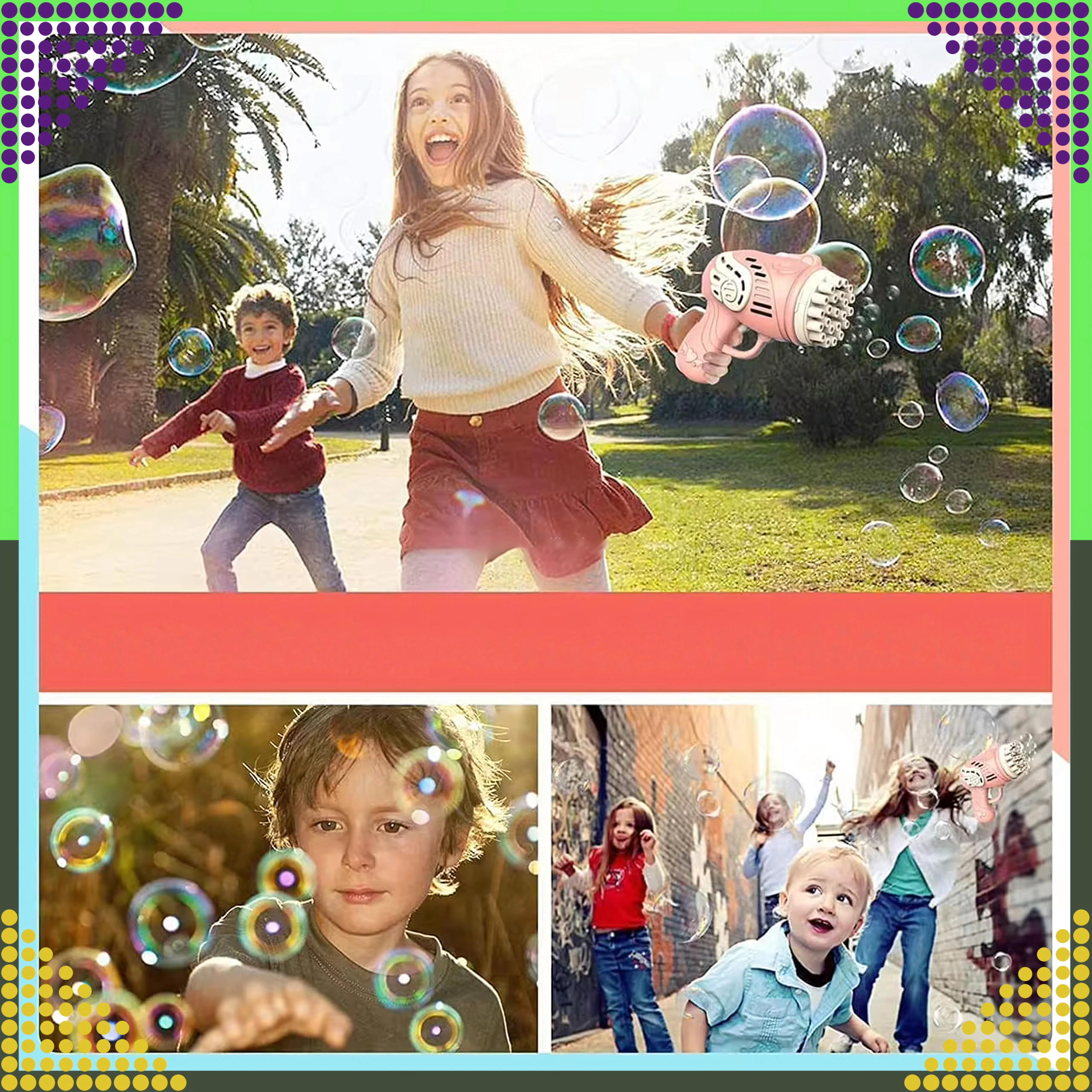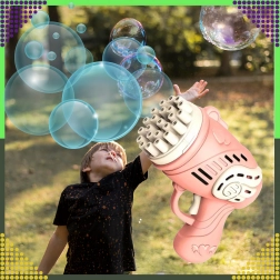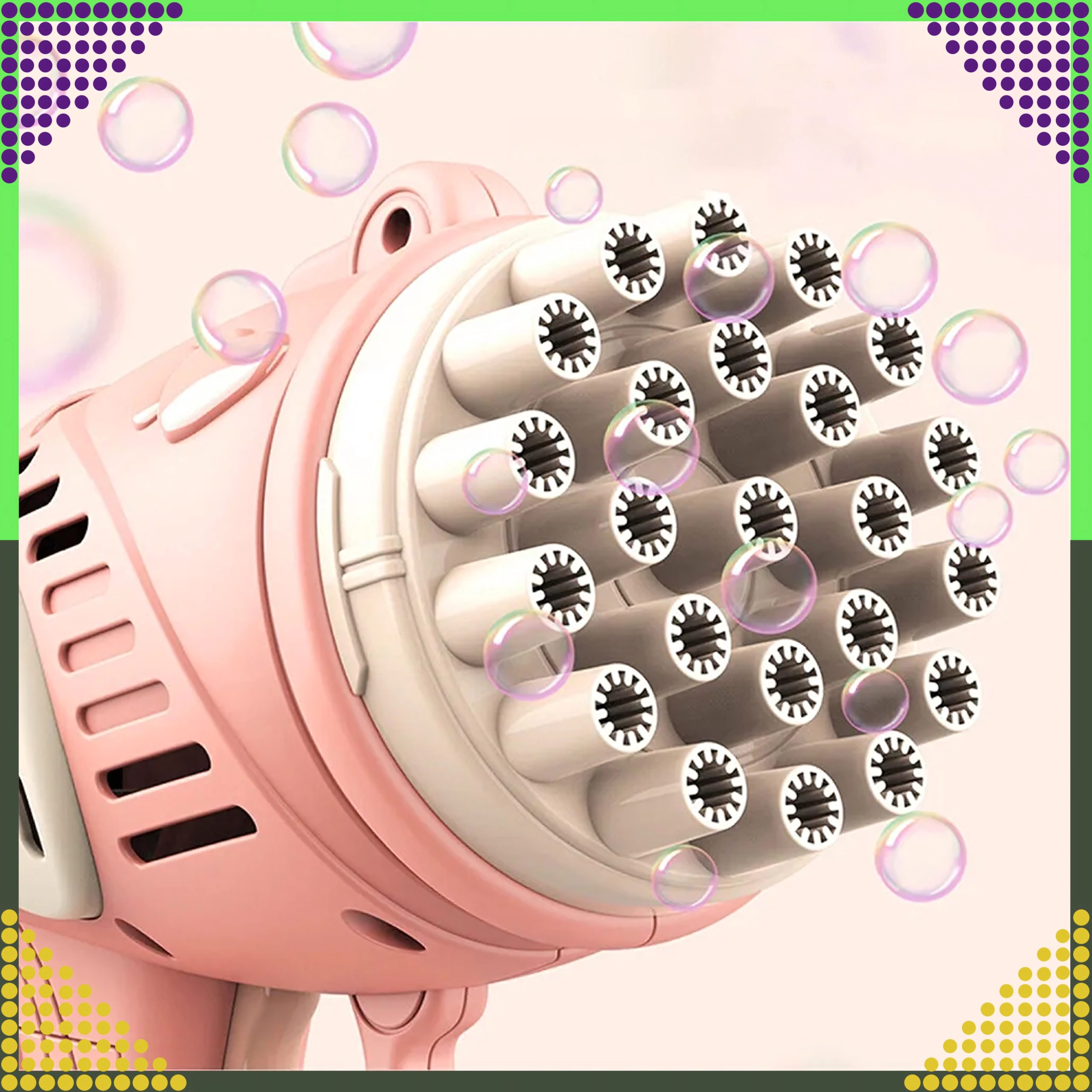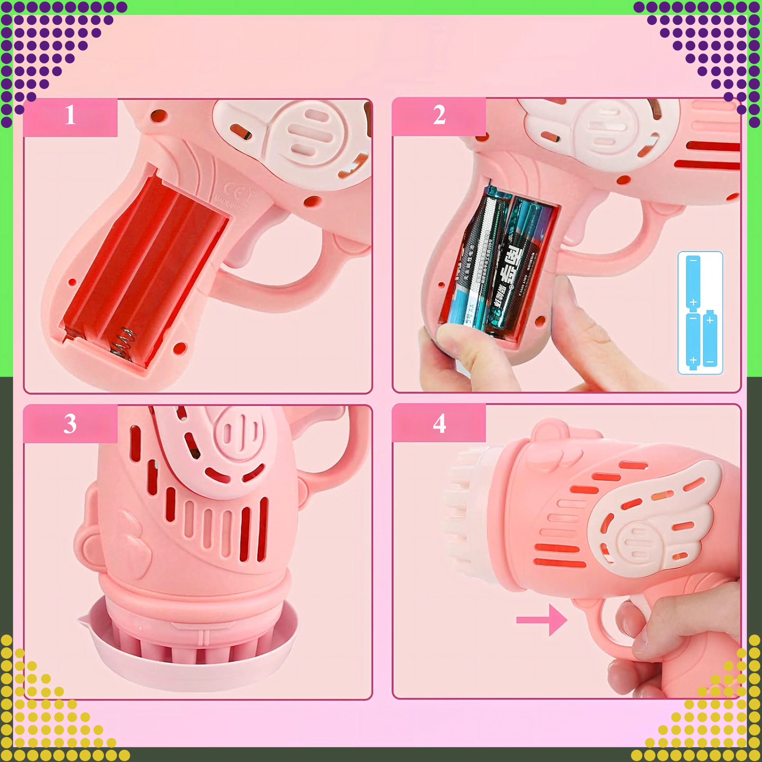 Descoperă magia baloanelor cu pistolul roz, care creează zeci până la sute de baloane curcubeu printr-o singură apăsare. Construcția ușoară, ergonomică și multiplele duze asigură un flux bogat de baloane pentru distracție de neuitat pentru copii și adulți.