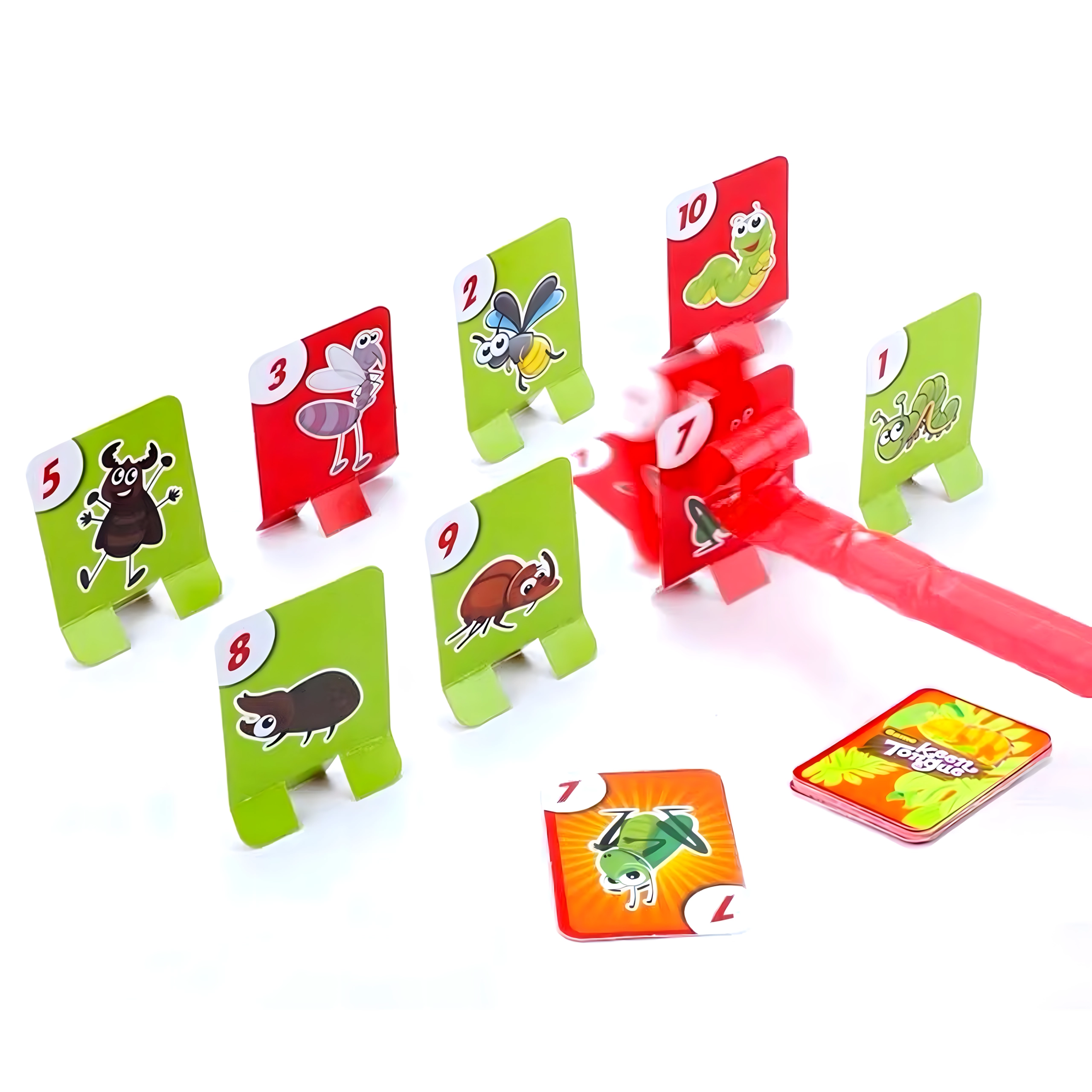 Setul include cărți ilustrate cu numere și insecte pentru diferite moduri de joc – de la prindere rapidă la potrivire și numărare de puncte.