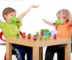 Măști ușoare, cu bandă elastică și „limbă” lansatoare transformă fiecare duel pentru cărți într-un spectacol de neuitat pentru toată familia.