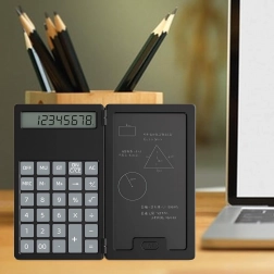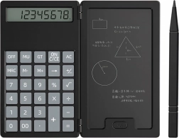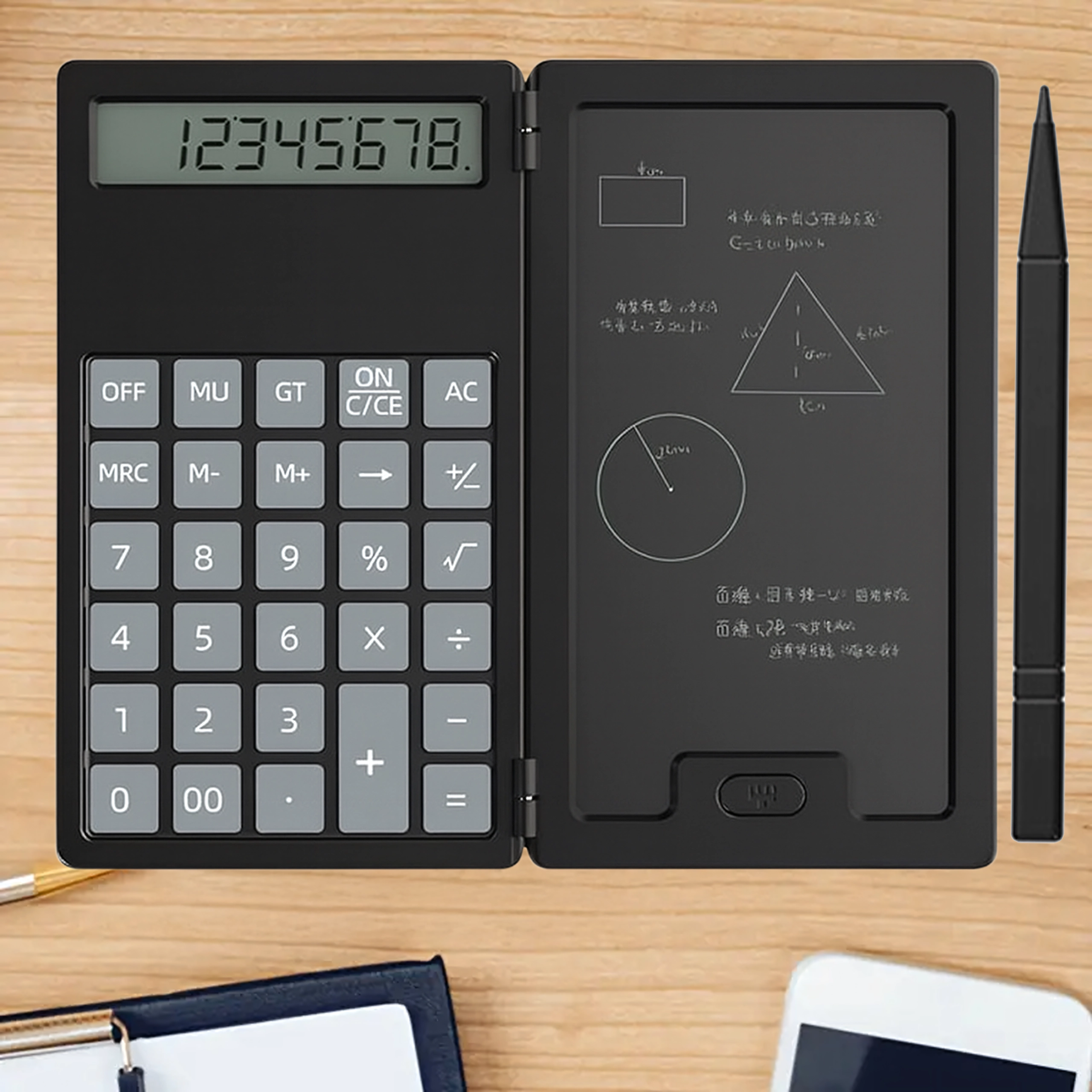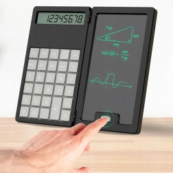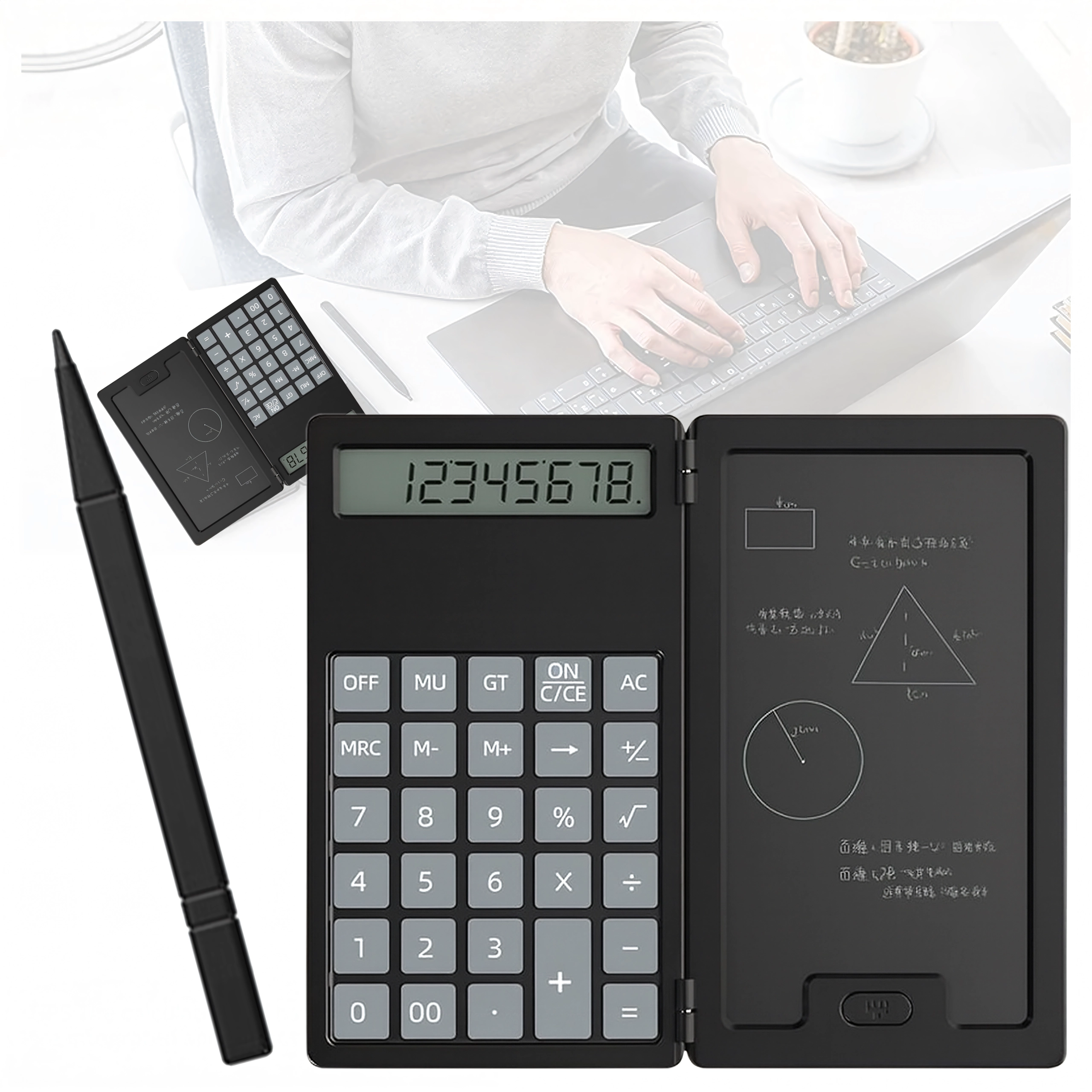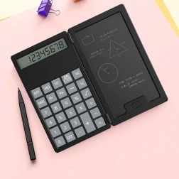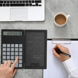 Acest calculator inteligent cu carcasă pliabilă combină calculul clasic cu o tablă LCD practică pentru notițe. Datorită designului ușor și subțire, îl poți pune cu ușurință în geantă sau buzunar, avându-l mereu la îndemână pentru calcule și notițe rapide.