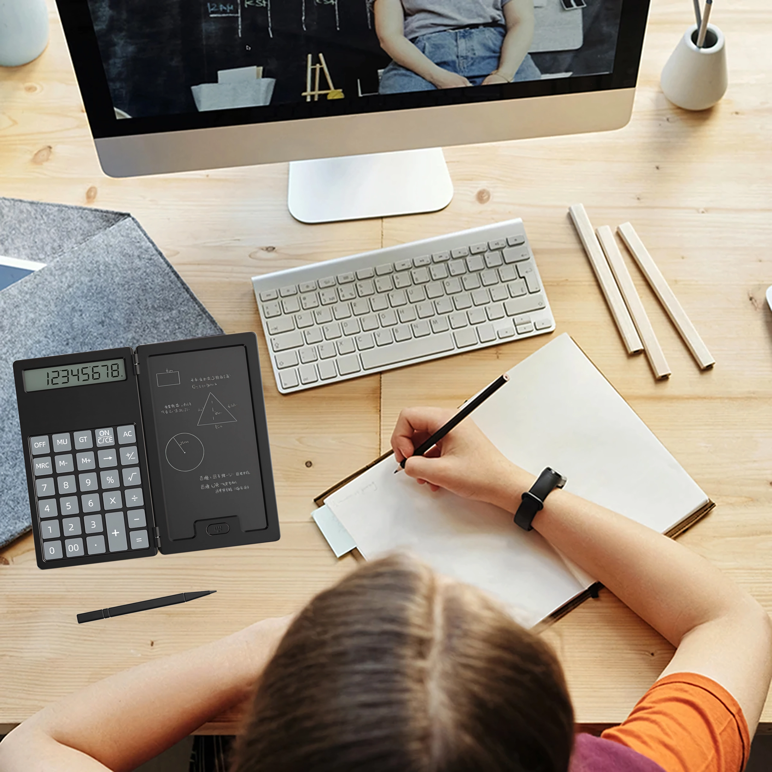 În stânga, un calculator precis; în dreapta, o suprafață LCD pentru notițe rapide – ideală pentru calcule, formule și schițe fără hârtie.