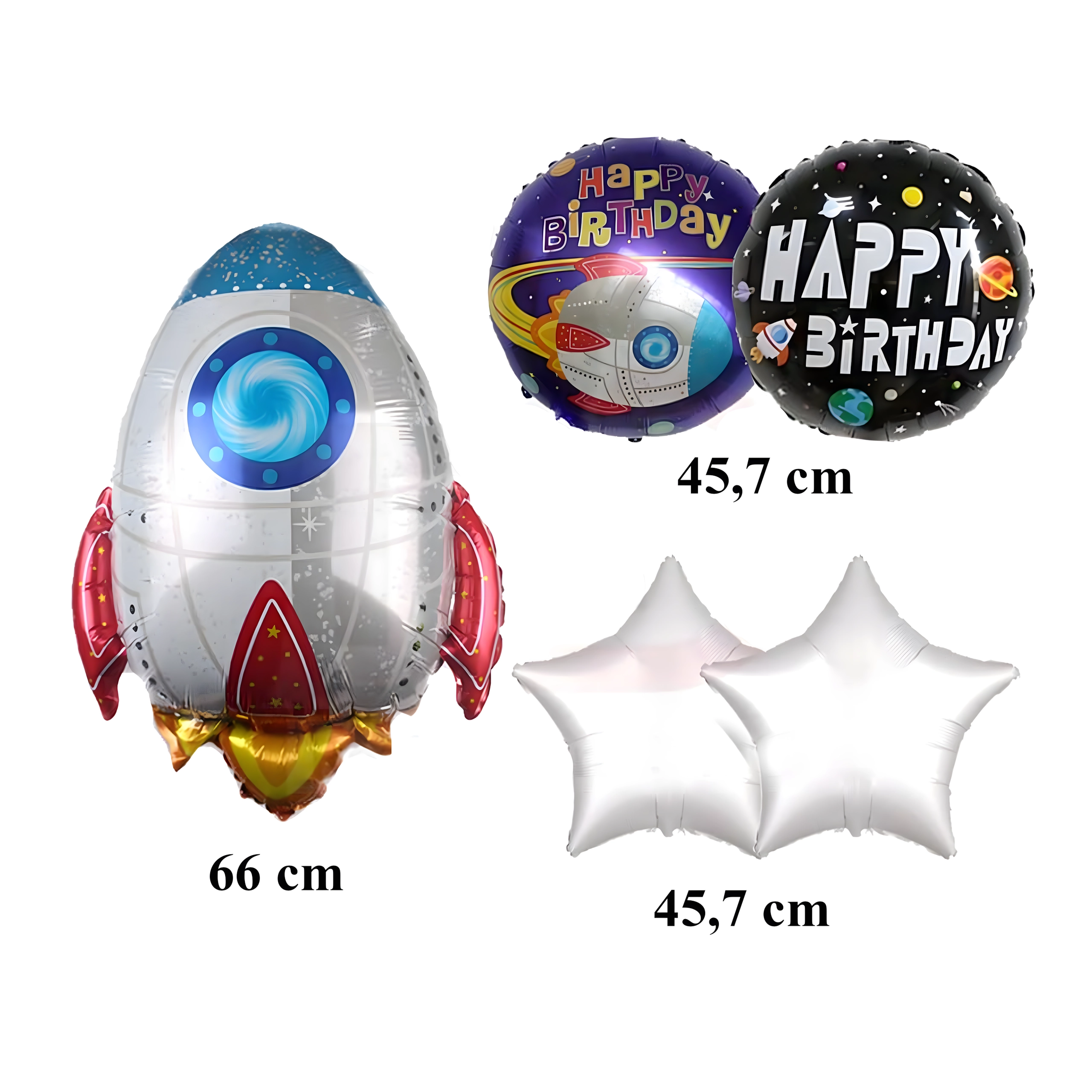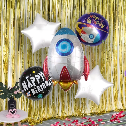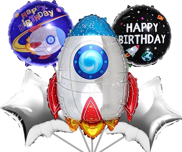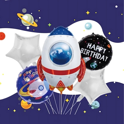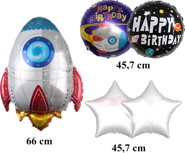 Transformă petrecerea într-o misiune spațială de neuitat. Baloanele din folie cu motive de rachetă, astronaut și stele strălucitoare creează o decorațiune impresionantă, care îi va încânta pe micii și marii exploratori. Datorită foliei de calitate, baloanele își păstrează forma și luciul pentru mai mult timp.