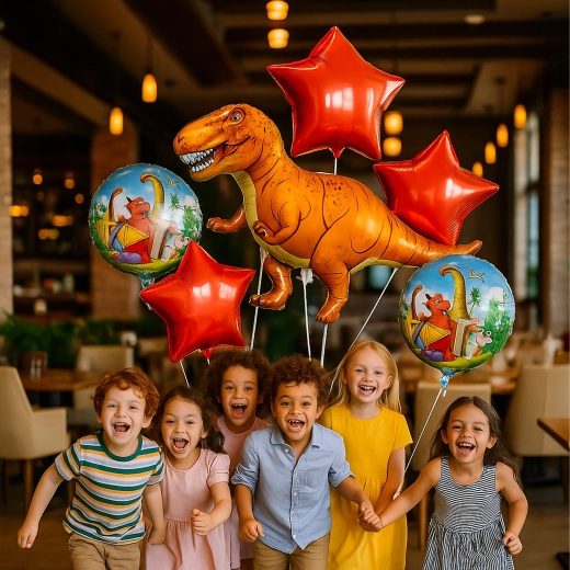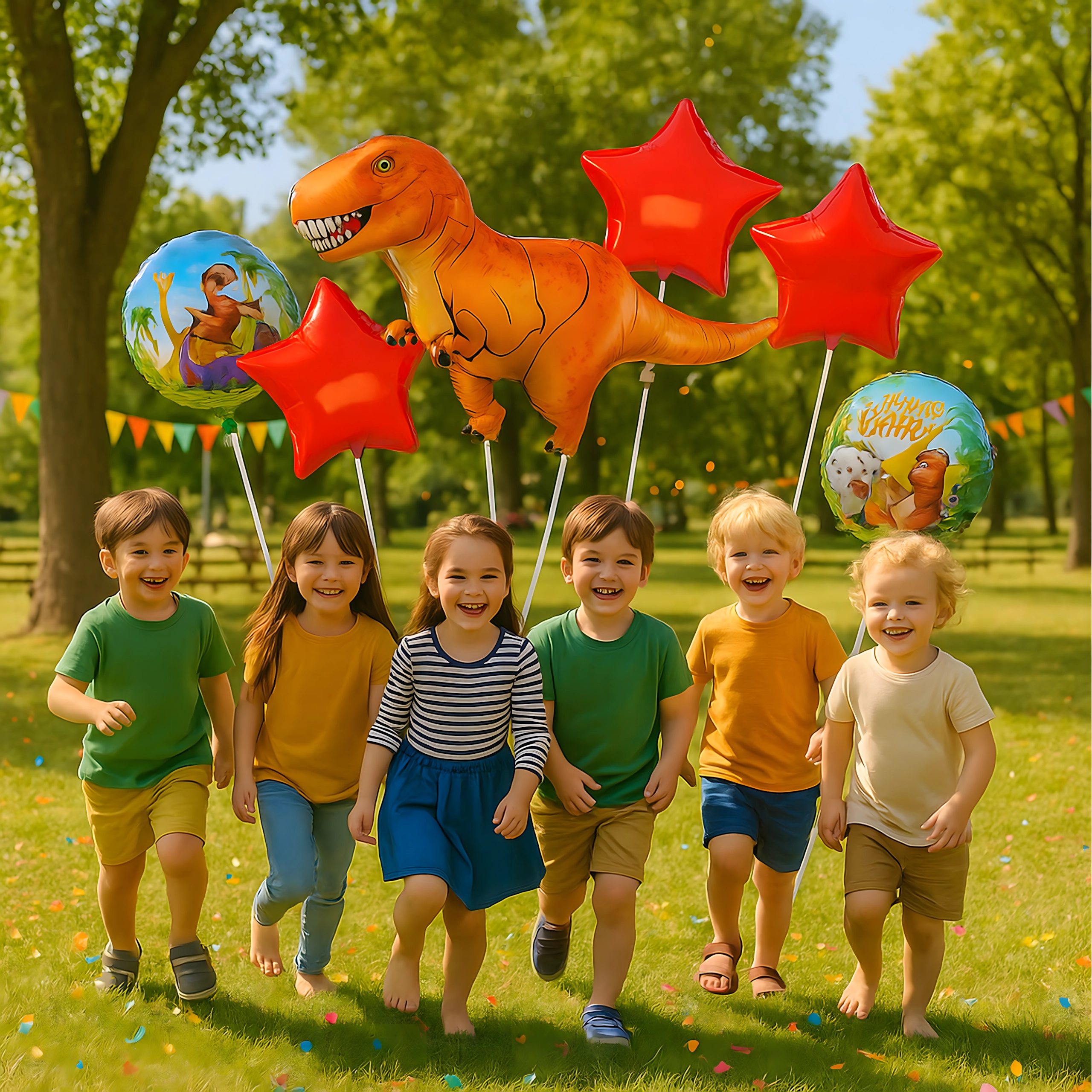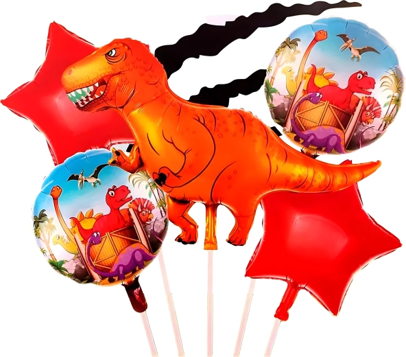 Un set vesel de baloane cu tematică dinozauri care va însufleți orice petrecere. Conține 1 balon mare cu dinozaur, 2 baloane imprimate și 2 stele roșii – alegerea perfectă pentru zile de naștere pentru copii și petreceri preistorice.