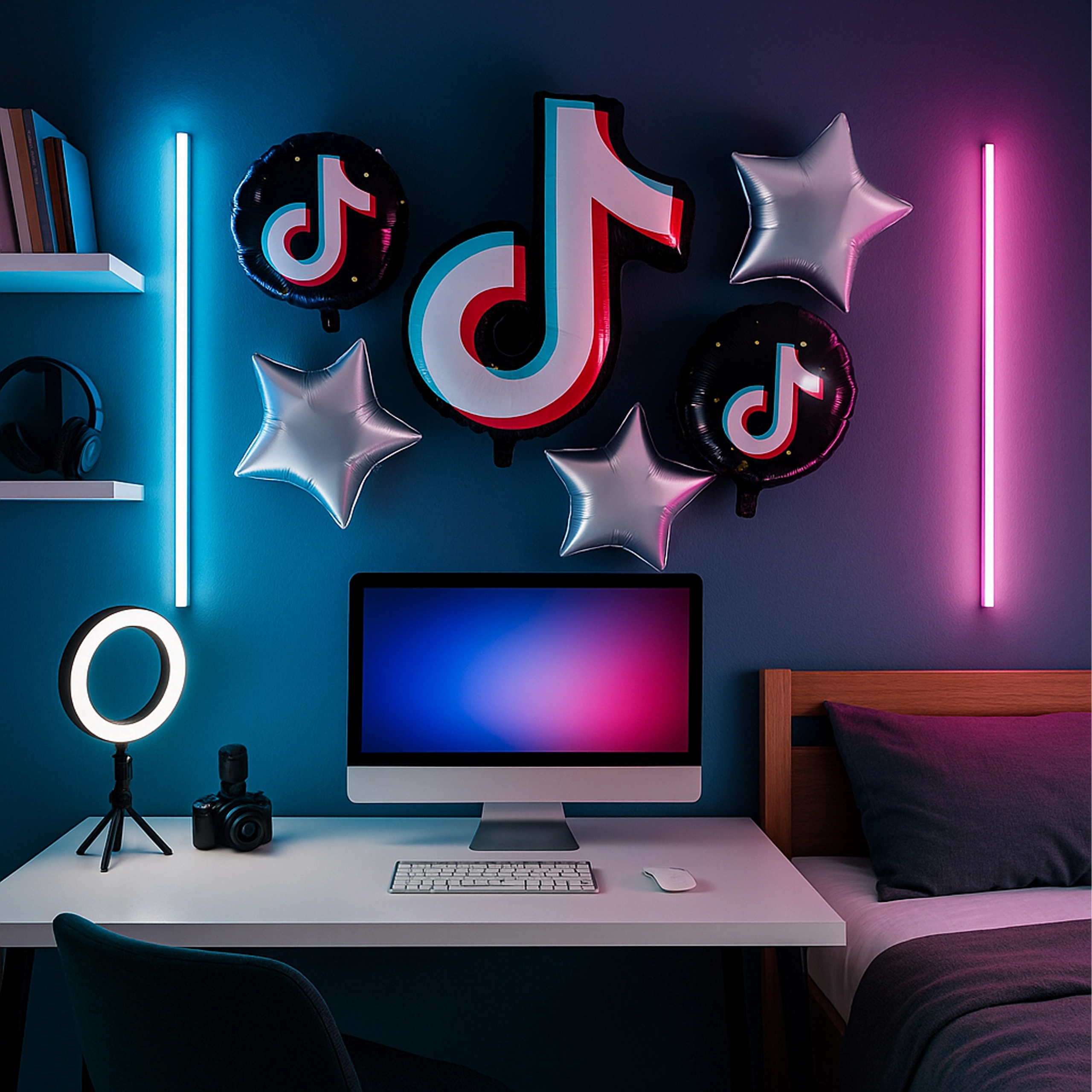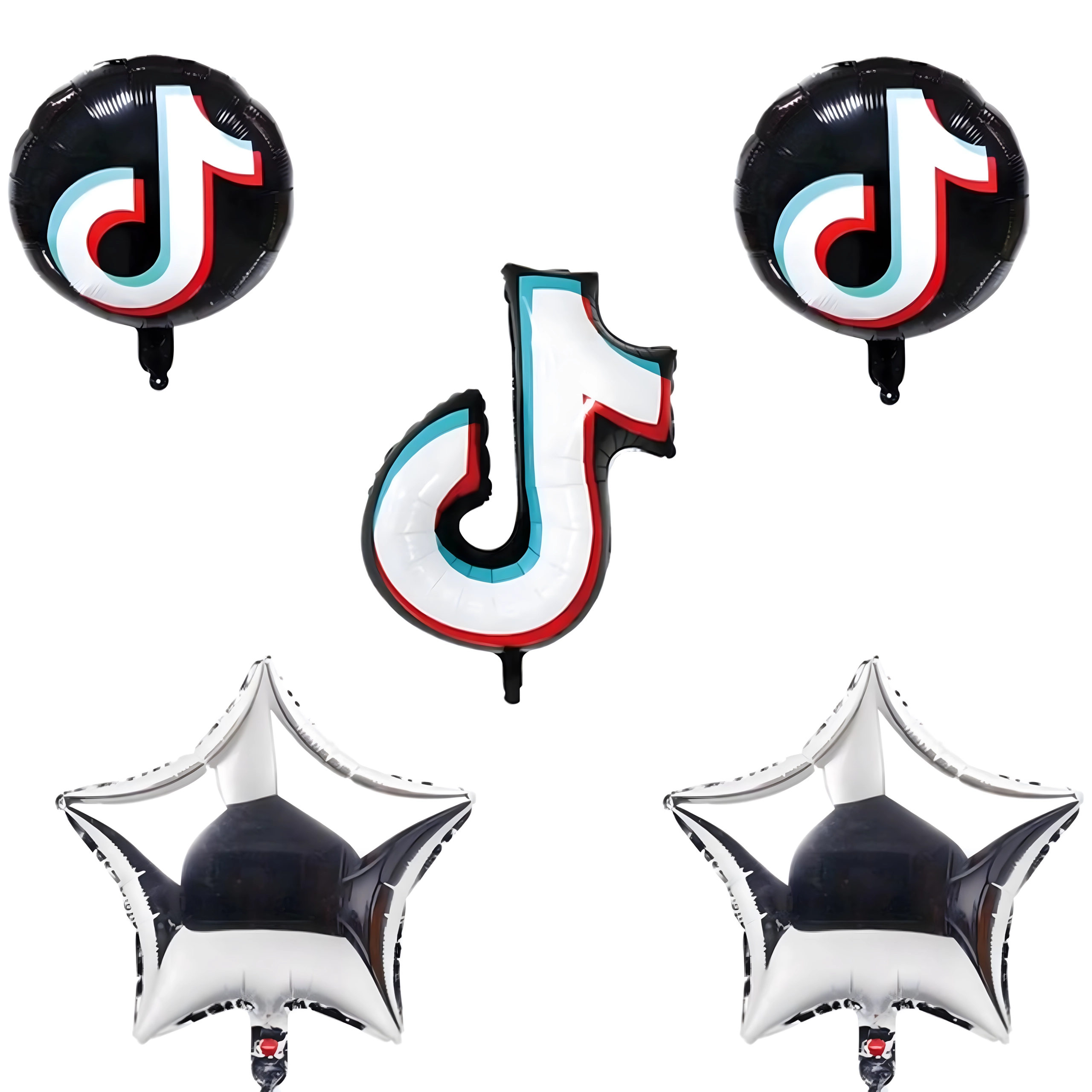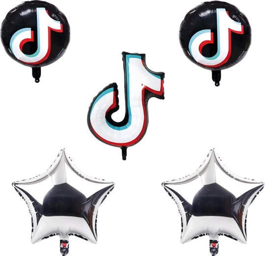 Set stilat de baloane inspirat de platforma TikTok, care transformă orice petrecere într-un eveniment trendy. Conține o notă muzicală mare din folie, 81,2 cm, 2 baloane rotunde negre TikTok, 45,7 cm și 2 steluțe argintii – ideale pentru aniversări, party și colț foto.