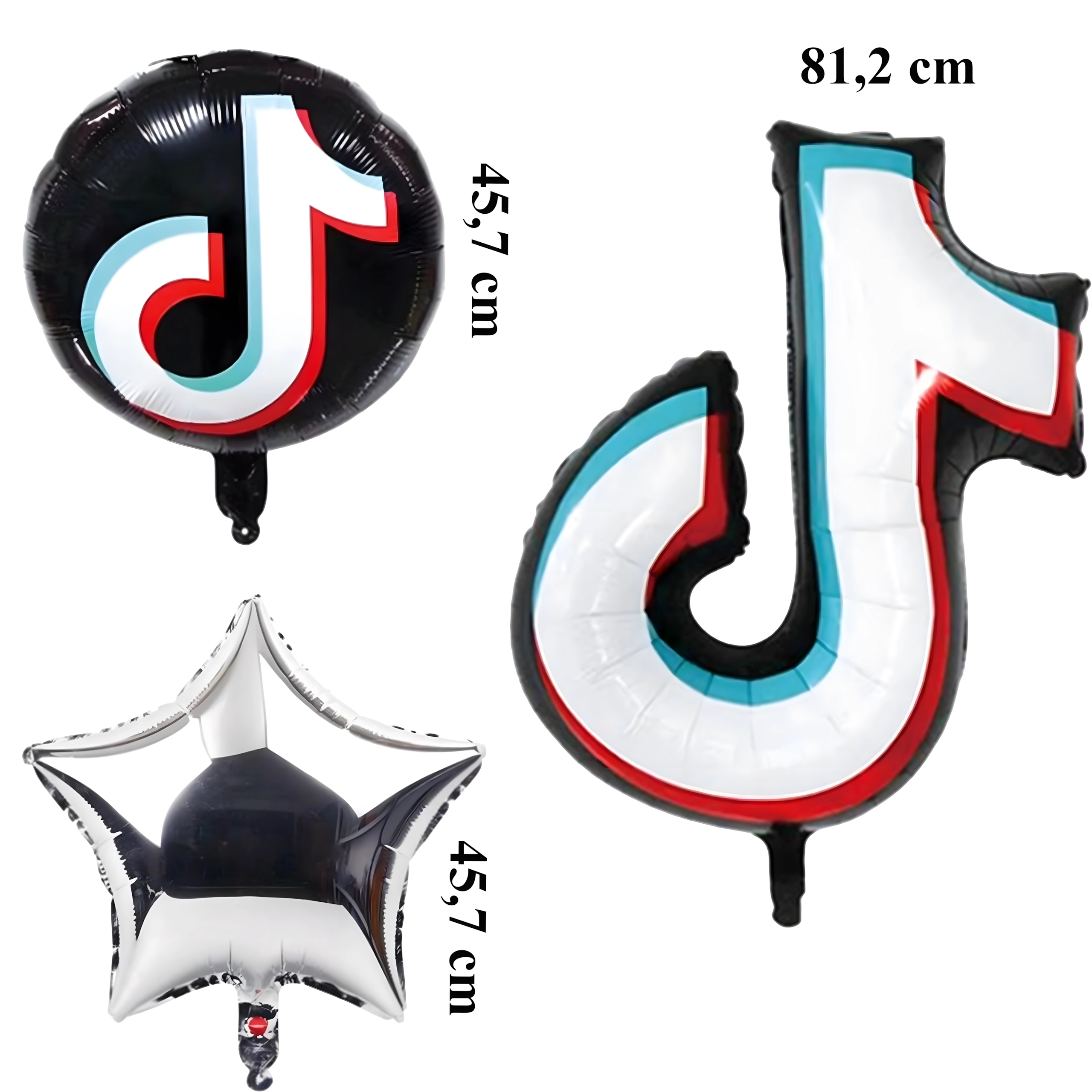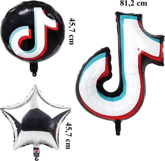 - Conținutul setului: 1× notă muzicală din folie 81,2 cm, 2× balon rotund negru TikTok 45,7 cm, 2× steluță argintie