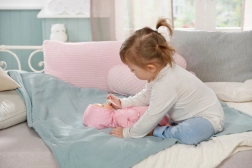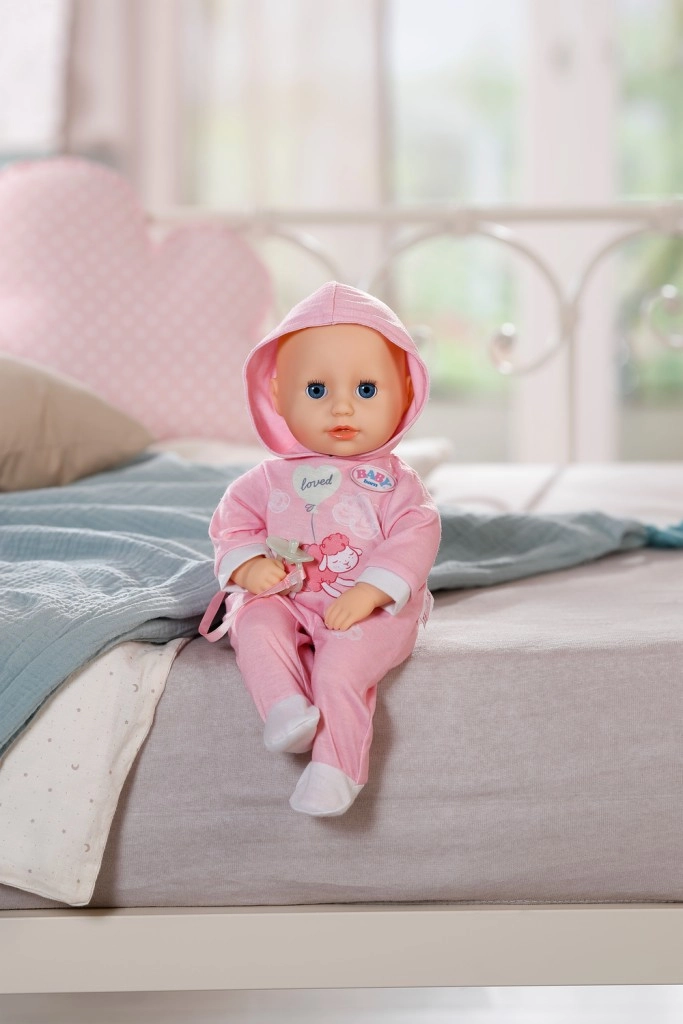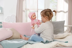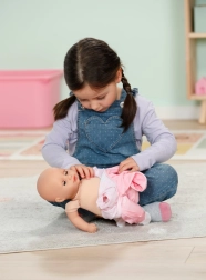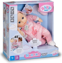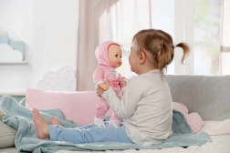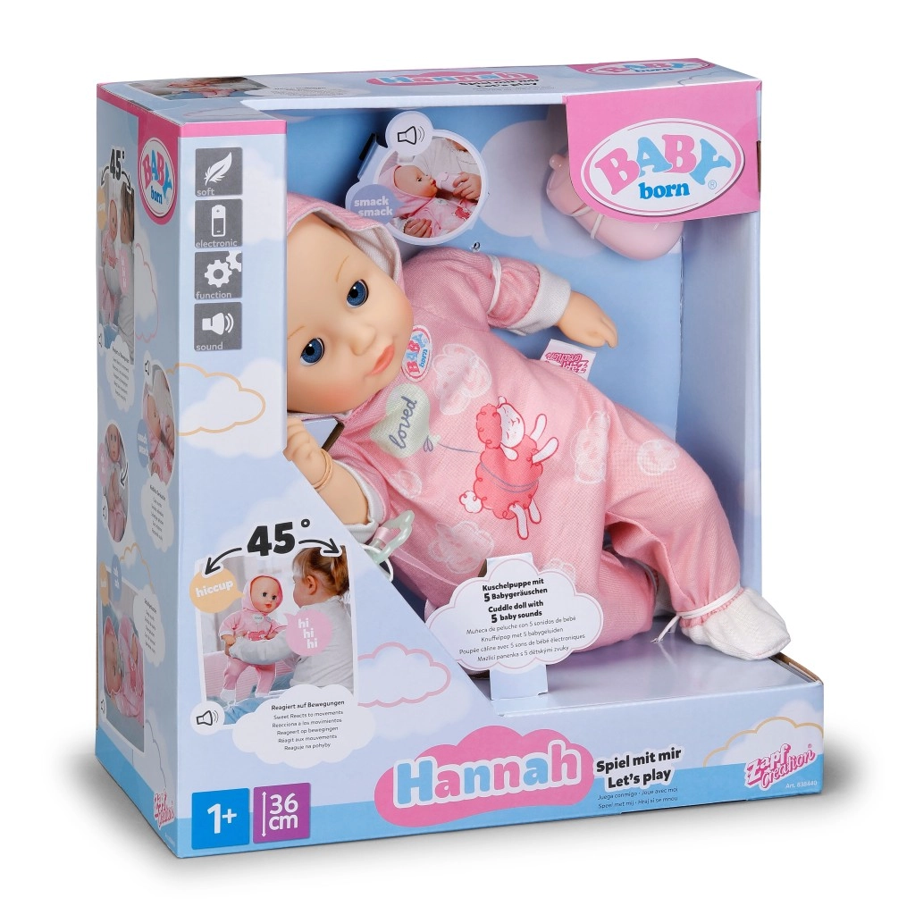 Descoperă farmecul jocurilor de îngrijire cu păpușa BABY born Hannah – hai să ne jucăm. Datorită corpului moale, este plăcută la atingere, stă minunat în brațe și invită la alint. Copiilor le va plăcea interacțiunea simplă – păpușa scoate sunete dulci de bebeluș, la hrănirea cu biberonul se aud sunete drăgălașe de băut, iar la adormire toarce ușor și închide ochii.