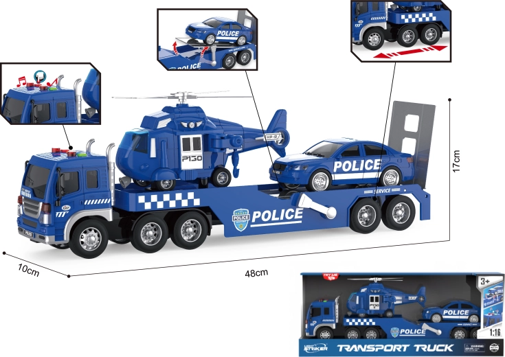 Acest set de poliție bogat echipat aduce copiilor intervenții realiste și operațiuni de salvare. Autospeciala cu remorcă oferă o rampă mobilă pentru încărcare și descărcare ușoară, în timp ce elicopterul cu rotori rotativi și cârlig de salvare extinde posibilitățile de joc. Efectele luminoase și sonore integrate, activate prin butoanele de pe acoperișul cabinei, sporesc autenticitatea.
