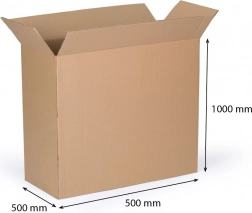 Cutie de carton cu clapete robustă din carton ondulat în cinci straturi, cu dimensiunile 500 × 500 × 1000 mm, ideală pentru ambalarea, depozitarea și transportul în siguranță al obiectelor voluminoase. Oferă rezistență ridicată, stabilitate și utilizare universală; se livrează plată pentru economisirea spațiului.