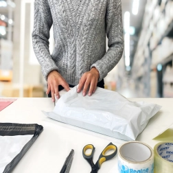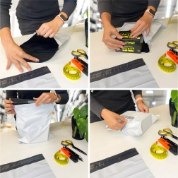 Introduceți produsul, dezlipiți folia de protecție, lipiți și aplicați eticheta. Ideal pentru expediere eficientă în e‑shopuri.