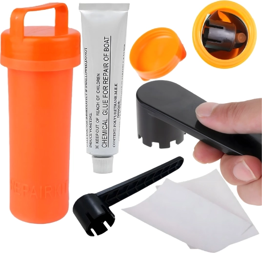 Tubul portocaliu compact protejează în siguranță adezivul, peticele și uneltele împotriva apei și murdăriei. Încape cu ușurință în rucsac sau în sacul etanș, ca să fiți pregătiți pentru o reparație rapidă oricând.