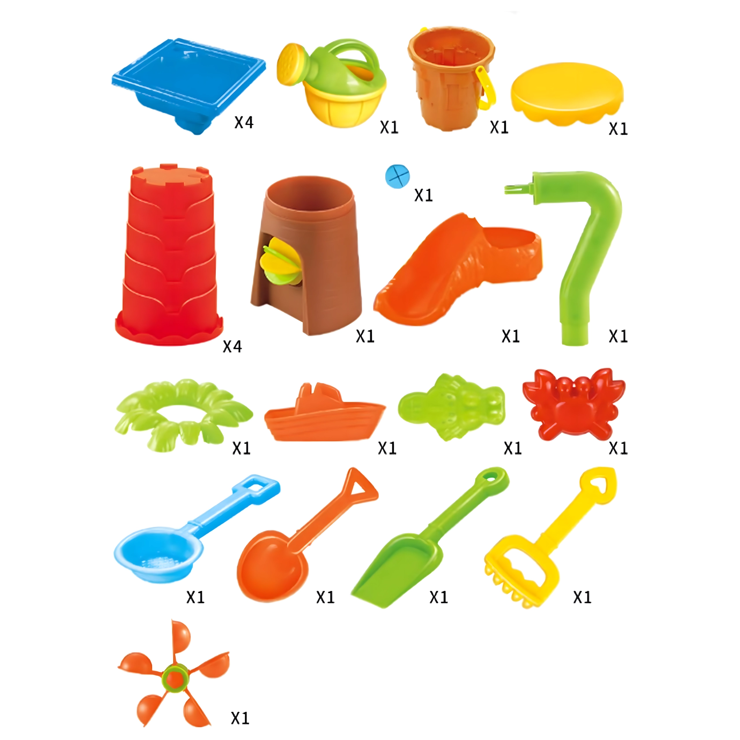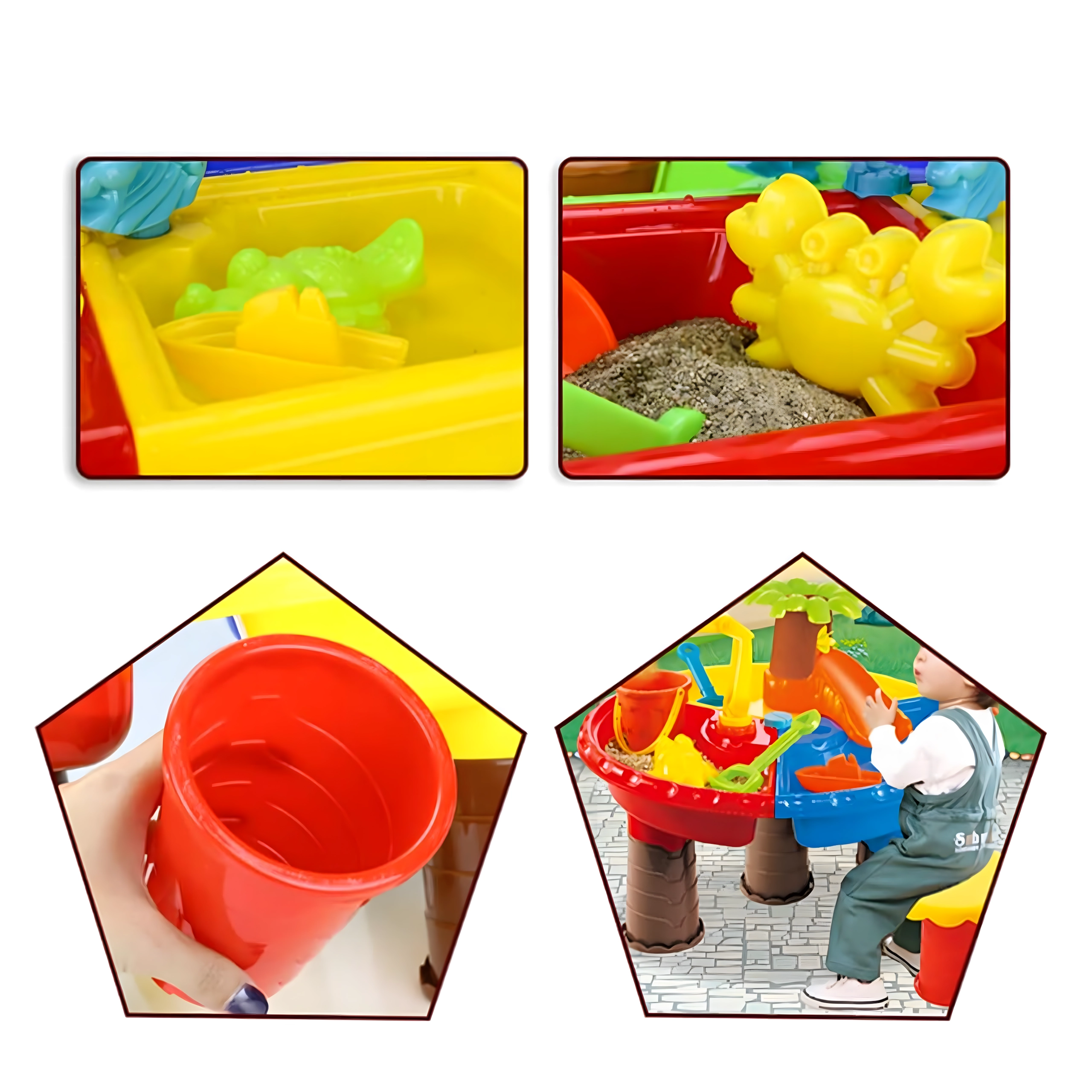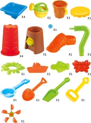 Include un set bogat de accesorii: stropitoare, lopeți, greblă, sită, forme, pahare, tobogan și scăunel. Copiii pot lua, turna, cerne și modela forme, dezvoltând motricitatea fină, coordonarea mână–ochi și imaginația.