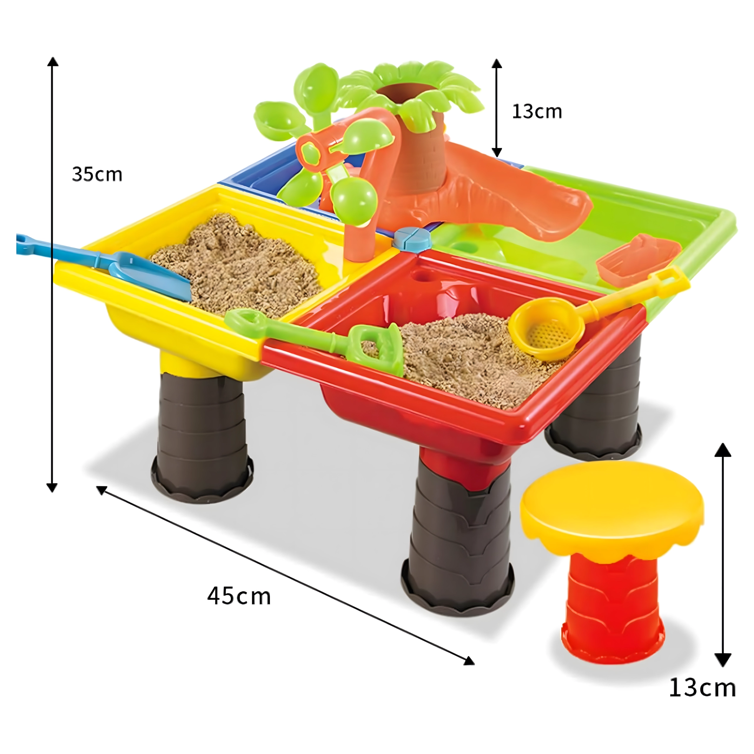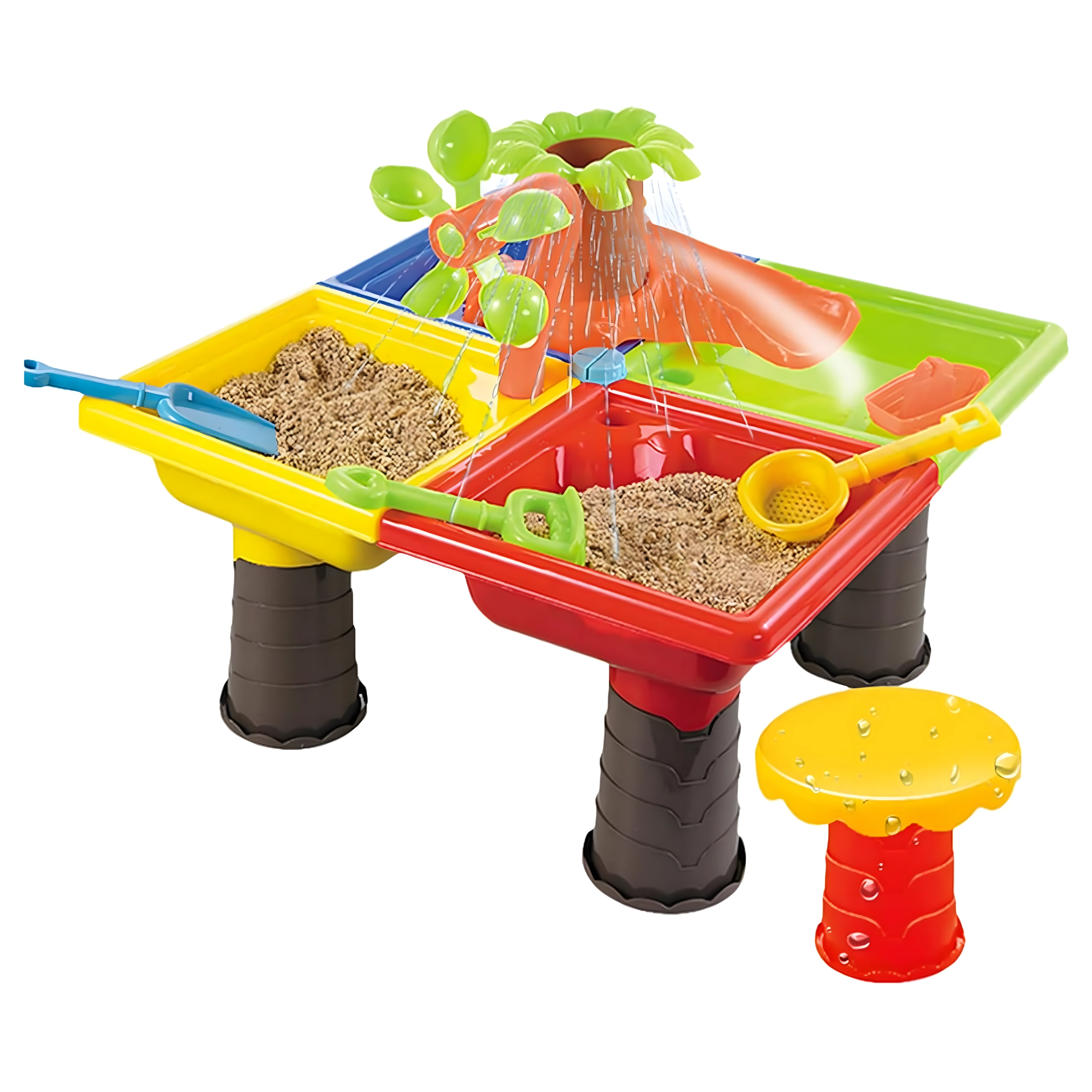 Această măsuță multifuncțională pentru apă și nisip oferă copiilor ore întregi de distracție senzorială. Cele patru compartimente permit combinarea activităților cu apă și nisip, iar elementul central cu „palmier” și rotițe transformă fiecare turnare într-un mic spectacol. Construcția ușoară și durabilă se curăță ușor, iar picioarele stabile asigură joacă în siguranță atât afară, cât și în casă.