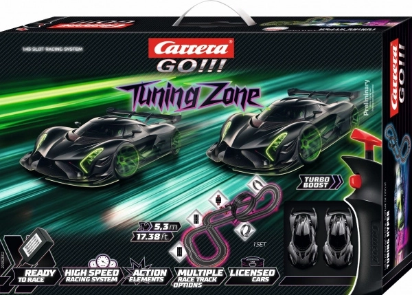 Pista auto CARRERA GO Tuning Zone aduce o cursă plină de adrenalină pe circuitul tău de acasă. Pe o lungime de 5,3 metri te așteaptă o combinație variată de elemente: looping, perete vertical, intersecție, îngustare, linii drepte rapide și viraje tehnice. Două vehicule hypercar detaliate la scara 1:43 sunt pregătite de duel, iar controlerele cu funcție Turbo duc viteza la maximum.