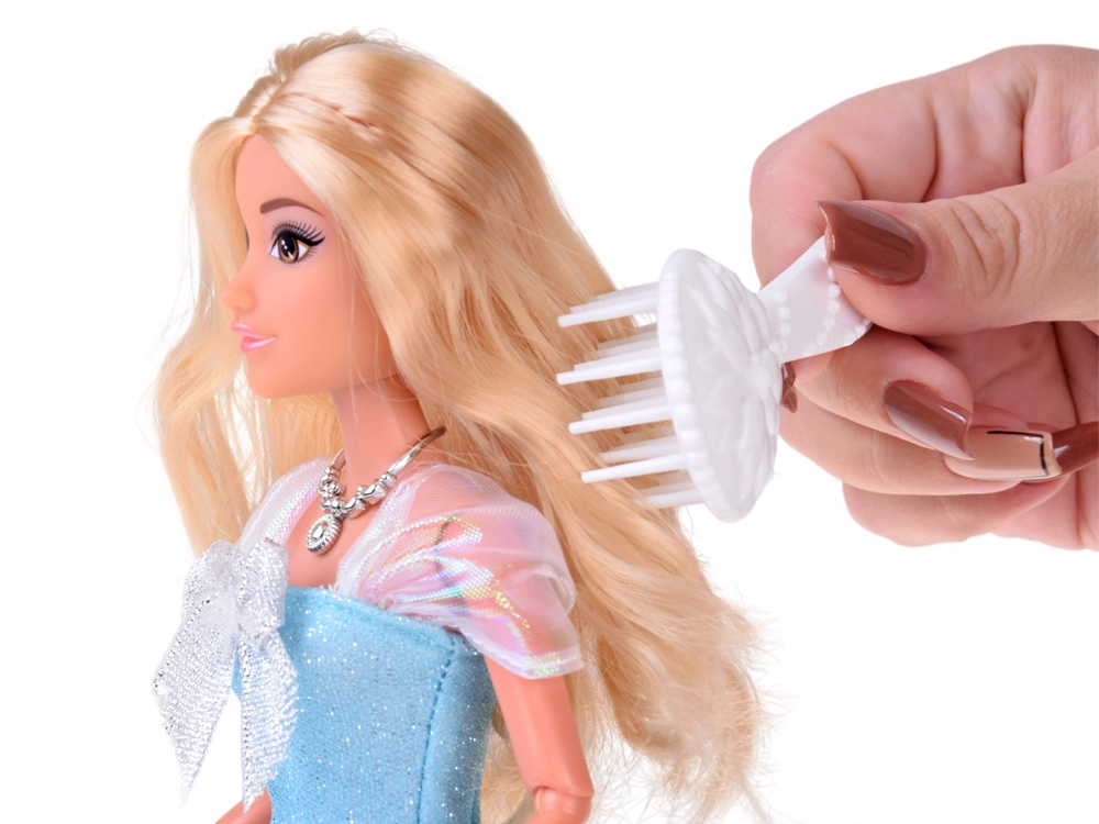 Părul blond lung poate fi pieptănat cu peria inclusă – împletiți codițe și creați coafuri regale.