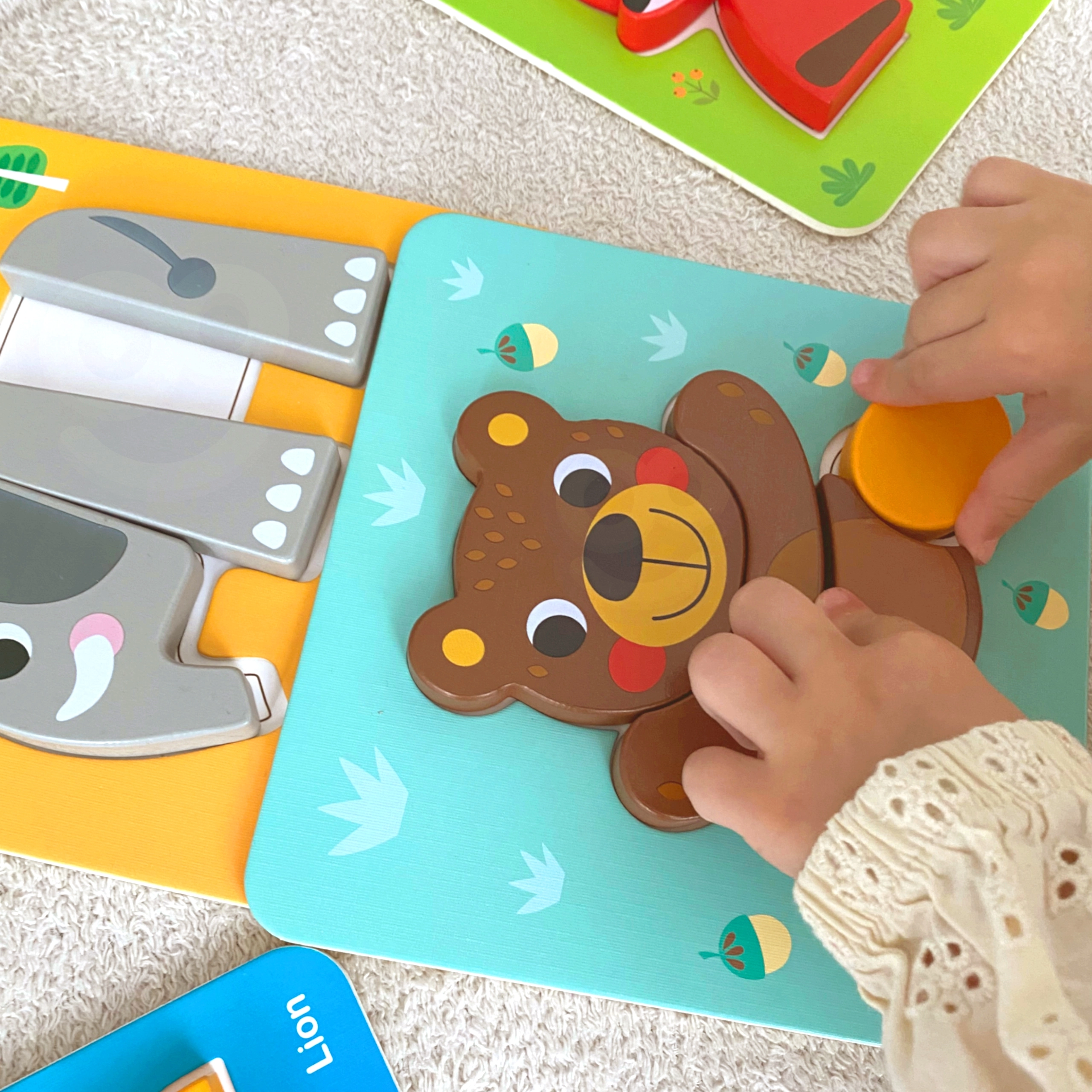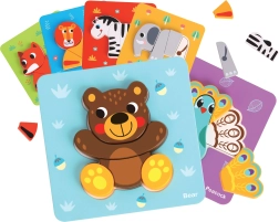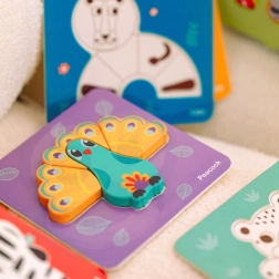 Acest set Montessori oferă copiilor de la 12 luni o joacă sigură și captivantă. Piesele groase din lemn, culorile vii și cardurile tematice cu animale invită la asamblare și la descoperire repetată. Fiecare formă se potrivește perfect în contururile frezate, facilitând concentrarea și întărind coordonarea mână–ochi.