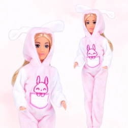 - salopete roz de iepuraș cu glugă și urechi, moi/pufoase la atingere