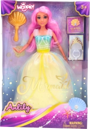 Păpușa Woopie Lili – prințesa oceanului aduce copiilor lumea poveștilor inspirată de regatul subacvatic. Părul ei lung roz este perfect pentru pieptănat și styling, iar rochia pastelată sclipitoare cu accente marine îi subliniază ținuta regală.