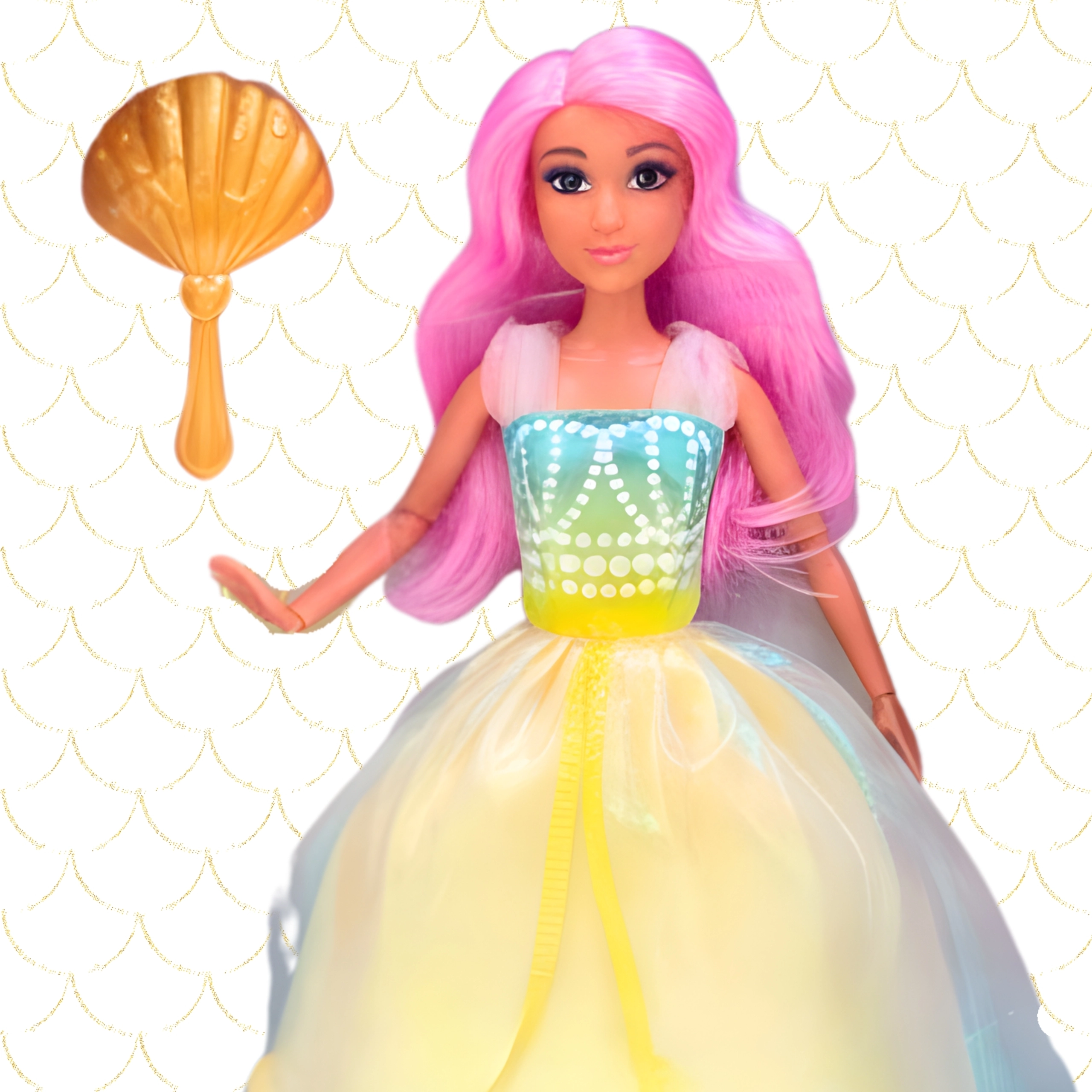 Setul include un pieptene auriu în formă de scoică și un inel elegant, care completează stilul și susțin jocul de rol. Păpușa este excelentă pentru copii de la 3 ani și ajută la dezvoltarea motricității fine, a imaginației și a poveștirii.