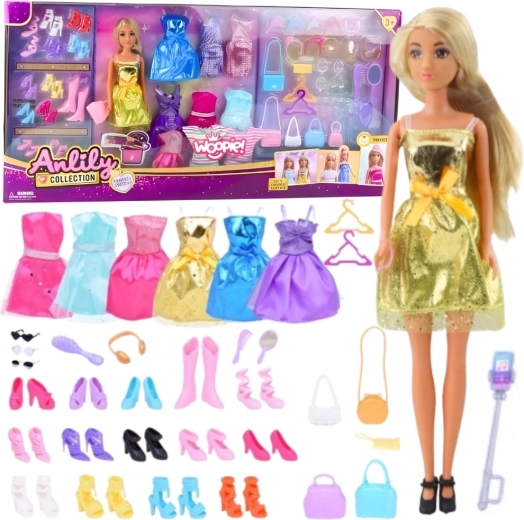 - Păpușa Lili în rochie aurie, 8 rochii suplimentare (în total 9), 13 perechi de pantofi, 6 genți, ochelari de soare, perii pentru păr, bentițe și decorațiuni, umerașe colorate, ambalaj cadou