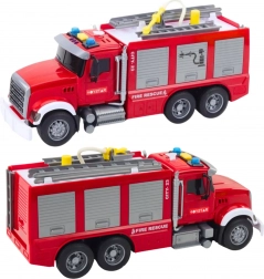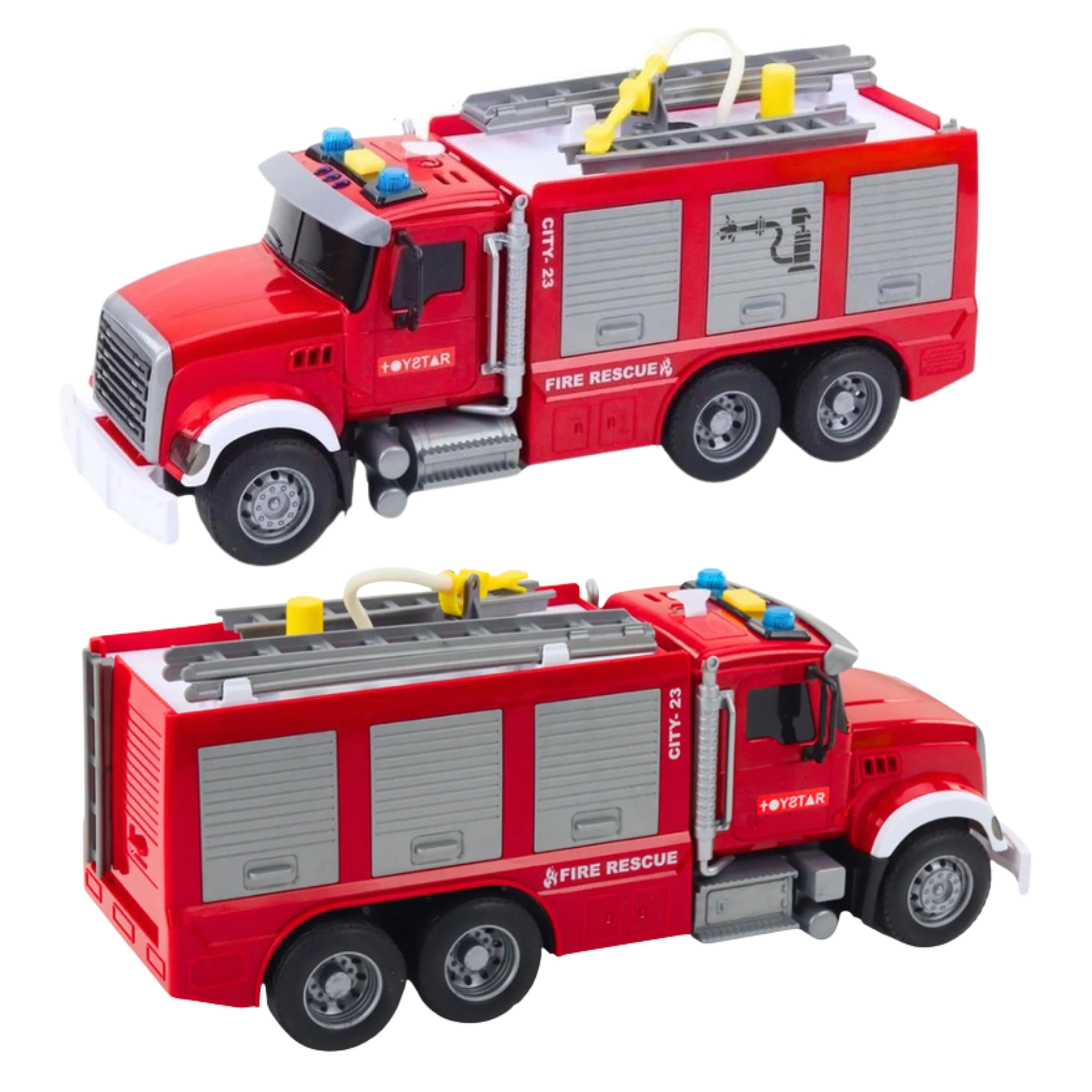 - Camion de pompieri cu pulverizare de apă, rezervor de apă, furtun flexibil cu duză, buton/pompă pentru pompare, butoane interactive pentru lumini și sunete