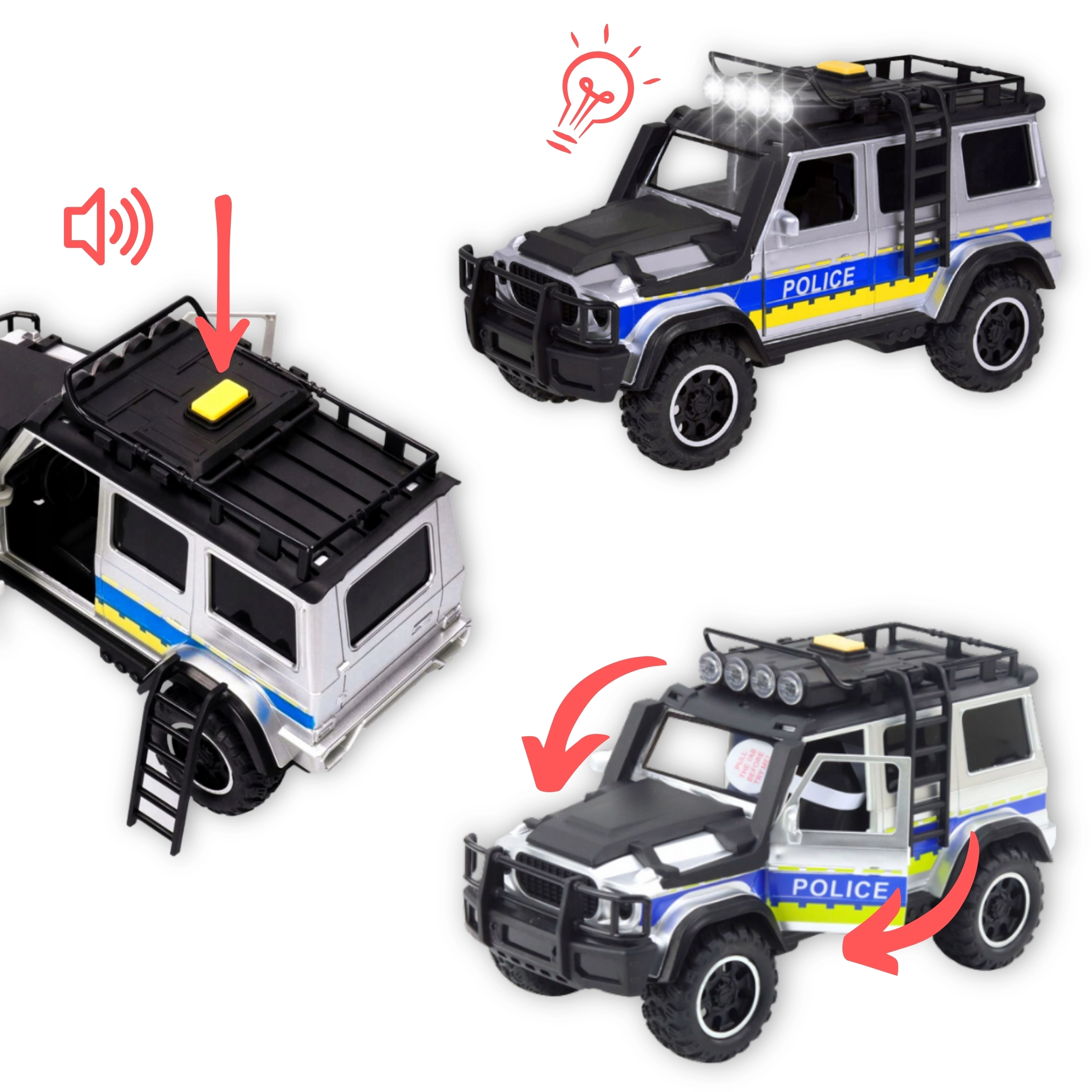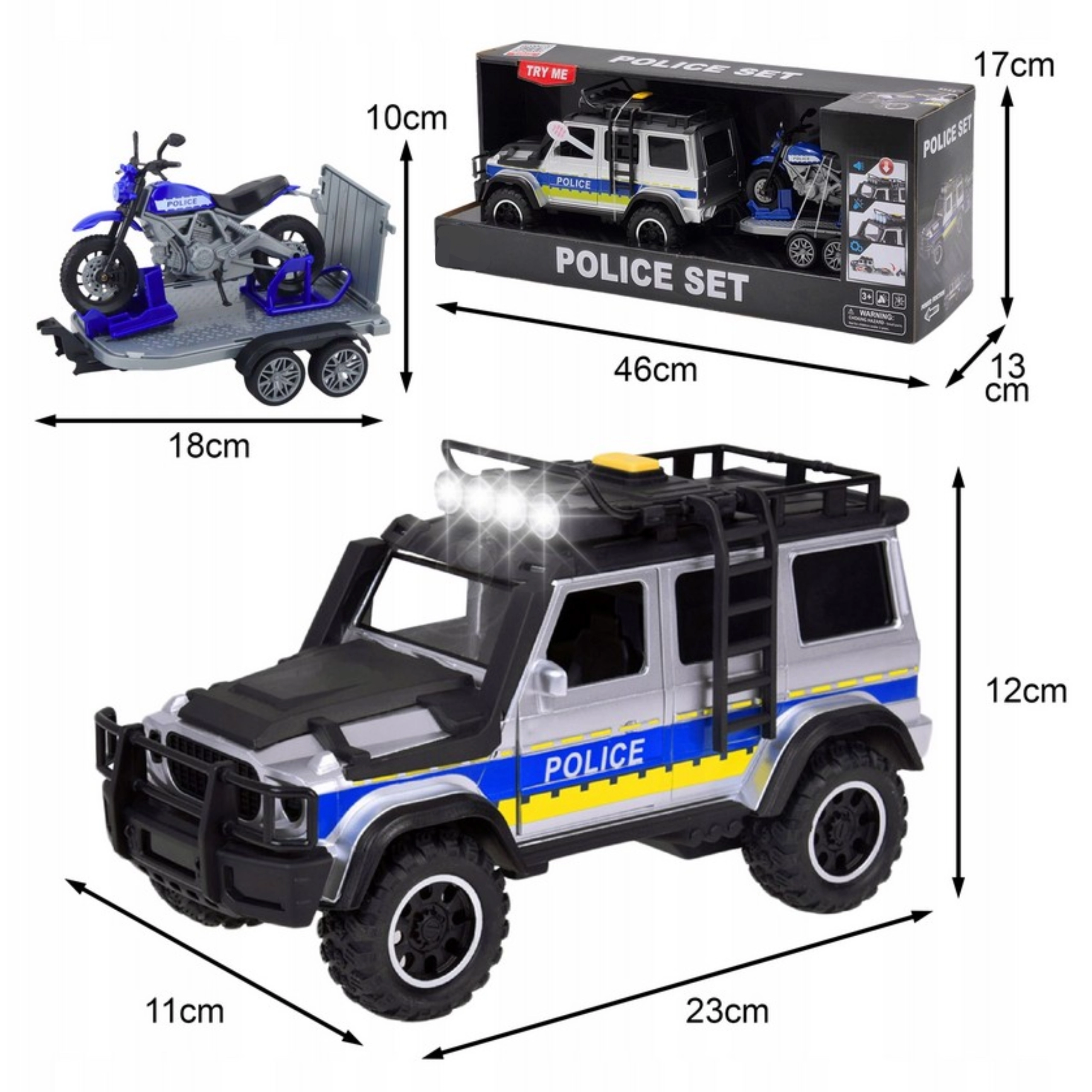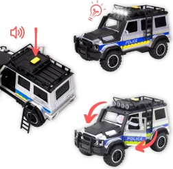 Setul de poliție WOOPIE îmbină o construcție durabilă cu funcții bogate care stimulează imaginația copiilor. Vehiculul off-road mare cu efecte luminoase și sonore redă fidel acțiunea pe teren, în timp ce remorca cu motocicletă permite intervenții rapide chiar și în zone greu accesibile. Ușile care se deschid și motocicleta mobilă sporesc interactivitatea și realismul jocului.