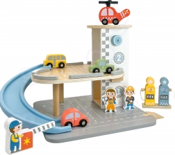 - Parcare pe două niveluri, pompă de alimentare, rampă albastră în spirală, 3 mașinuțe din lemn, 1 elicopter cu elice rotativă, 3 figurine de muncitori, 2 rampe mici