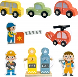 Sunt incluse mașinuțe colorate din lemn, elicopter cu elice rotativă, figurine de muncitori și accesorii pentru joacă realistă.