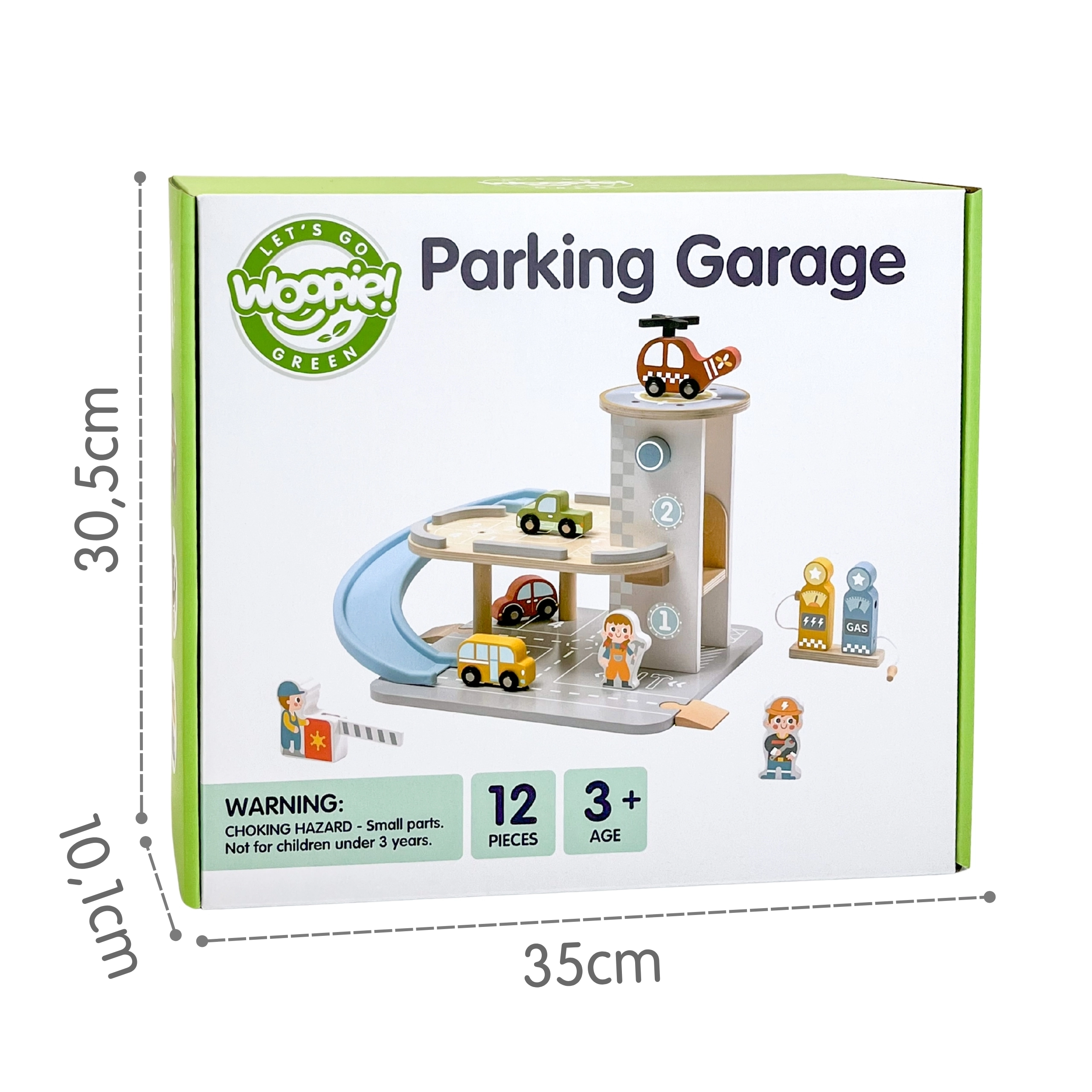 Descoperă lumea creativă a transportului cu parcarea din lemn WOOPIE GREEN. Acest set pe mai multe niveluri oferă o rampă în spirală, heliport cu elicopter, mașinuțe colorate și figurine de muncitori pentru o joacă imaginativă fără sfârșit. Datorită construcției stabile din lemn în culori pastelate, este sigur, durabil și arată grozav în camera copilului.